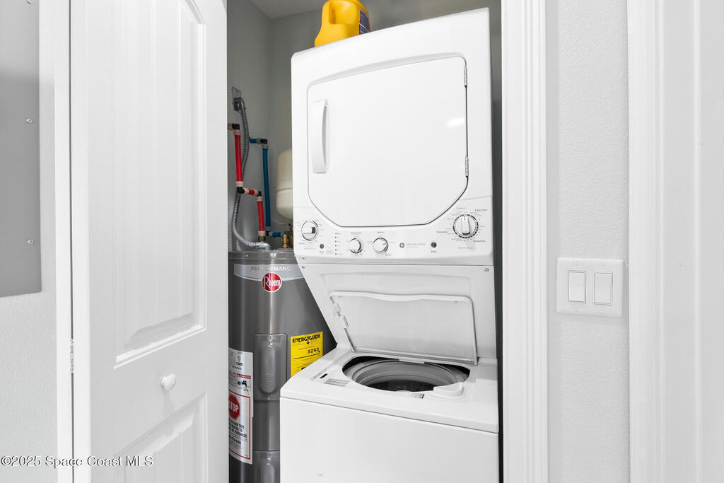 Dishwasher, Electric Range, Refrigerator, Washer/Dryer Stacked
