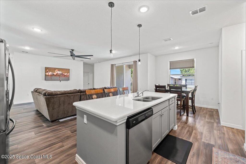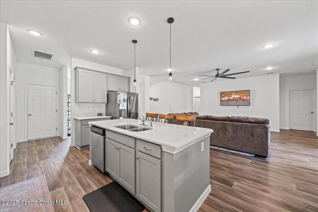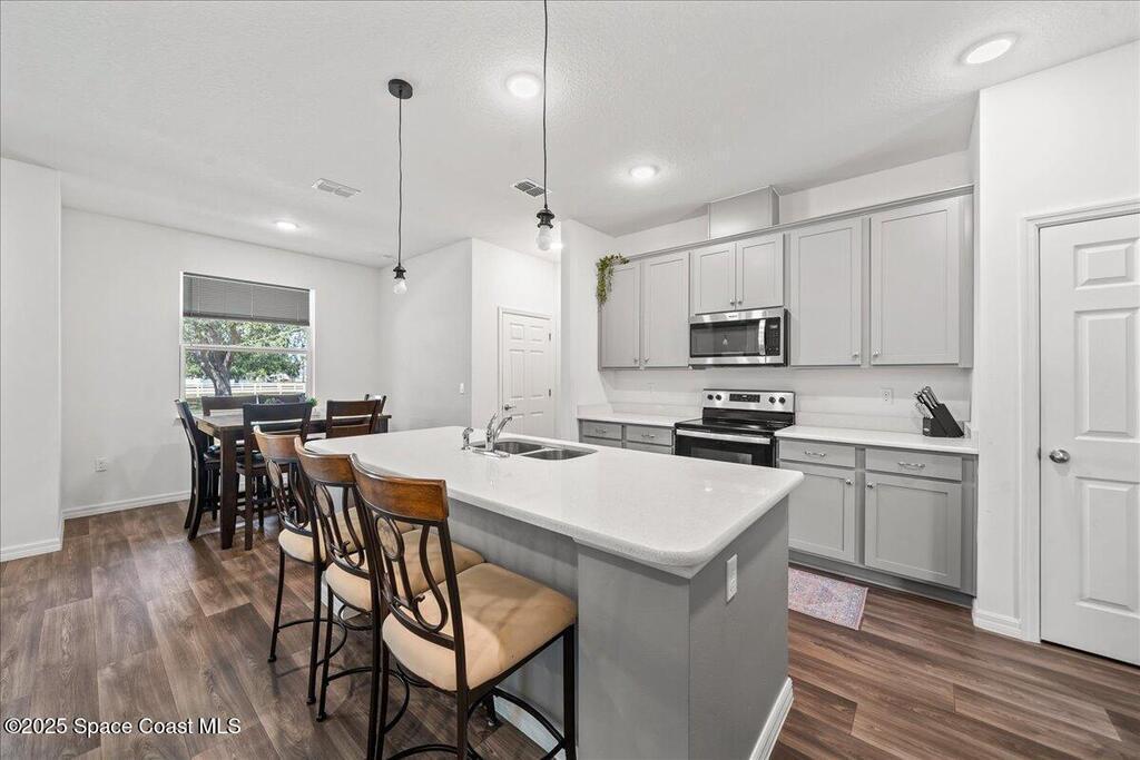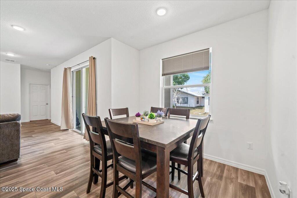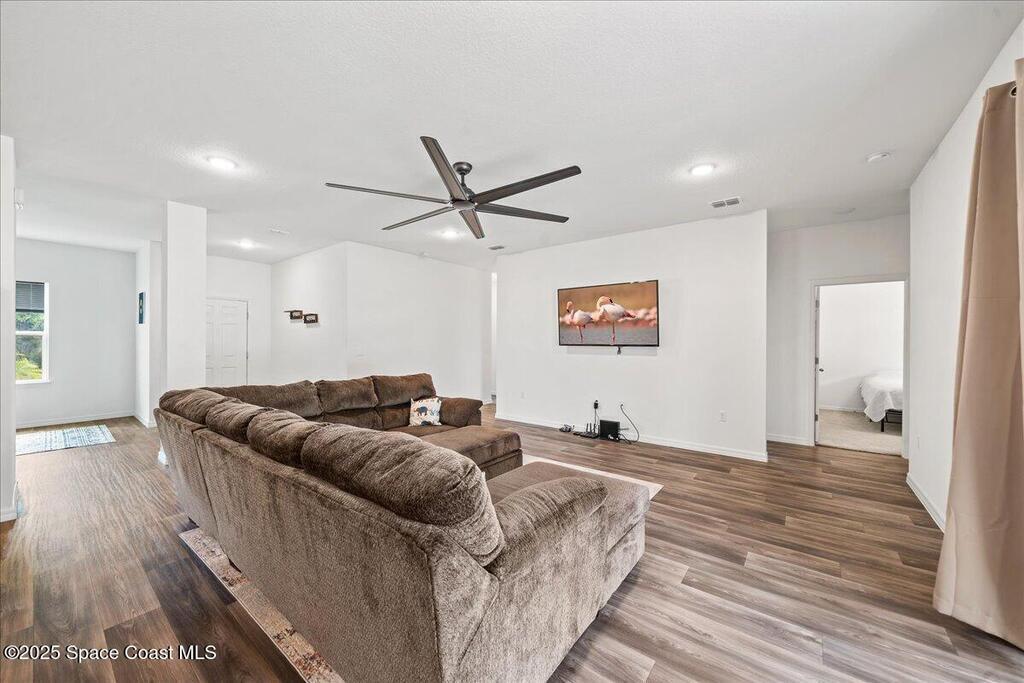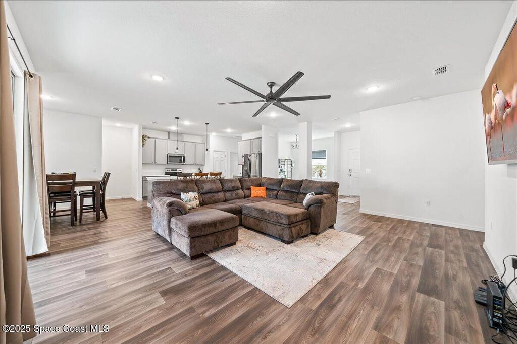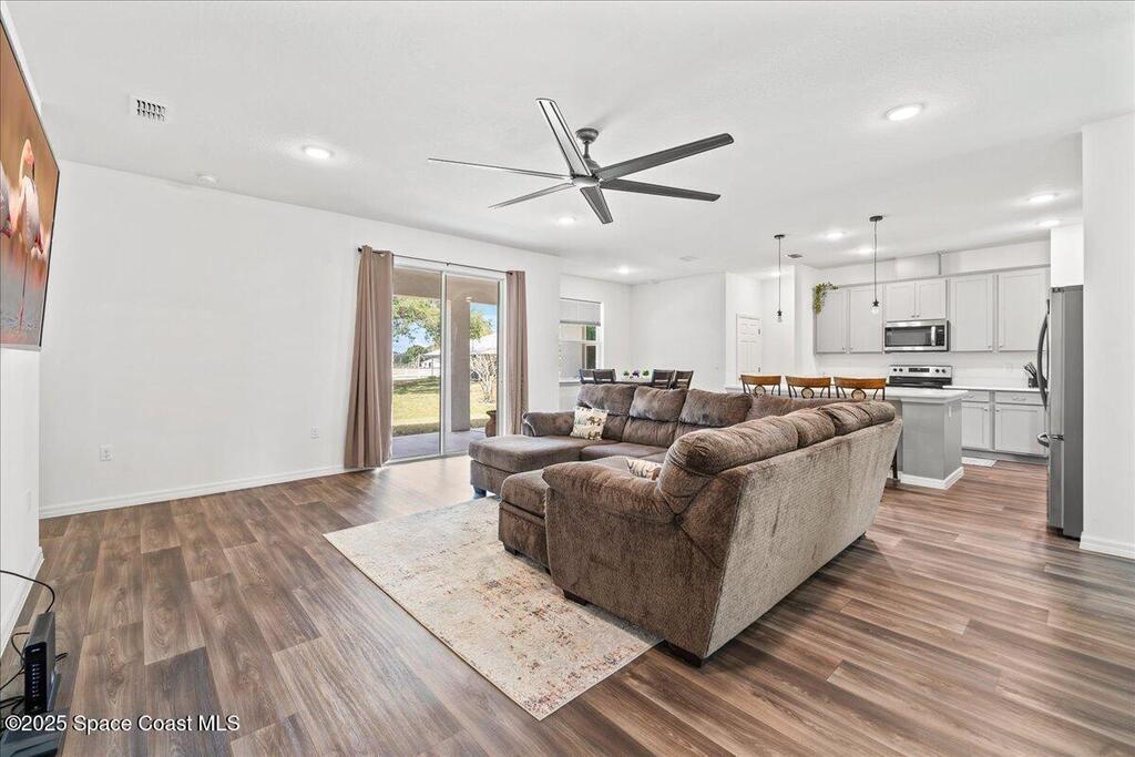 This Expansive, LIKE NEW, 5 bed, 3 Bath, CBC home won't disappoint! Open floorplan with 9' ceilings! Rich vinyl plank flooring & LED recessed lighting. A modern kitchen overlooks a 17X20 Great Rom w/ separate Dining/Flex room & boasts an oversized island w/ quartz countertops, pendant lighting, SS appliances, 42'' cabinets, French door refrigerator & breakfast nook for enjoying your morning cup of coffee. The large owner's suite includes double raised vanities, walk-in shower & jumbo walk-in closet. The 4 guest bedrooms share 2 full bathrooms on the opposite end of this home. Unwind while relaxing on the 20' long covered patio and watch the sun go down. 15 SEER HVAC, Digital programmable thermostat, R-30 attic insulation, hurricane panels, dual pane windows & built in 2022! Just minutes from restaurants, shopping, parks, golf courses and sun kissed beaches! Don't miss this one!
