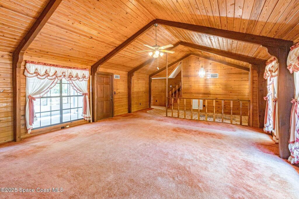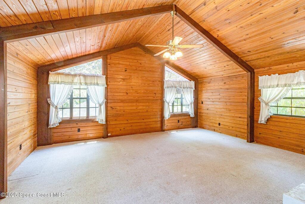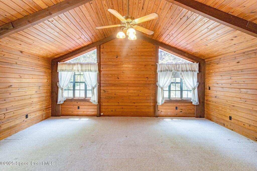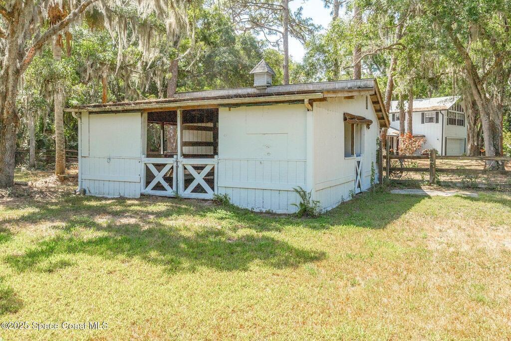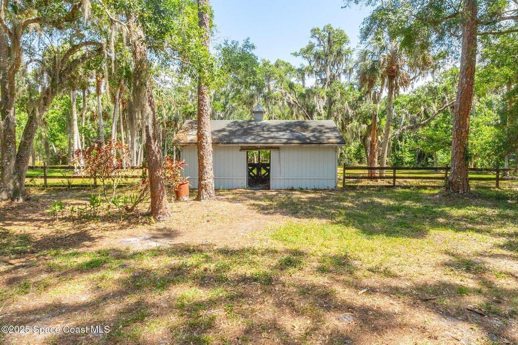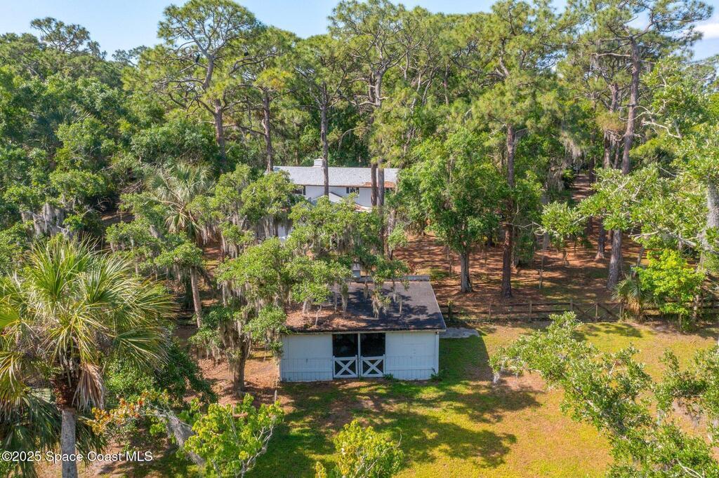 New Price for this 3 acre property with 2 stall barn and fenced pasture for horses and beautifully wooded lot on north Merritt Island. You will enjoy the peace and quiet. This flag lot property boasts spacious 3 bedroom 2.5 bath home with 2 car garage. Large downstairs living area with vaulted ceilings, fireplace with oak wood walls and high beams make you feel you truly are living in the woods. Kitchen features oak cabinets with granite countertops. Den/office off the kitchen could function as 4th bedroom. Interior laundry. Upstairs master has large windows for lots of light and a fireplace for those cool nights. Large screen porch looks out to the horse pasture. 2 stall horse barn with electric and fans. Large fenced pasture. Roof approximately 3 years old, water heater 4 and septic replaced in 2007. Stop and see this property today!!