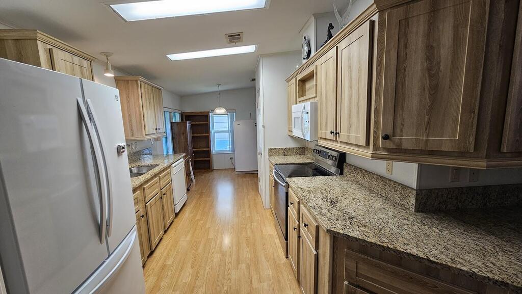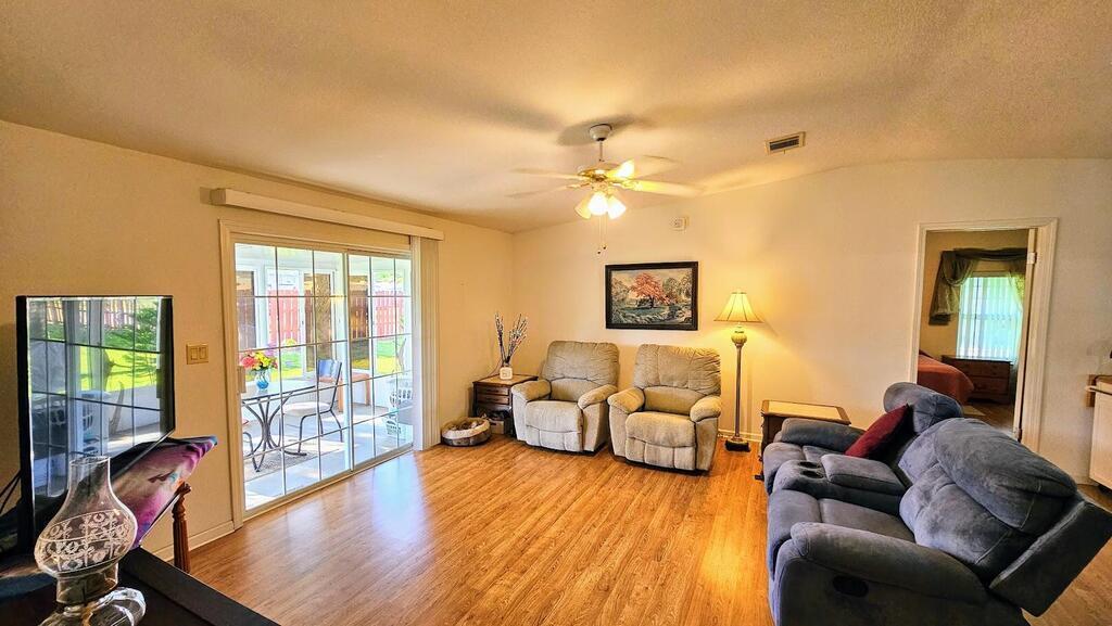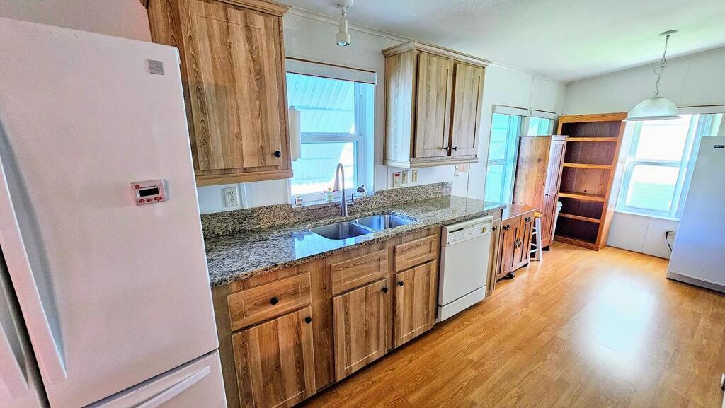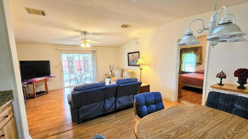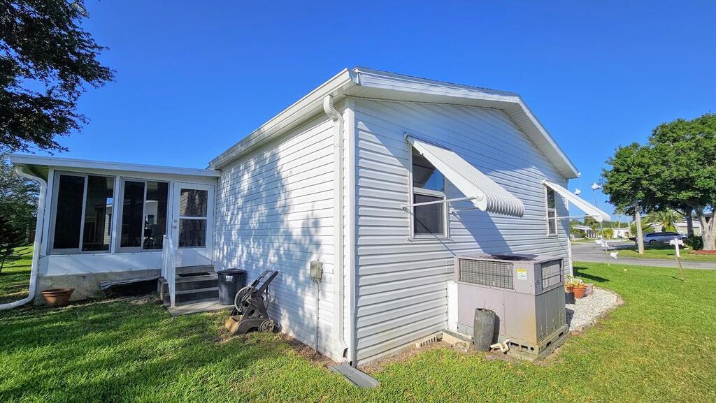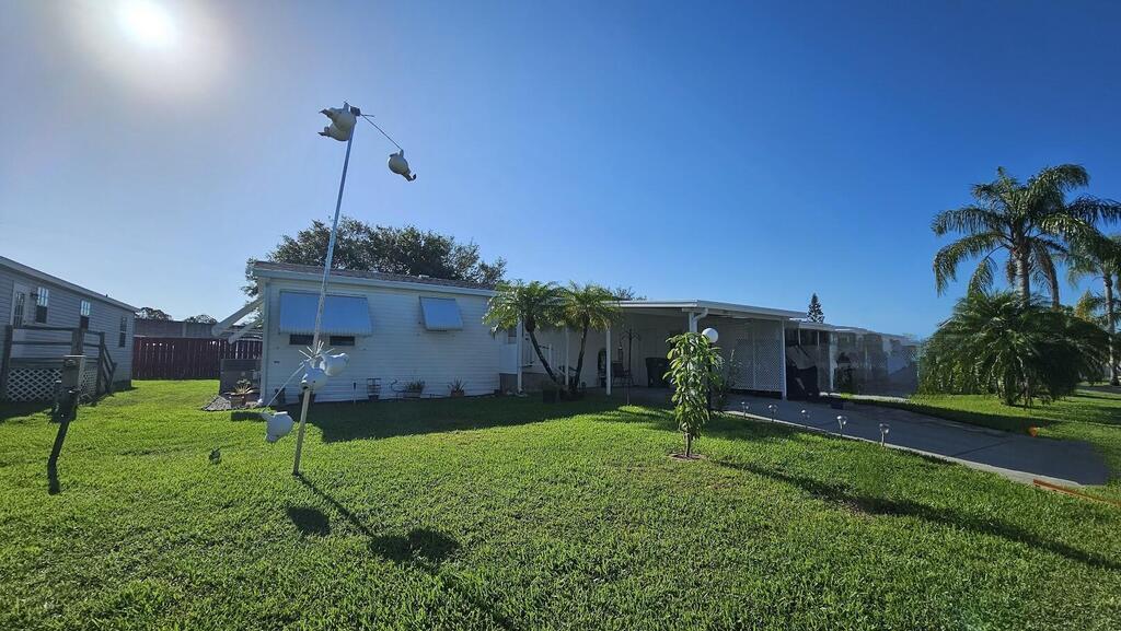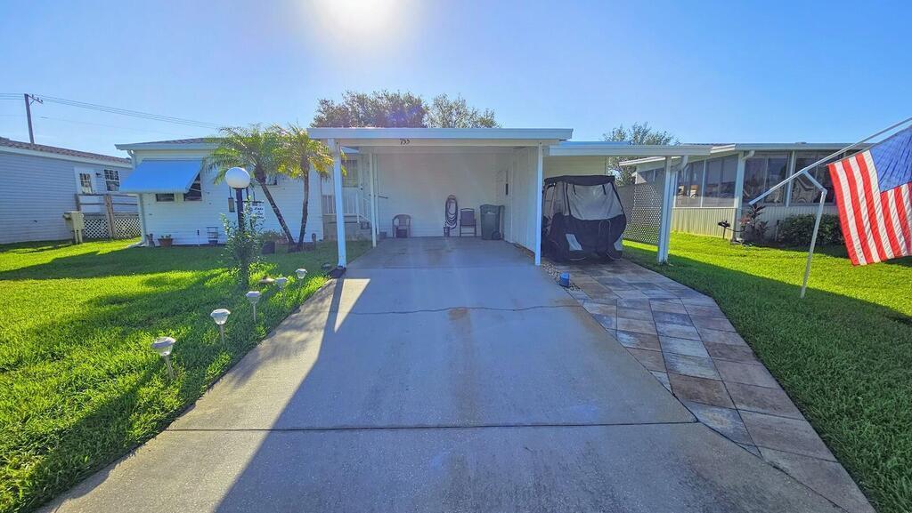 Feel at home on your First Day. This senior community where you own the land has many activities to enjoy. This 2/2 home has newer roof, granite counter in the kitchen, all new flooring and is move in ready.Complete with hurricane shutters and a charming back yard or sit on the patio with a glass of iced tea.You can see rocket launches from home and see beautiful sunsets at night. Hoa dues are low and they include cable, internet, and lawncare. Park your RV.or Boat for free.