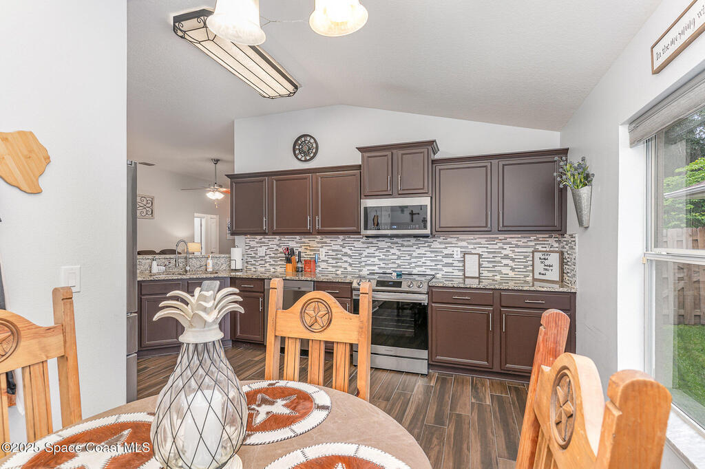 Breakfast Bar, Breakfast Nook, Ceiling Fan(s), Eat-in Kitchen, Entrance Foyer, His and Hers Closets, Open Floorplan, Primary Bathroom -Tub with Separate Shower, Primary Downstairs, Split Bedrooms, Vaulted Ceiling(s), Walk-In Closet(s)