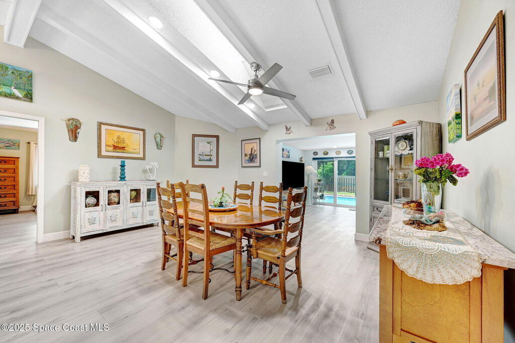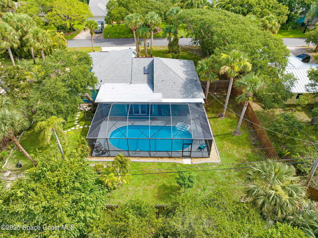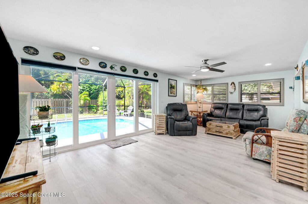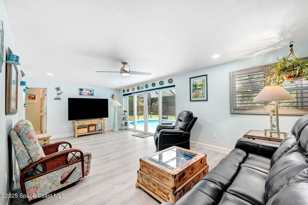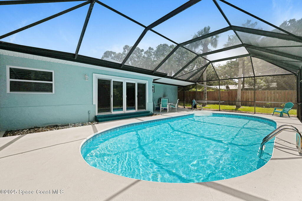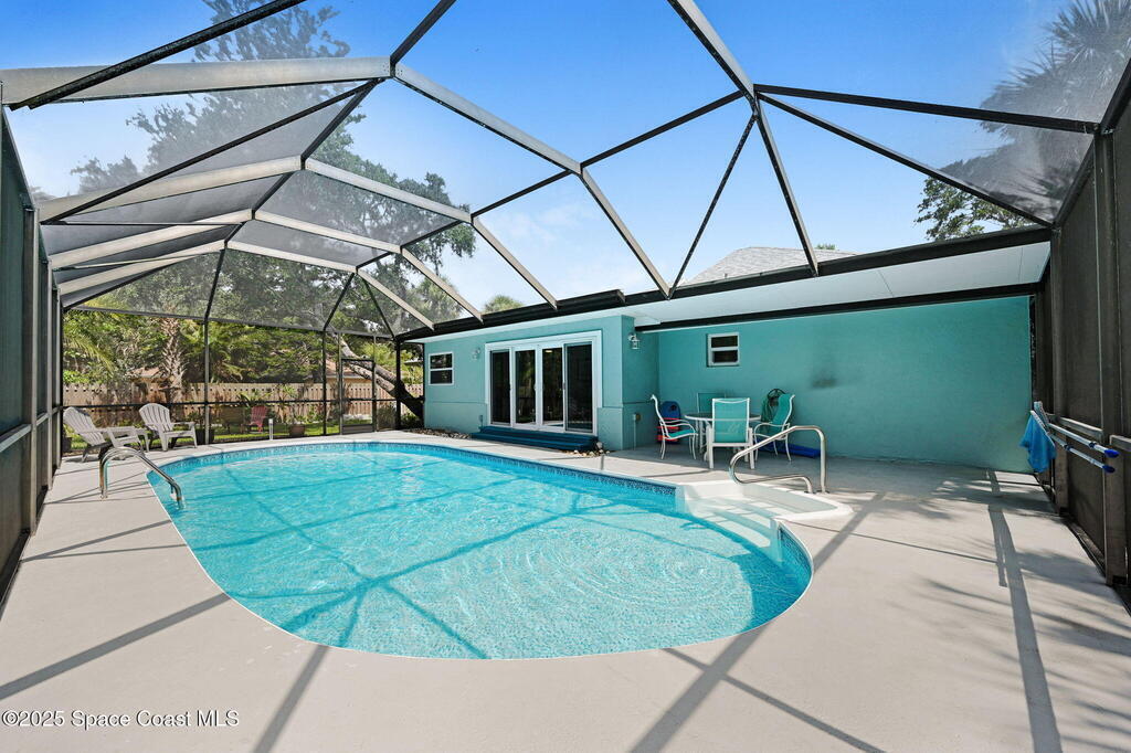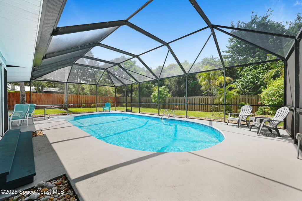 This updated Melbourne Shores home has 3 bedrooms, 2 full bathrooms, bonus room, open floor plan, updated kitchen, dining area, living area with screened pool views. Primary bedroom is spacious with en-suite bath. Impact windows and sliders, three-car garage, extra parking for boat/RV. Community offers private ocean to river access. Recent updates include A/C (2020), electric panel (2021), soffit and fascia (2022). Feature list for more details.