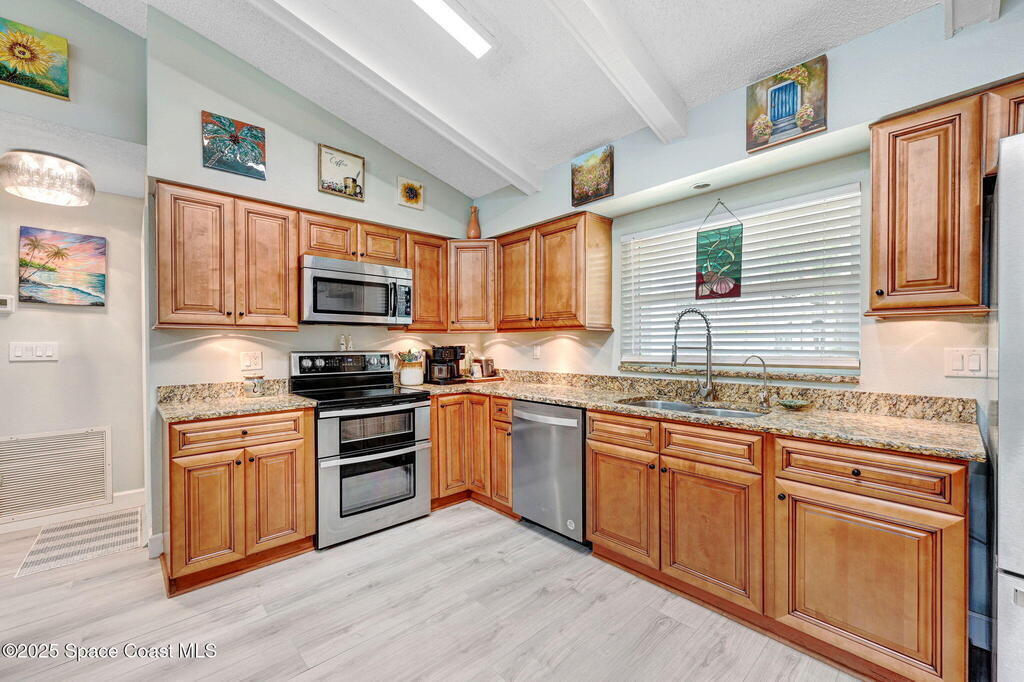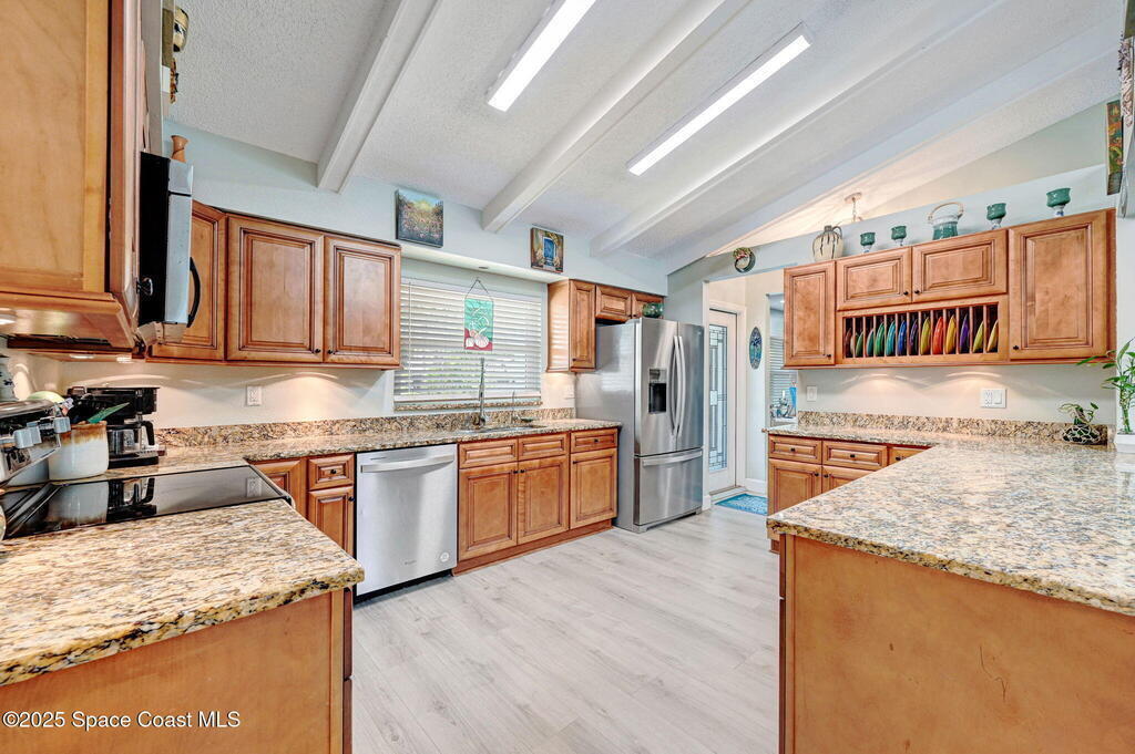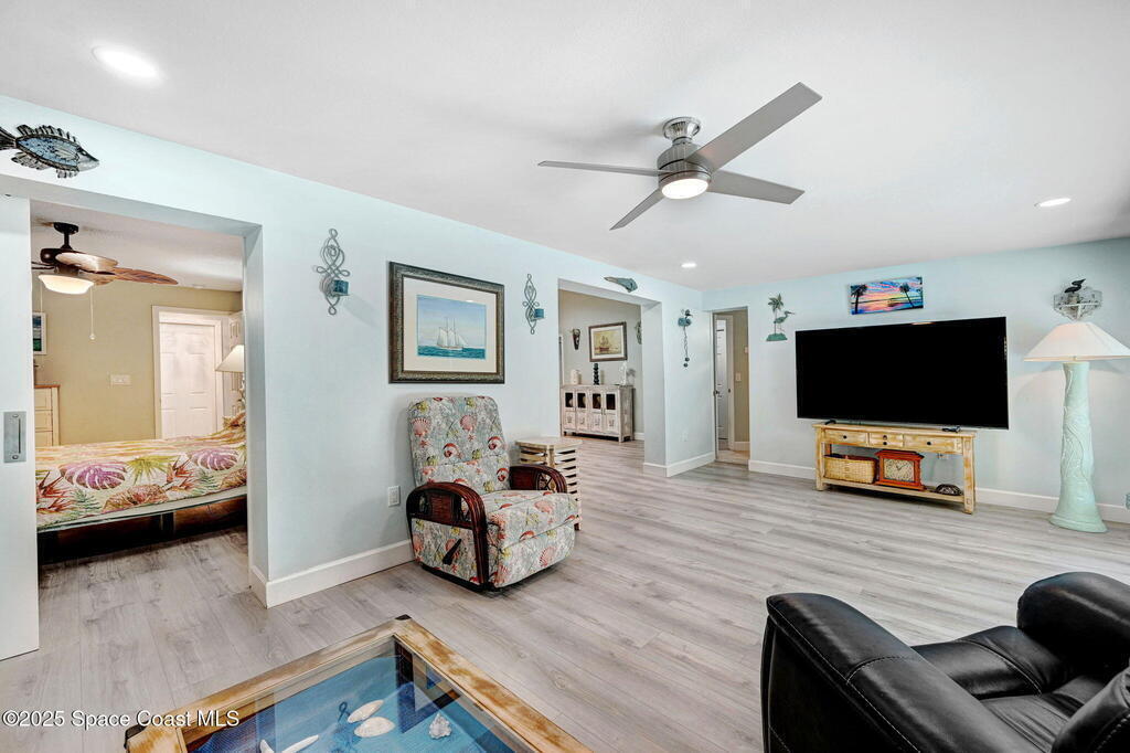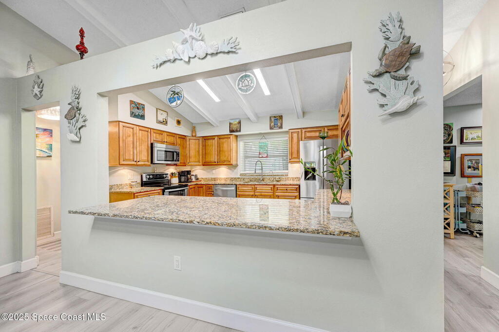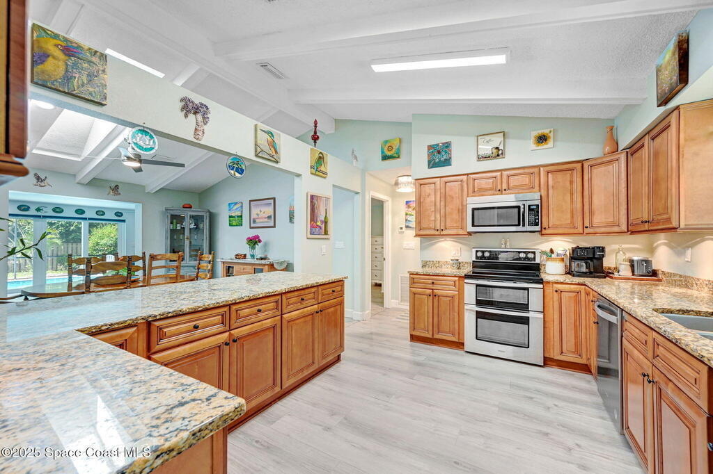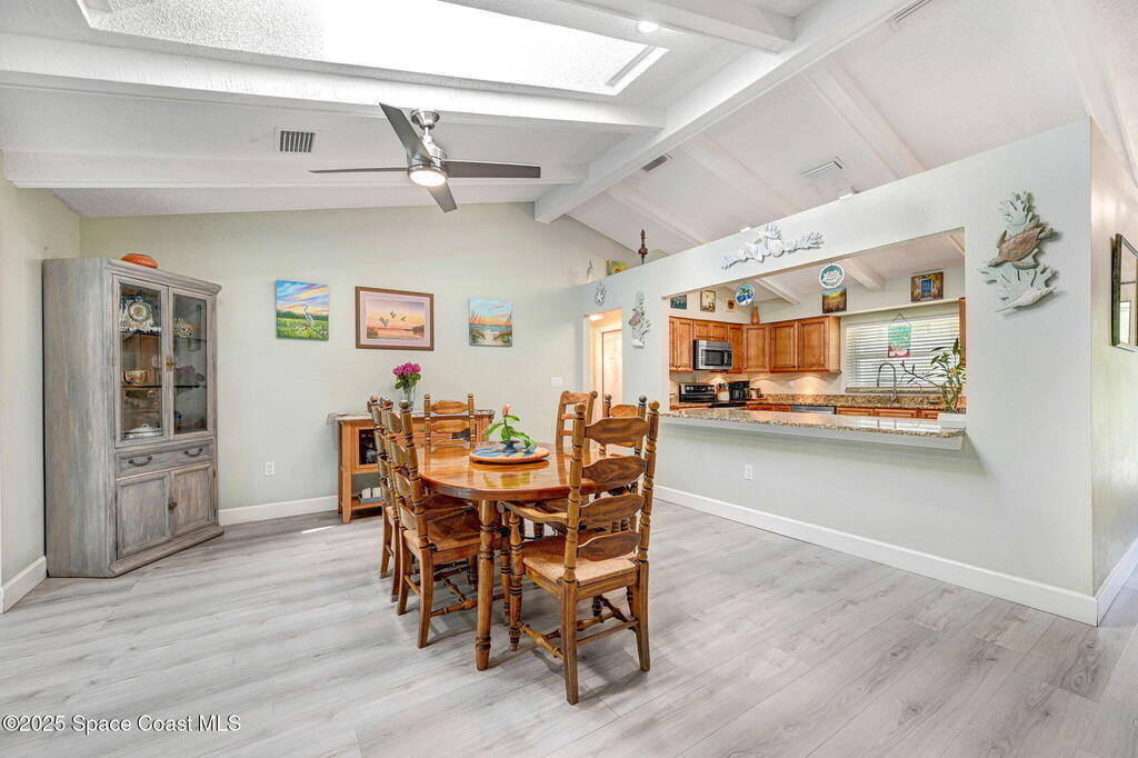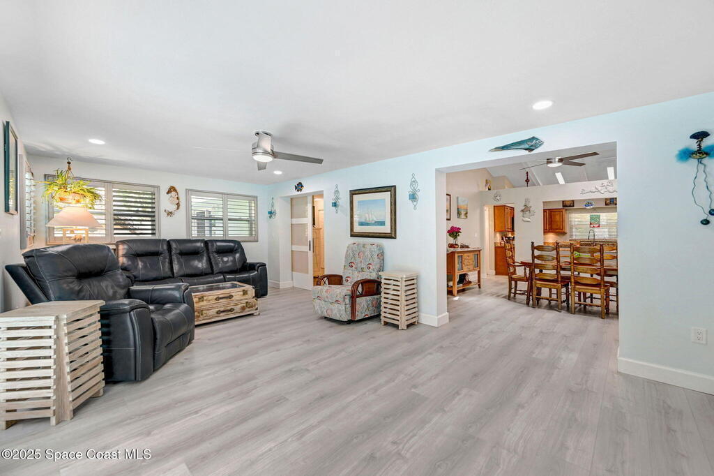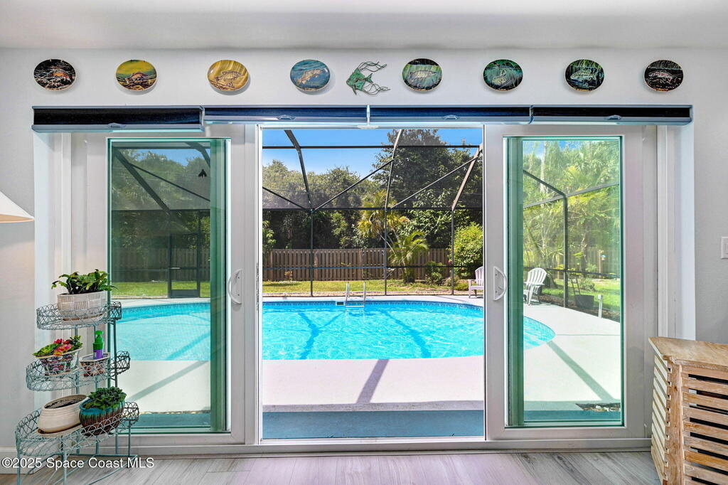 This updated Melbourne Shores home has 3 bedrooms, 2 full bathrooms, bonus room, open floor plan, updated kitchen, dining area, living area with screened pool views. Primary bedroom is spacious with en-suite bath. Impact windows and sliders, three-car garage, extra parking for boat/RV. Community offers private ocean to river access. Recent updates include A/C (2020), electric panel (2021), soffit and fascia (2022). Feature list for more details.