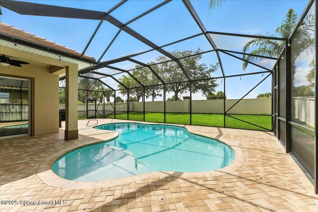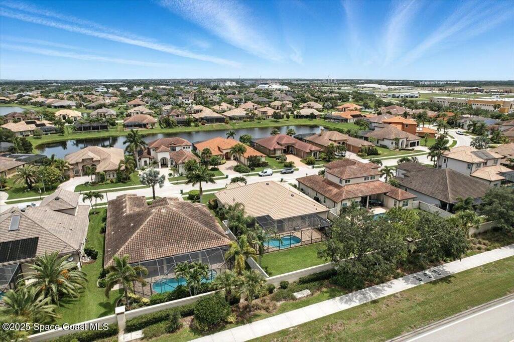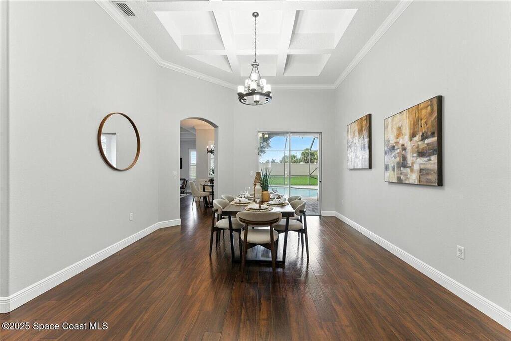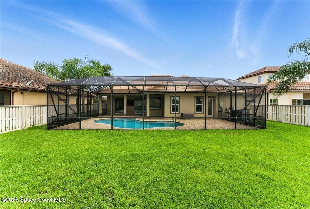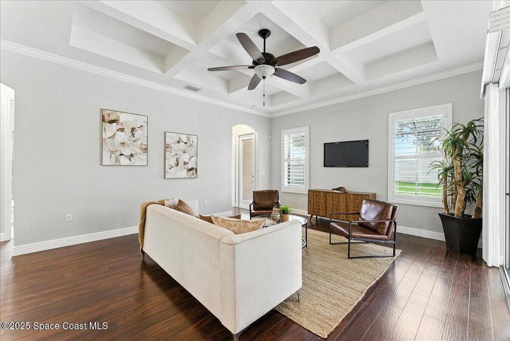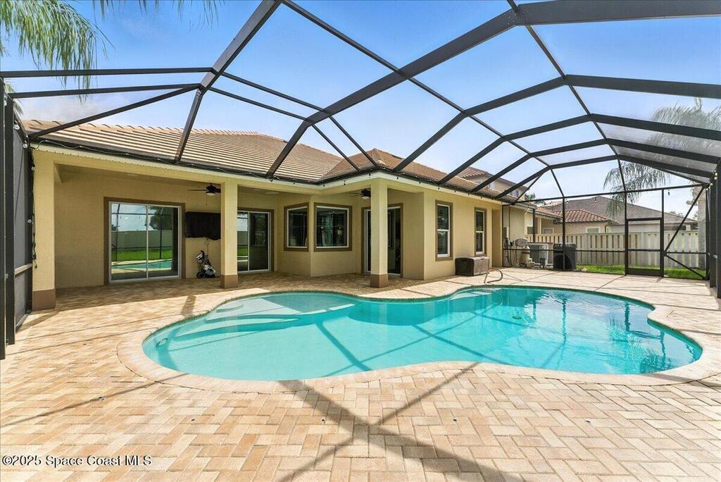 Welcome to this beautifully maintained and thoughtfully upgraded executive pool home in the coveted gated community of Levanto, Viera, where family-friendly living meets refined Florida luxury. From its timeless finishes to its extensive list of updates, this pool home reflects meticulous care, offering five spacious bedrooms, three full baths and a three car garage. Step into the foyer to discover soaring coffered ceilings, abundant natural light, and a flowing, airy layout that immediately feels like home. A flexible front room with French doors can serve as an office, den, or fifth bedroom, while the primary suite feels like a spa-inspired retreat, complete with a tray ceiling, serene pool views, and a spacious ensuite bathroom featuring an oversized walk-in shower, soaking tub, and two walk-in closets with custom storage systems.