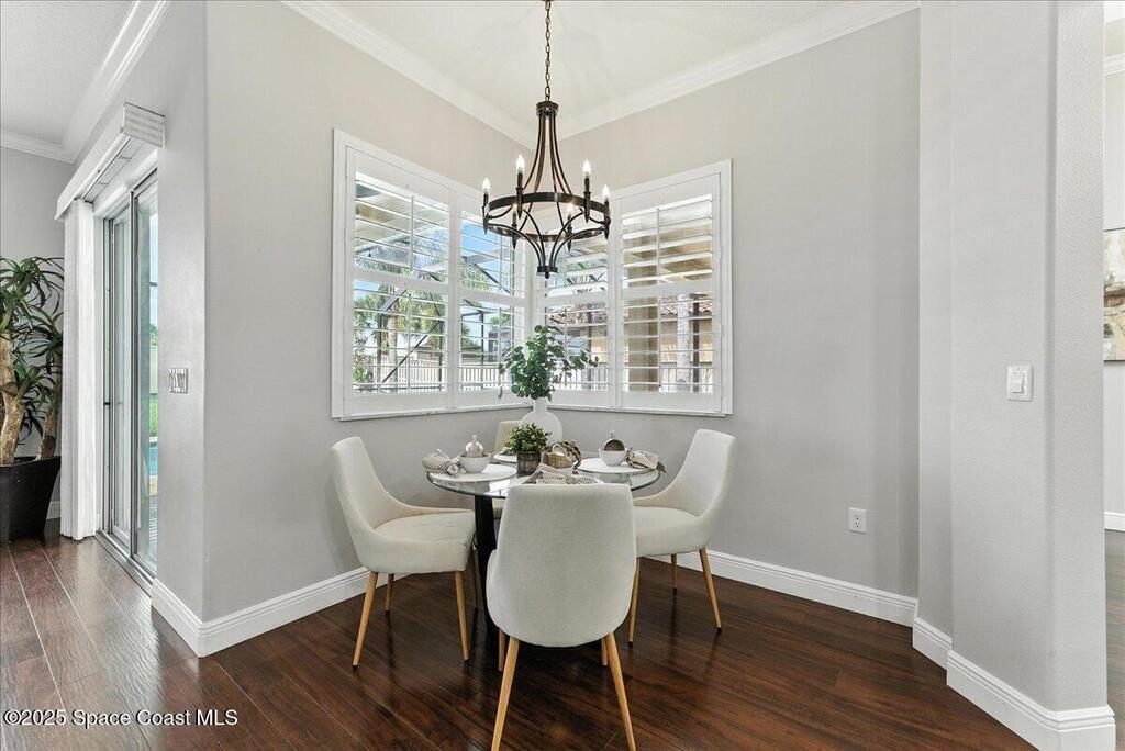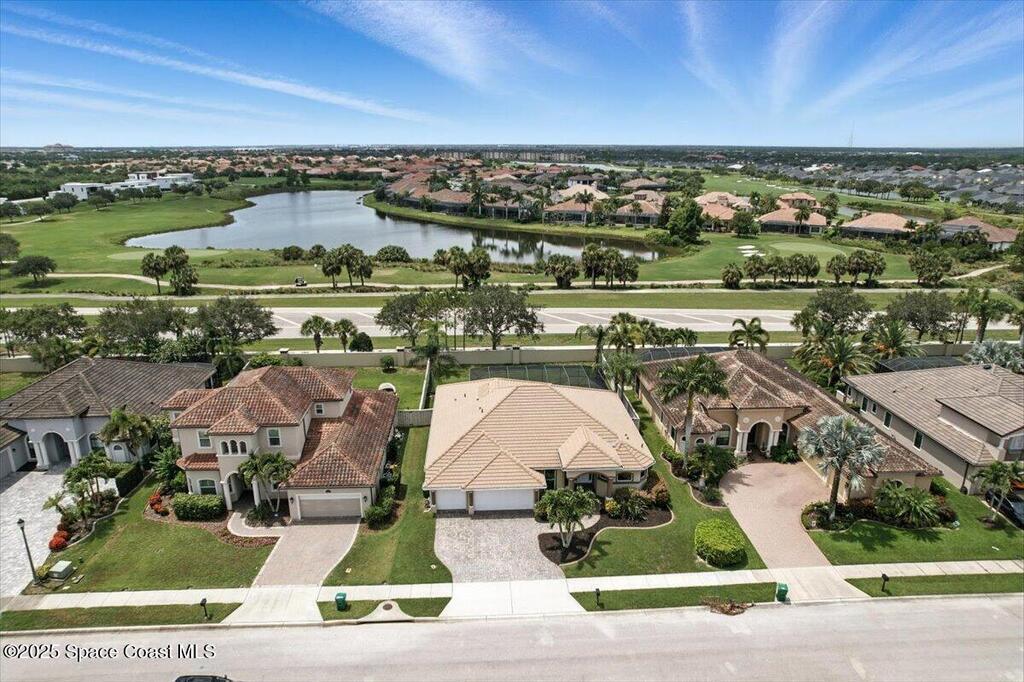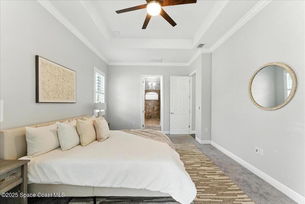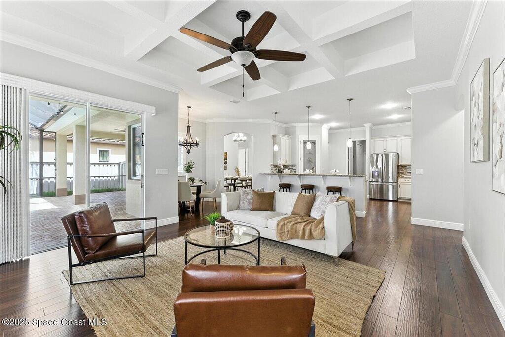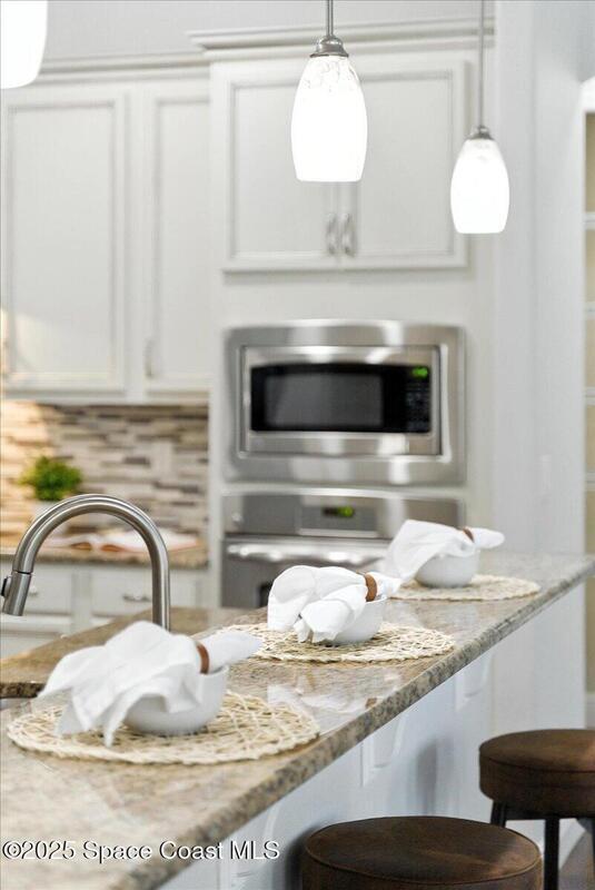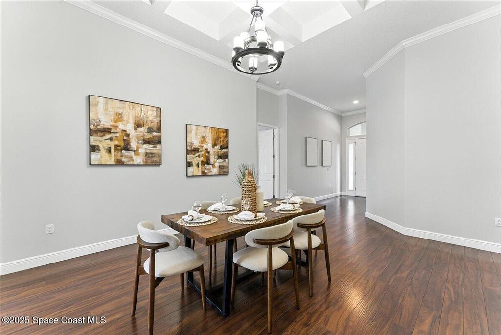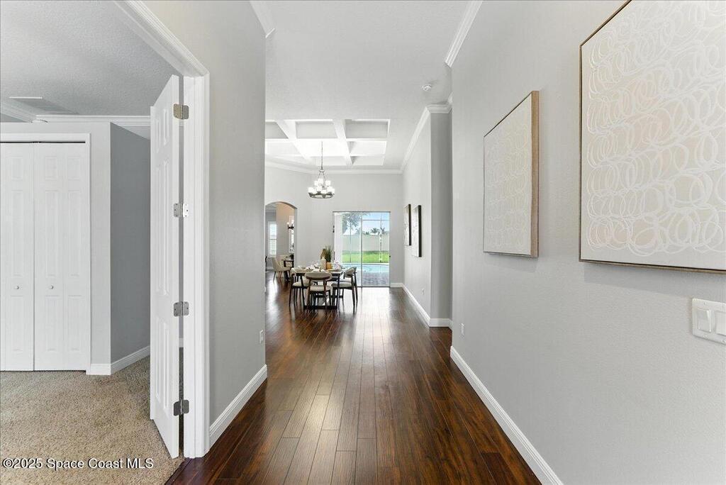 Welcome to this beautifully maintained and thoughtfully upgraded executive pool home in the coveted gated community of Levanto, Viera, where family-friendly living meets refined Florida luxury. From its timeless finishes to its extensive list of updates, this pool home reflects meticulous care, offering five spacious bedrooms, three full baths and a three car garage. Step into the foyer to discover soaring coffered ceilings, abundant natural light, and a flowing, airy layout that immediately feels like home. A flexible front room with French doors can serve as an office, den, or fifth bedroom, while the primary suite feels like a spa-inspired retreat, complete with a tray ceiling, serene pool views, and a spacious ensuite bathroom featuring an oversized walk-in shower, soaking tub, and two walk-in closets with custom storage systems.