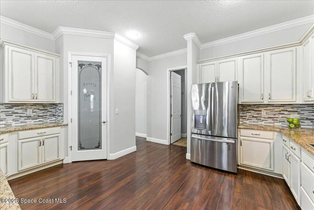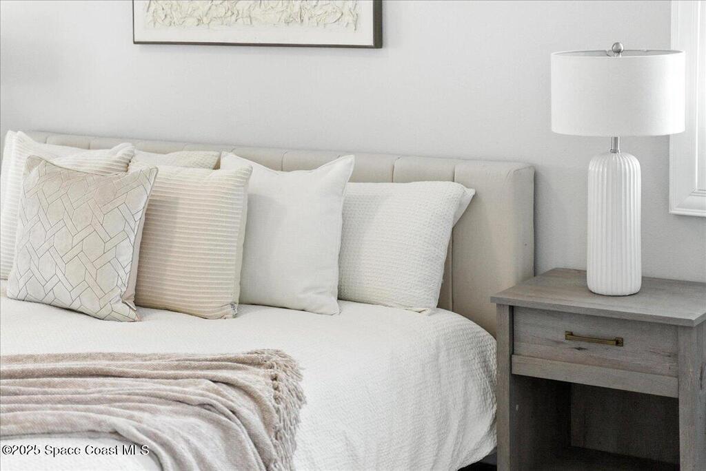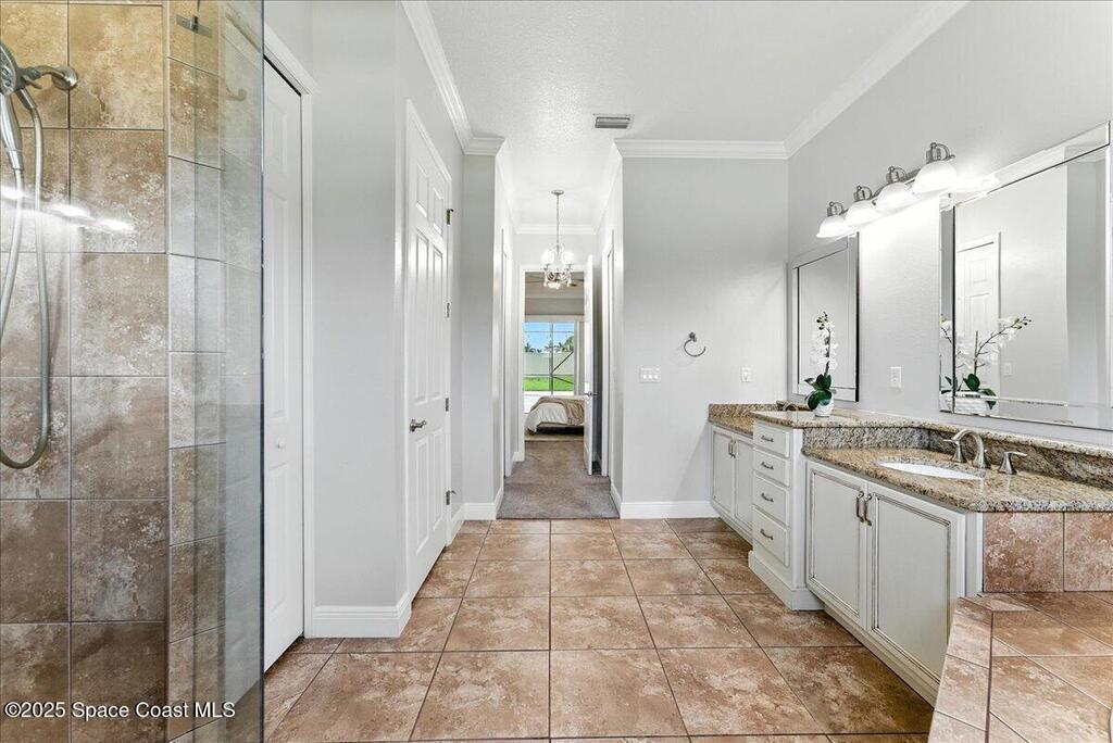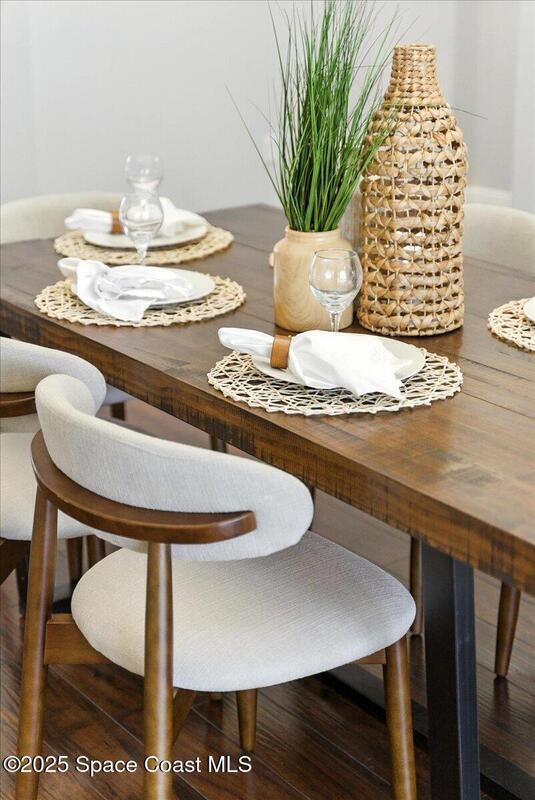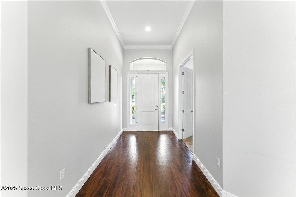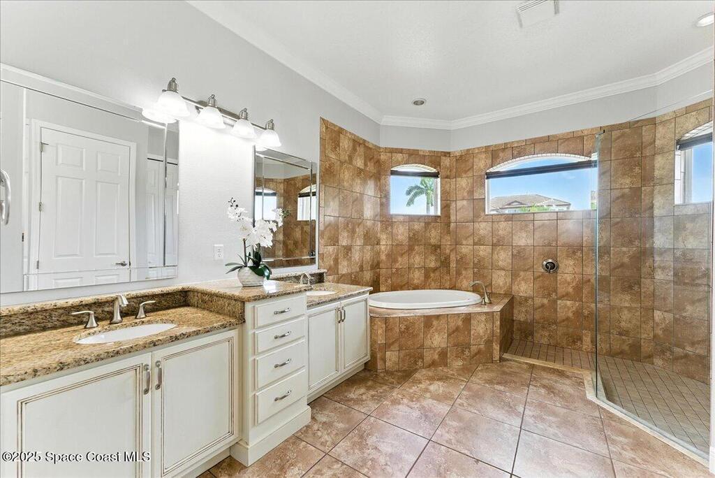 Welcome to this beautifully maintained and thoughtfully upgraded executive pool home in the coveted gated community of Levanto, Viera, where family-friendly living meets refined Florida luxury. From its timeless finishes to its extensive list of updates, this pool home reflects meticulous care, offering five spacious bedrooms, three full baths and a three car garage. Step into the foyer to discover soaring coffered ceilings, abundant natural light, and a flowing, airy layout that immediately feels like home. A flexible front room with French doors can serve as an office, den, or fifth bedroom, while the primary suite feels like a spa-inspired retreat, complete with a tray ceiling, serene pool views, and a spacious ensuite bathroom featuring an oversized walk-in shower, soaking tub, and two walk-in closets with custom storage systems.