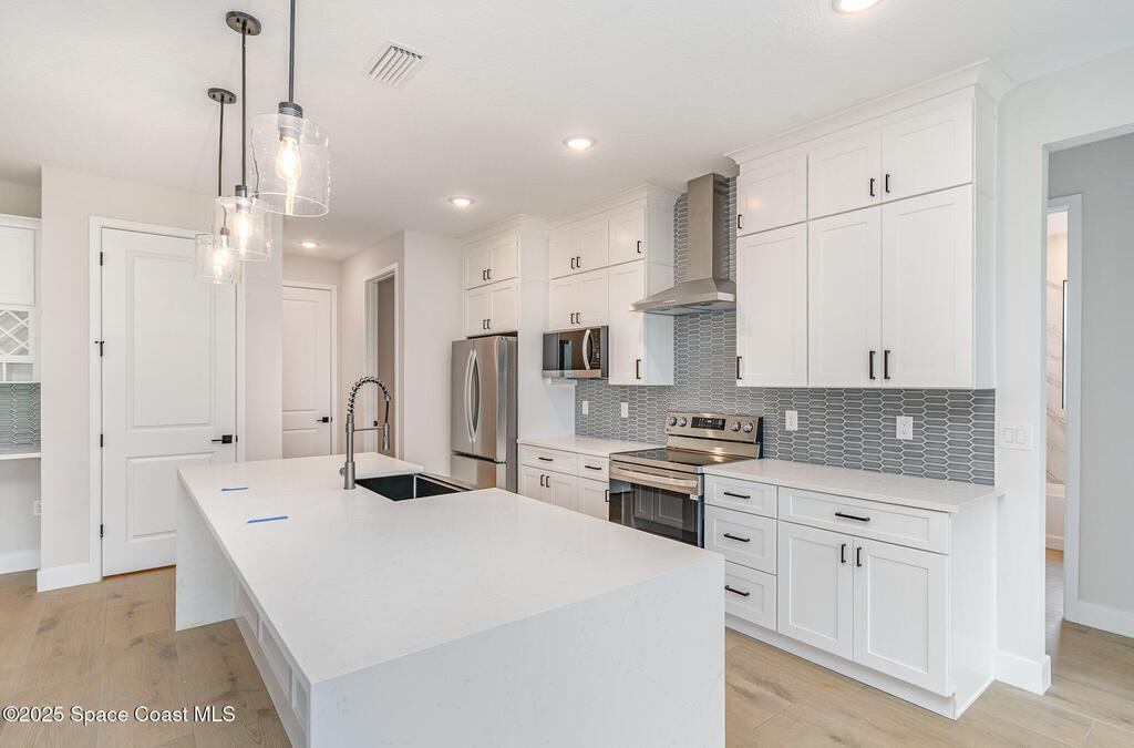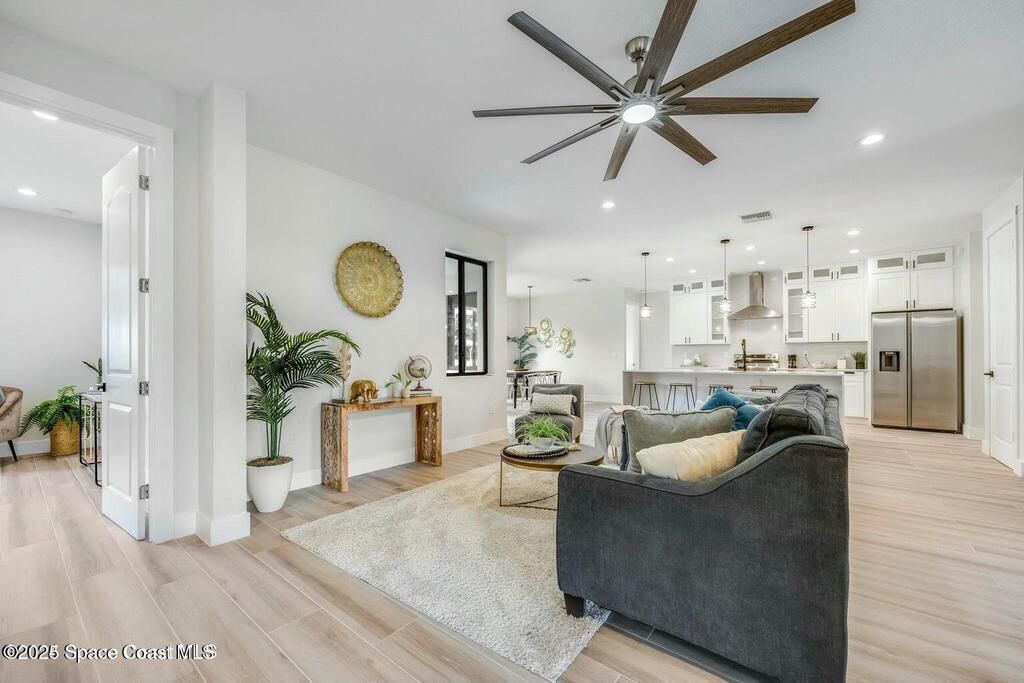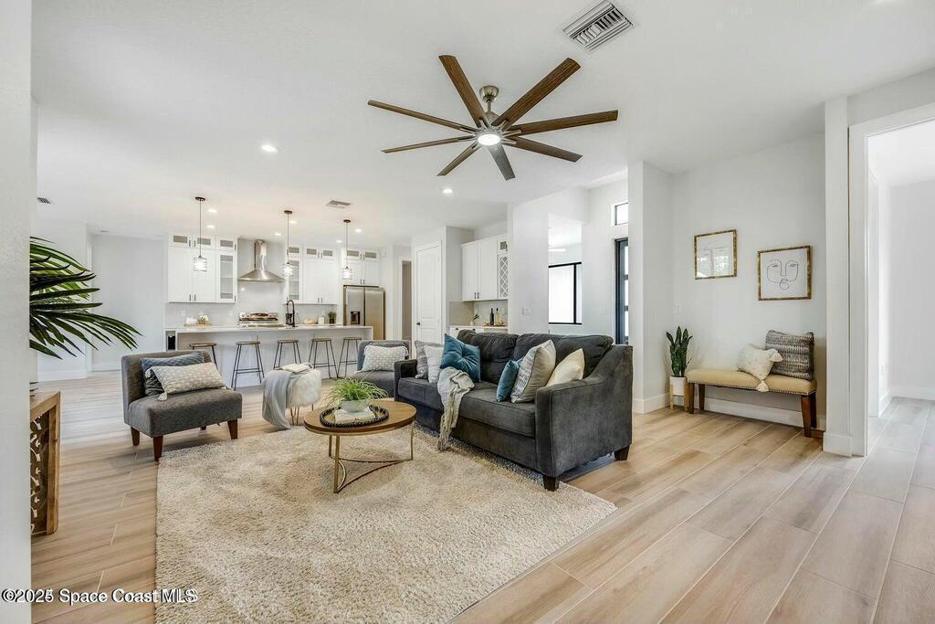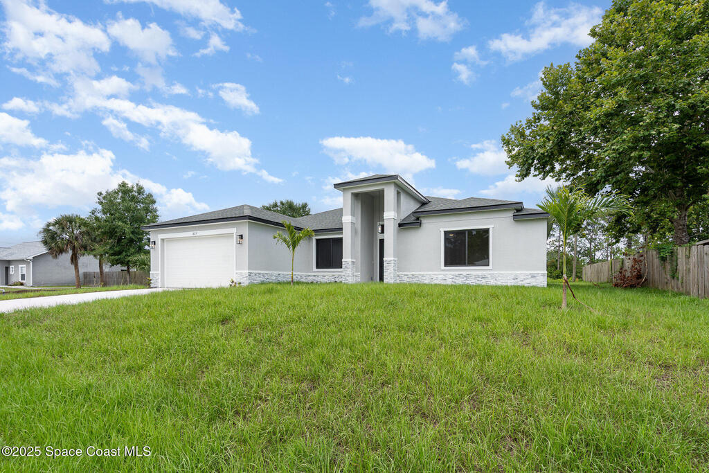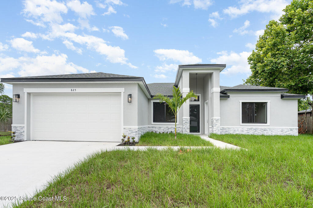 SELLER OFFERING $10K IN CONCESSIONS and an upgraded appliance package including washer and dryer. This home is perfect for multigenerational living, featuring a separate entry and private bathroom en suite, ensuring both privacy and comfort. Discover modern luxury living in Palm Bay's desirable Bayside area, close to shopping, dining, and more. This new build features 4 bedrooms, 3 full baths, an office, and 2, 108 sq ft under air. The sleek kitchen boasts a 9'x4' granite island with dual waterfall edges, stainless steel appliances, and custom soft-close cabinets. The open floor plan flows into the dining and living areas, perfect for entertaining. 9.4' ceilings and elegant porcelain tile flooring (no carpet or vinyl) add a spacious feel. The primary suite includes double sinks, a tub, a walk-in shower, and a walk-in closet. Enjoy a covered rear patio with outdoor kitchen utilities ready. This home also includes a 2-car garage, 1-year builder warranty, and 10-year structural warranty.