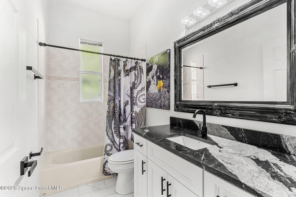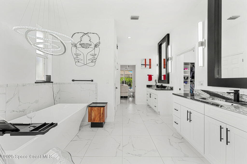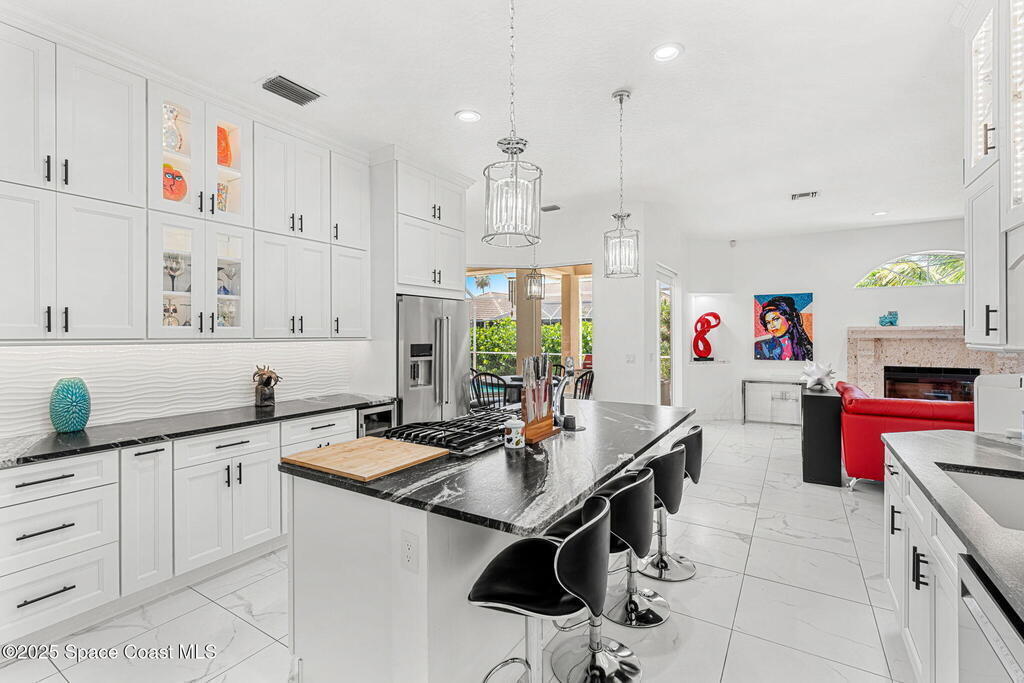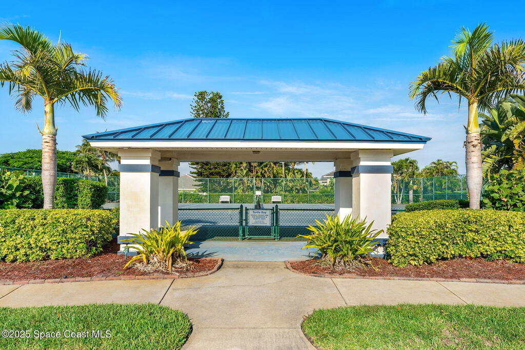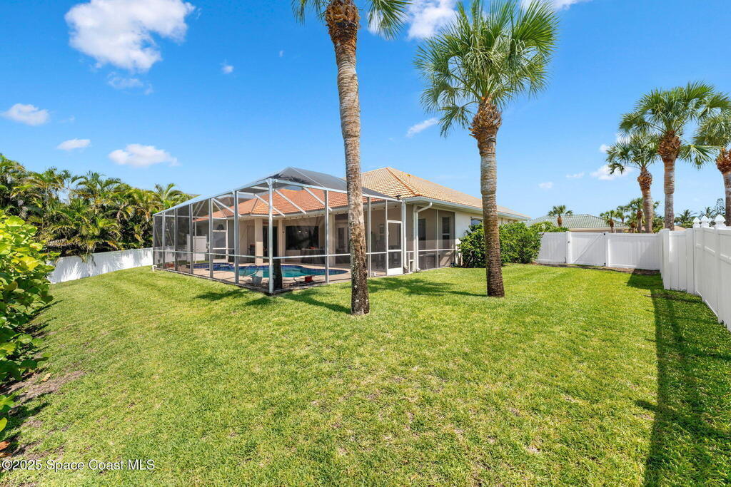 Wrapped in lush serenity and crowned with a brand-new 2025 roof, this dazzling Turtle Bay gem is anything but ordinary. Inside, vaulted ceilings & 24'' tile stretch across a fully reimagined 3-bedroom layout, where the expanded owner's suite boasts a closet so generous it borders on boutique. Exotic granite glimmers across the kitchen & baths, complementing custom glass-lit cabinetry, a wine cooler, gas stove, in-island prep sink & built-in wall oven. The gas-heated coquina rock fireplace brings texture & warmth, while the indulgent primary bath features a sculptural Greek soaking tub & a walk-in tiled glass shower. Outside, a screened lanai with cool decking frames the heated pool, hot tub & full pool bath w/ shower. Updates include a 2025 AC, 2024 pool pump, 2024 water heater & 2021 pool heater.