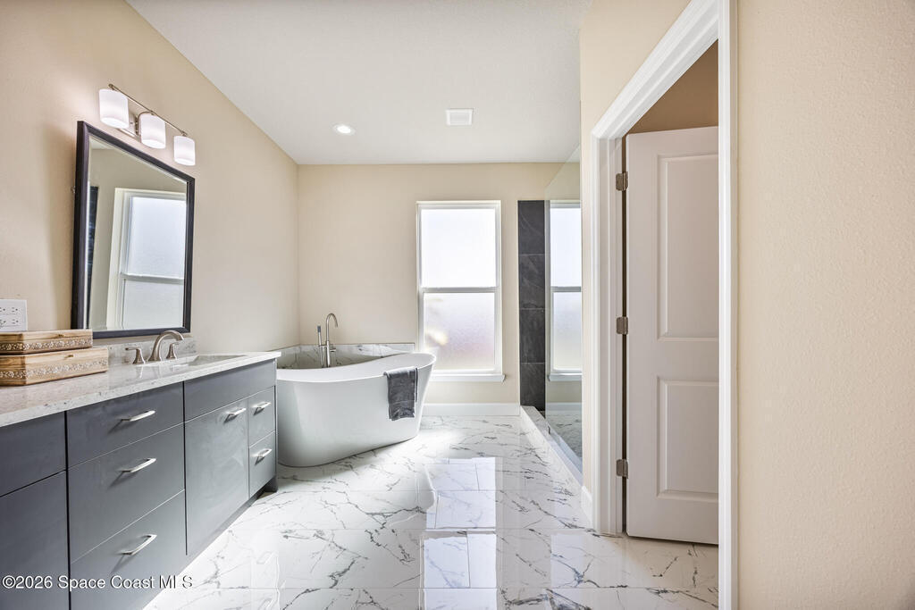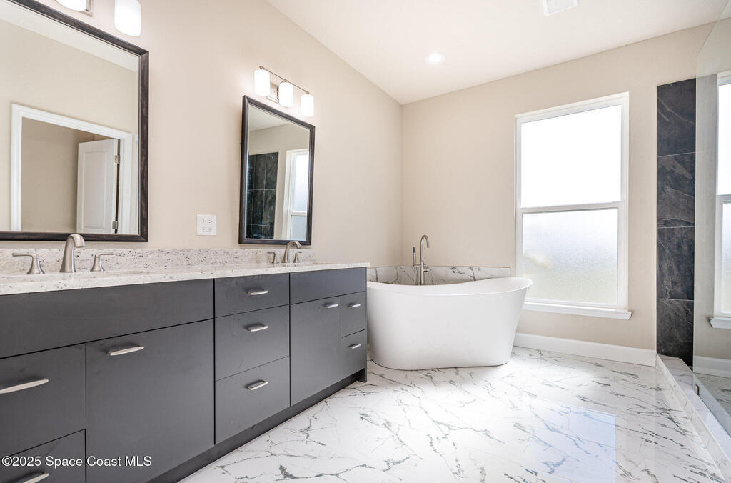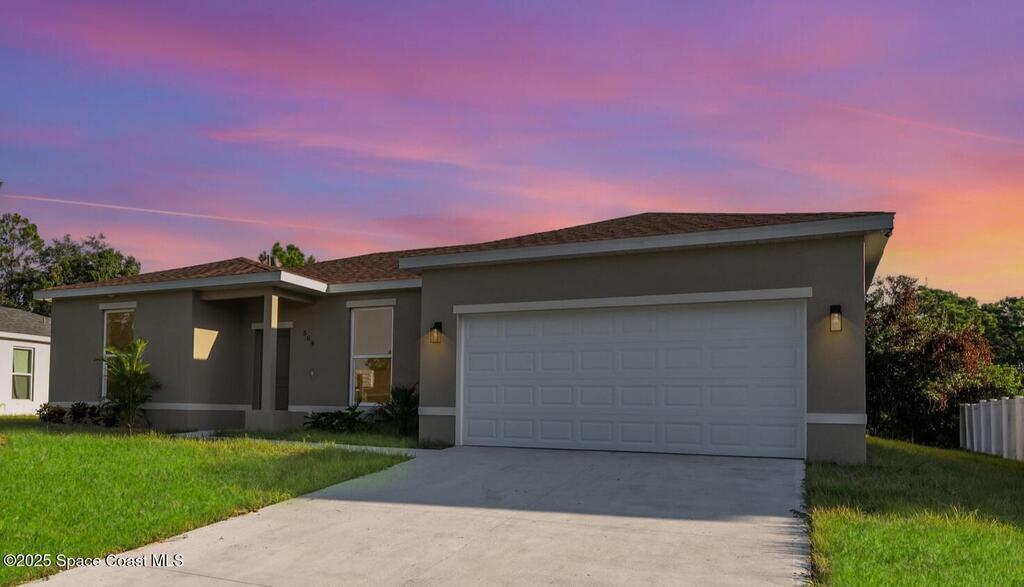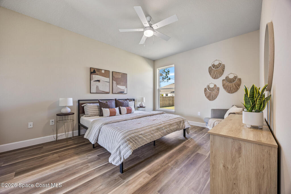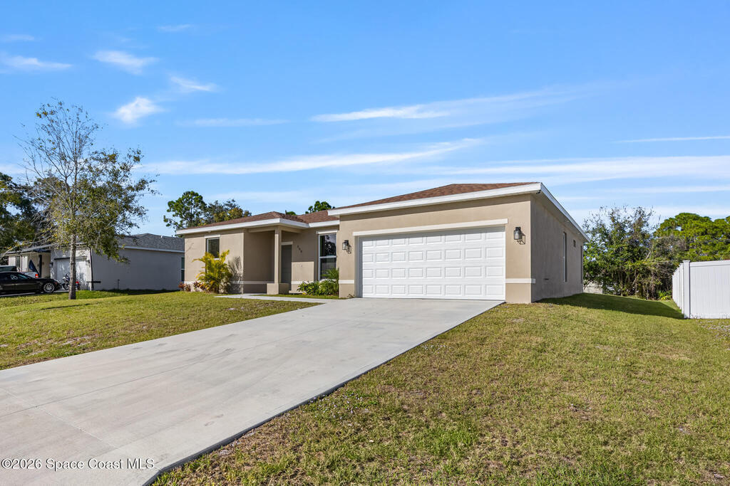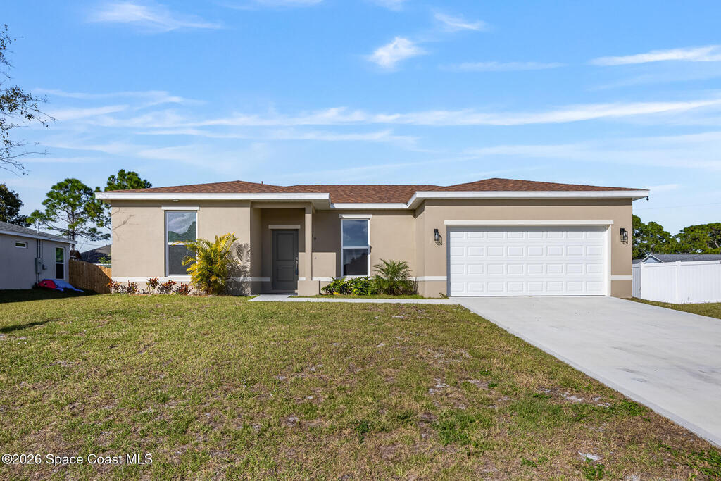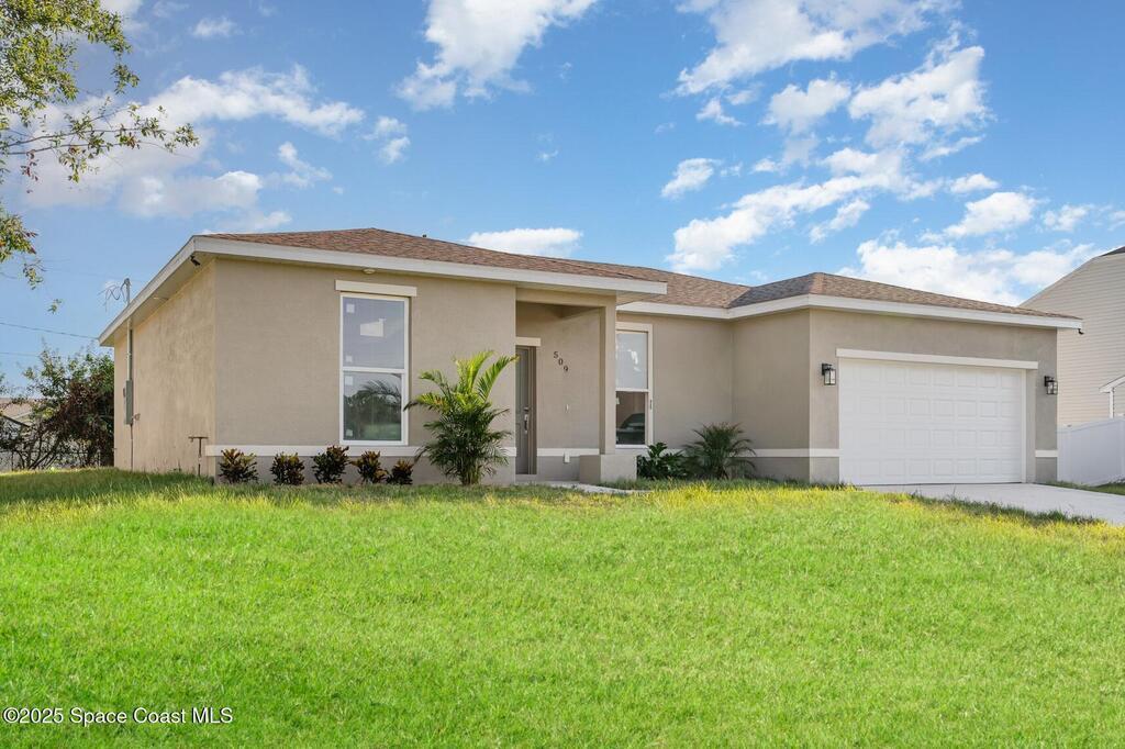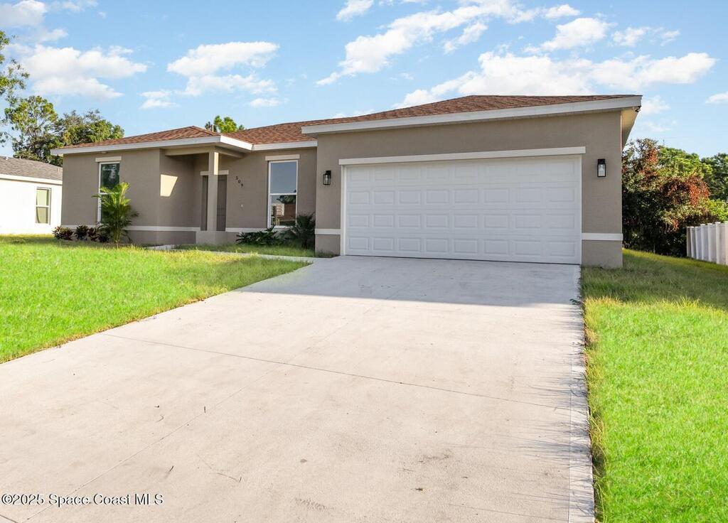 Welcome to this stunning semi custom 4 bedroom 2 full bathroom, NEW construction home. This beautiful concrete block home with warm subtle tones is nestled on .24 of an acre. Spacious open floor plan, expansive 9'4'' high interior ceilings, vinyl plank flooring for easy care and maintenance. Granite countertops, breakfast bar and 42'' upper cabinets for additional storage space and stainless steel appliances make entertaining a breeze. The primary bathroom with granite countertops and dual sinks, over-sized walk-in shower with glass enclosure, free standing soaker tub and elegant designer tile complete this stunning look. Large primary bedroom features His and Her closets. The energy efficient 38'' x 78'' impact windows allow for a light and open feel. Ceiling fans, Indoor laundry room, 2 car garage with insulated garage door and opener and 25 year shingle roof.