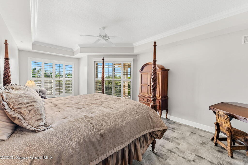 Riverfront living takes center stage in this top floor panoramic-view condo overlooking the scenic Intracoastal, where every detail is designed for comfort, beauty & ease. Behind 32ft of waterfrontage is a brand-new AC to keeps things crisp, while 10' ceilings, crown molding, & impact-rated windows w/ timeless plantation shutters elevate every space. 8' sliders--outfitted w/ electric blinds--open wide to a breezy balcony perfect for soaking in those endless water views. The kitchen shines w/ quartz counters, KitchenAid & Whirlpool appliances, a GE fridge & breakfast bar, while hardwood floors add warmth to the dining & living areas. All bedrooms feature en-suite baths, including a luxe primary suite w/ double-door entry, built-in closets, marble-floored bath, jetted tub & glass shower. Enjoy the ease of fresh paint, full laundry w/ sink & 3 garage spaces (32, 33, 34). The amenity-rich & SIRS complete building offers a spa, pool, gym, clubhouse, elevator & sunset dock.