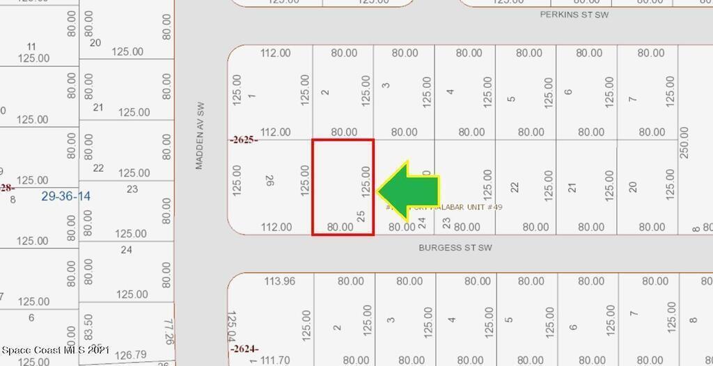 It's a 0.23 acre buildable residential lot available in Port Malabar Unit #49 of Palm Bay. Located in the southwest section, this lot is just 1.4 miles - 4 minutes to Bayside High School, 2.7 miles - 7 minutes to the Publix Supermarket, 14.3 miles - 30 minutes to Melbourne Airport, and 20 miles - 35 minutes to the beaches of Indialantic. From exit #176 of I-95 go west on Palm Bay Road NE for .7 miles, left on Minton Road for 3.3 miles, right on Jupiter Boulevard for .1 mile, left on DeGroodt Road SW for 2.5 miles, right on JA Bombardier Boulevard for .9 miles, right on Madden Avenue for .2 miles, and right on Burgess Street. The lot will be on your left.
