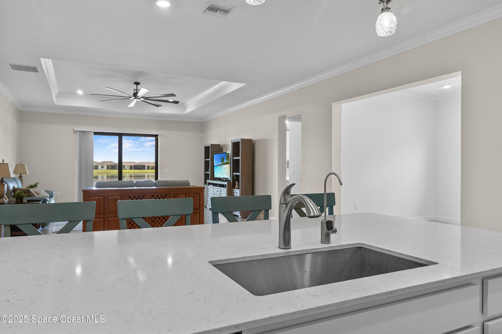 Rare TREVISO floor plan complete with many upgrades can be your your new dream home! You will love the lakefront views , 3 well separated bedrooms PLUS a generous sized office! Beautiful tile throughout/no carpet. High ceilings, upgraded kitchen backsplash, lighting, ceiling fans, crown moulding, blinds, and more. Primary bedroom , bath and closet are very spacious and on one side of the home while 2nd and 3rd bedrooms (one is en- suite) plus office /flex room are on the opposite side of the home. Utility room is off the kitchen and opens into very spacious 3 car garage. Come enjoy all that Bridgewater has to offer, from a world class pool to pickleball courts, bocce, billiards, movie theater, coffee lounge to gathering rooms to enjoy community activities with friends. Love the lifestyle; love your new home!