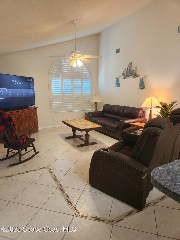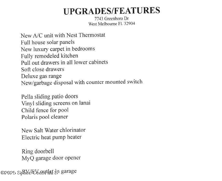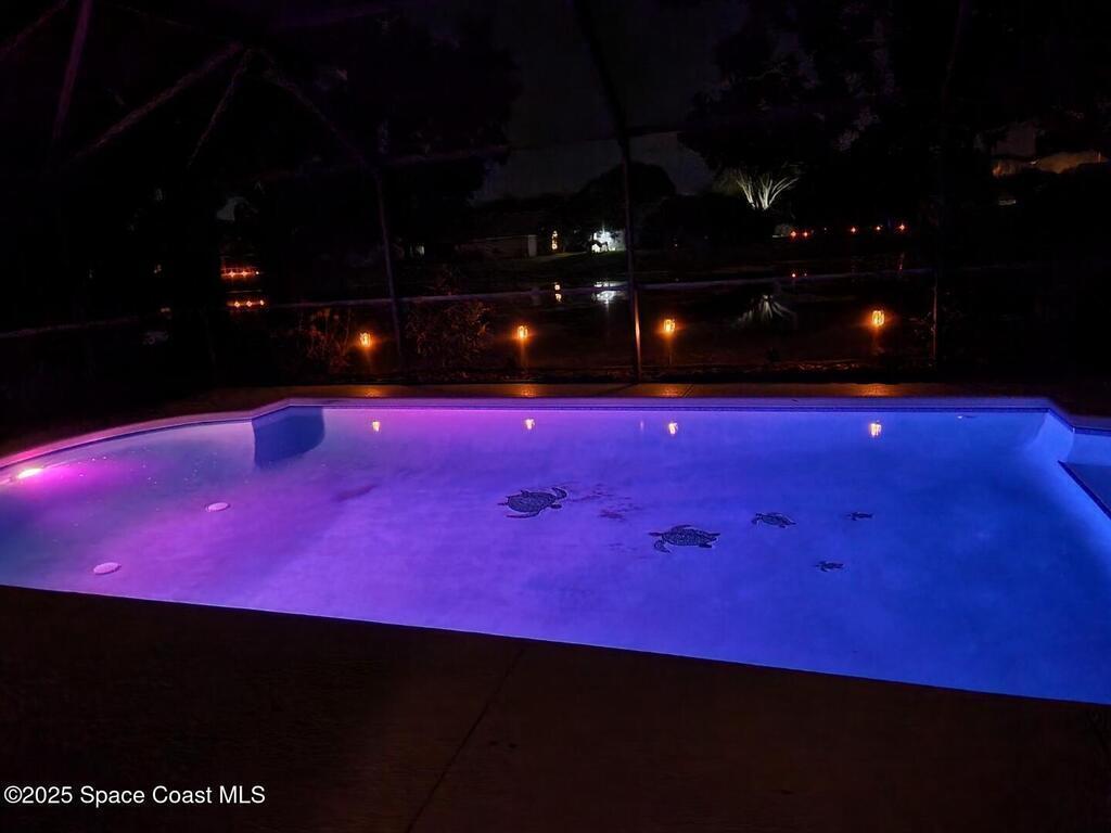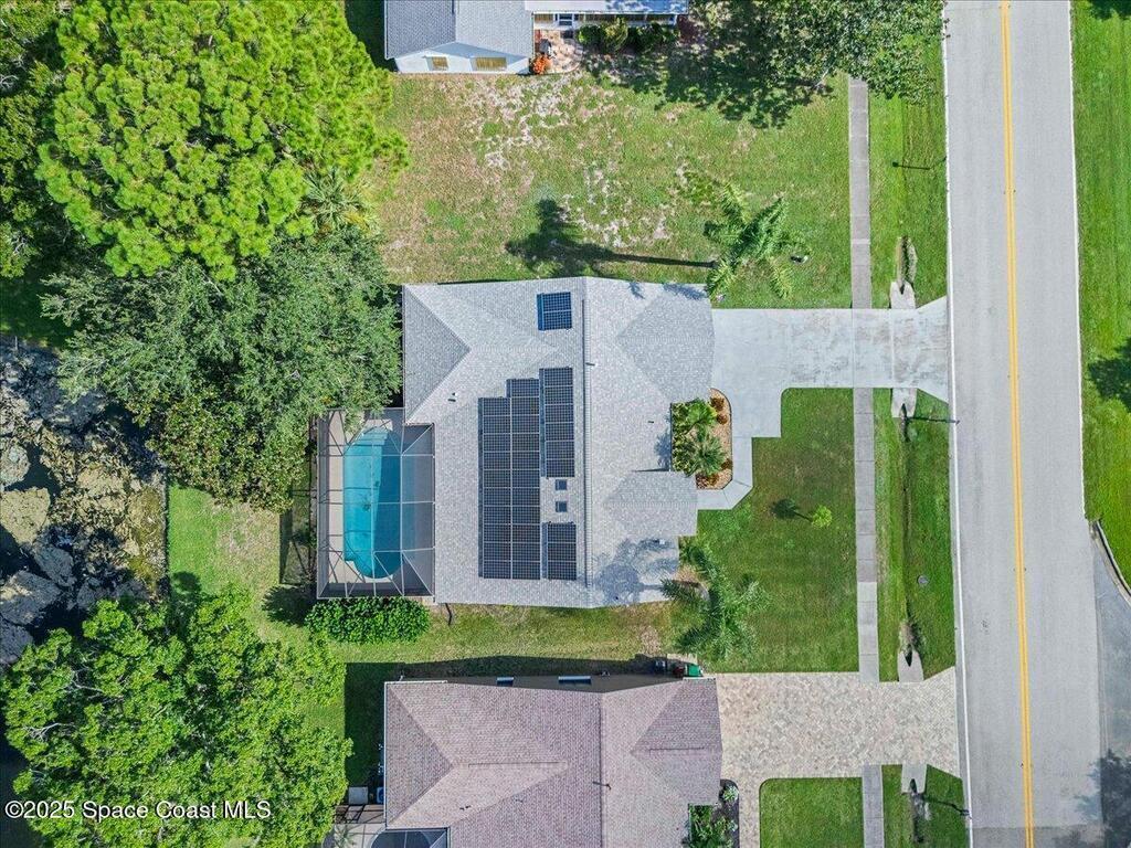 Beautiful lakefront pool home, lots of room with Vaulted Ceilings with two Skylights in the formal living room. upgraded with whole house Solar Panels- Paid in Full. EV Charger, New Roof in 2023, Interior paint in 2024, new luxury carpet in the bedrooms, New Kitchen Cabinets with soft close drawers and pull-out shelving, Granite counter tops, New pool salt system, New gas stove and new A/C and nest thermostat, 2025. the kitchen has Stainless Steel appliances and tile backsplash. The Master Bedroom has two Walkin closets. Natural Gas, The large 11 X 25 ft. patio with vinyl sliding doors is perfect for entertaining and overlooks the fully screened in pool. Conveniently located by shopping, Golfing, the Melbourne Airport, I-95 and just 15 minutes from the Beach. Your only an hour from the Orlando attractions like Disney World, Universal studios, Seaworld and more.
