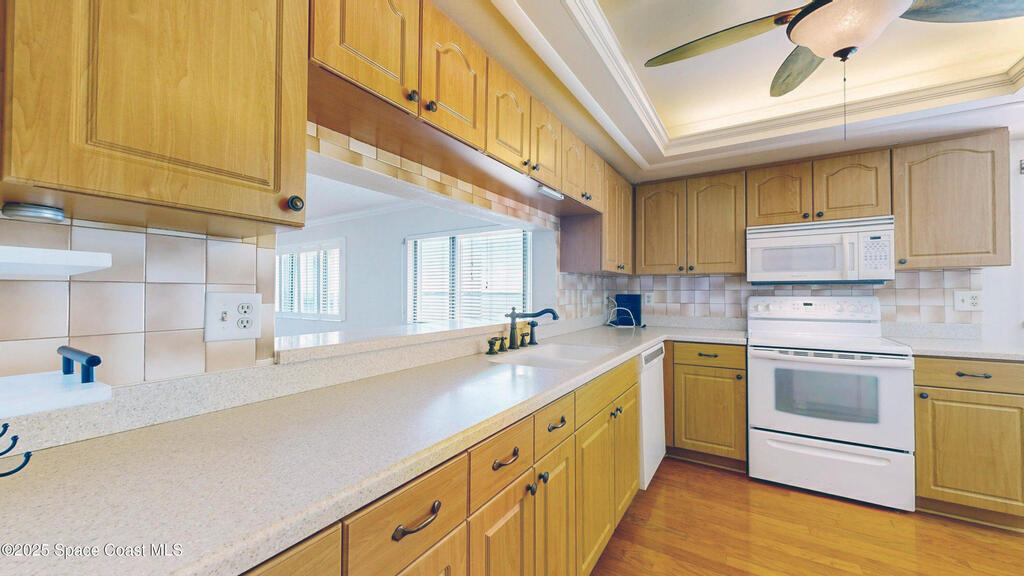 Front-row rocket launches, dazzling sunsets, and waterfront living at its best! This upgraded 4th-floor corner unit at Merritt Towers overlooks Sykes Creek and Newfound Harbor, offering 3 bedrooms, 2 baths, and 1, 764 sq. ft. of stylish living. The open kitchen features abundant counters, cabinets, a breakfast bar, and an adjacent laundry room with extra storage. The light and bright floor plan flows into an enclosed balcony, adding flexible living space--perfect as a den or porch with sliders open or closed. Recent updates include remodeled kitchen and baths, oak hardwood floors, fresh paint, and roll-down hurricane shutters. Merritt Towers delivers resort-style amenities: two pools (one heated), hot tub, sauna, tennis courts, dog park, car wash, shuffleboard, BBQ, boardwalk, and fishing pier. HOA covers cable, internet, water, trash, insurance, and grounds--only electric is separate. Minutes to Cocoa Beach, Cocoa Village, shopping, and dining!