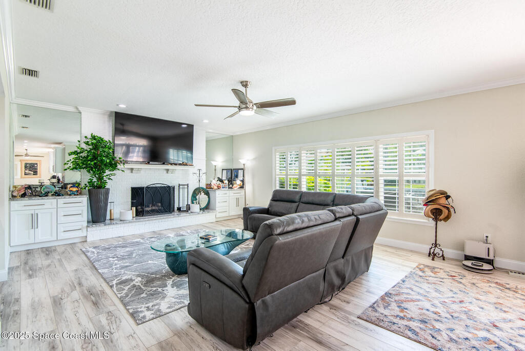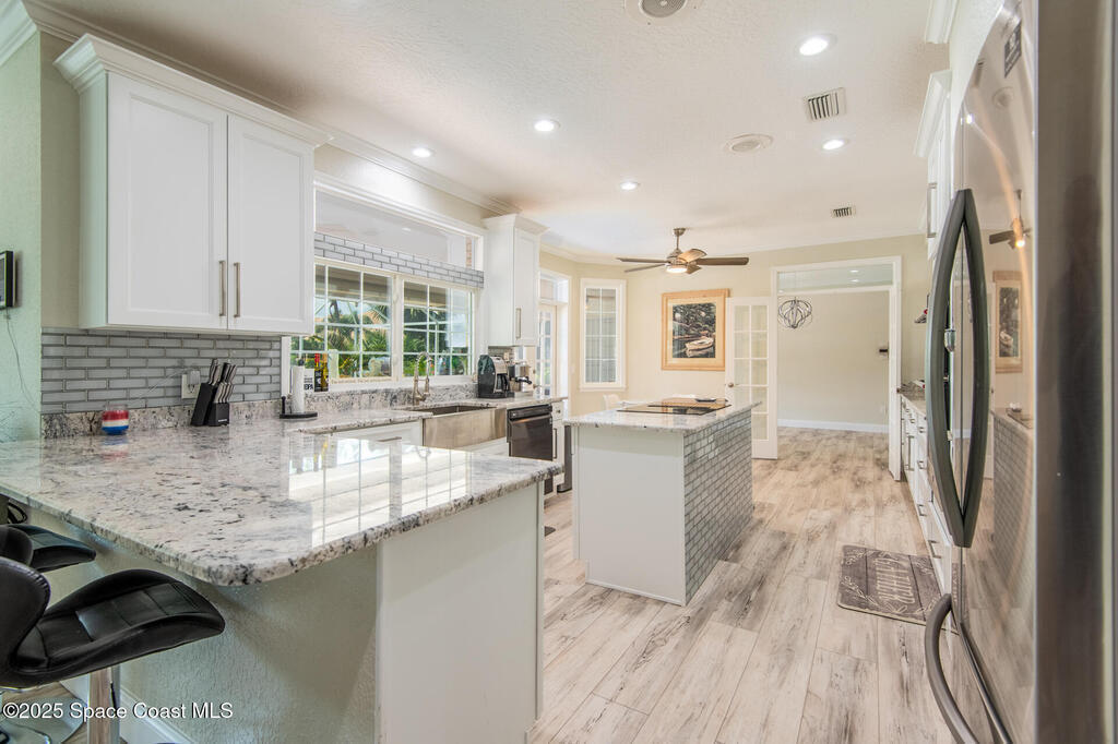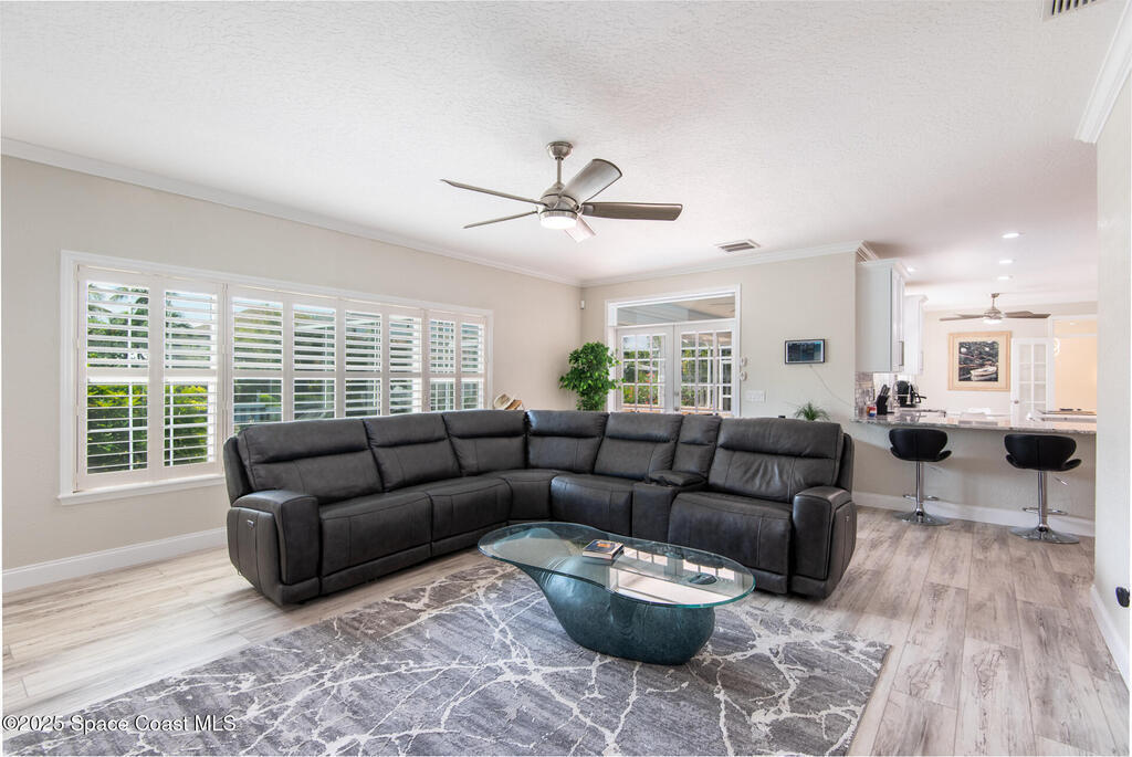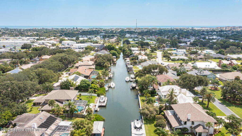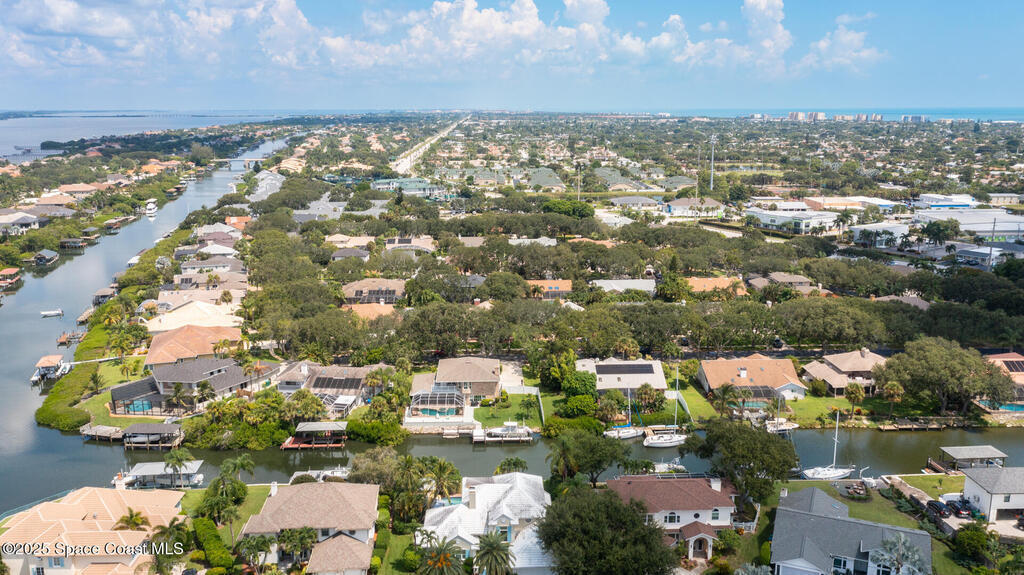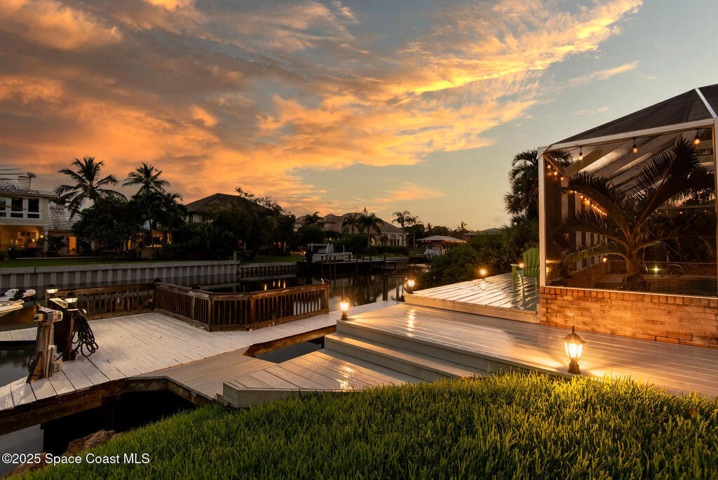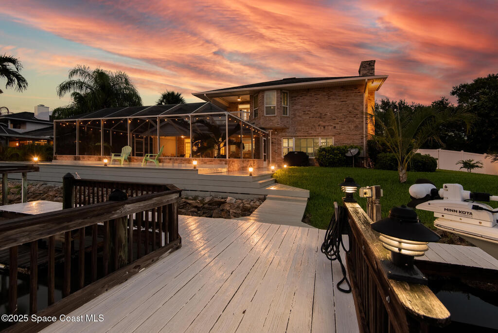 Exquisite canal front residence in the amazing Windward Cove subdivision in the Kiwi Racquet and Fitness Club neighborhood offers luxury living with four bedrooms, three bathrooms, and an impressive 3, 643 sq ft of meticulously crafted interiors. A boater's dream, the property boasts 97 feet of pristine water frontage, a private dock with a boat lift, brand new deck and direct access to navigable Banana River. The screened-in pool and spa outdoor provides splendid entertainment. Living room with gas fireplace overlooking the amazing spacious kitchen with island, granite counter tops and fully remodeled cabinets. All three bathrooms tastefully remodeled. Hurricane impact windows provides the perfect comfort in Florida living. New roof in 2021 and the whole house with high end luxury lifetime vinyl plank floor. This rare waterfront sanctuary seamlessly combines elegance, exclusivity, and the ultimate coastal lifestyle.