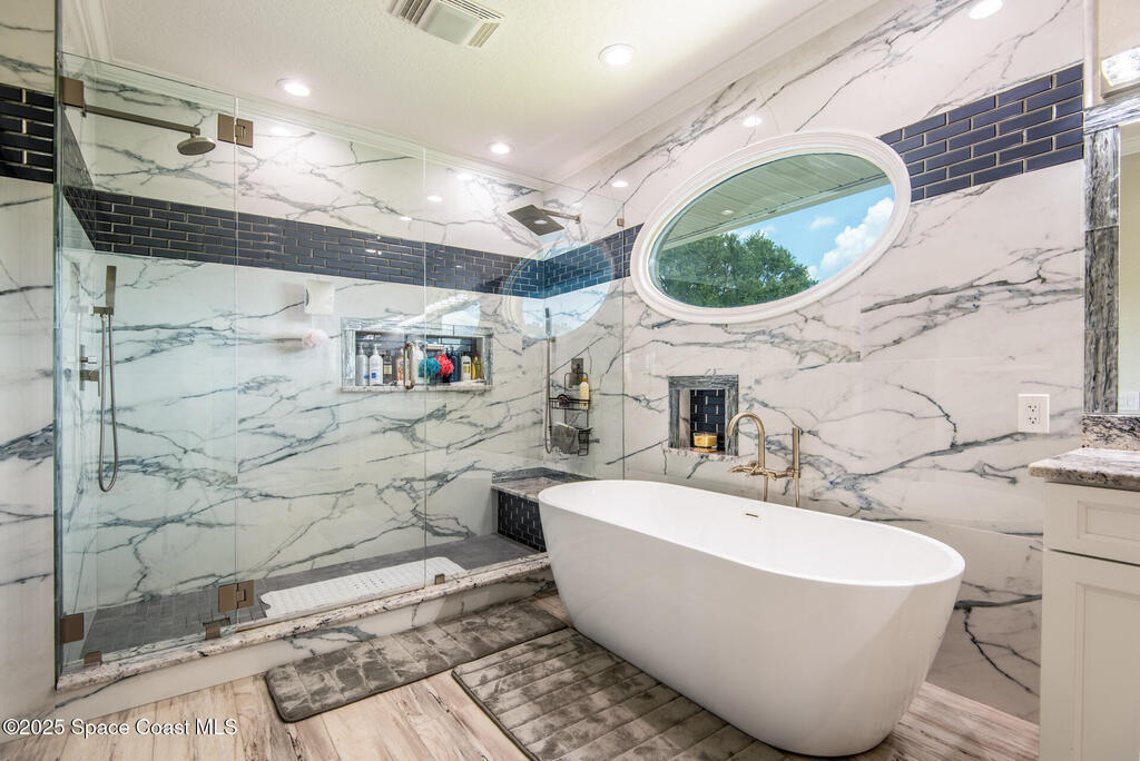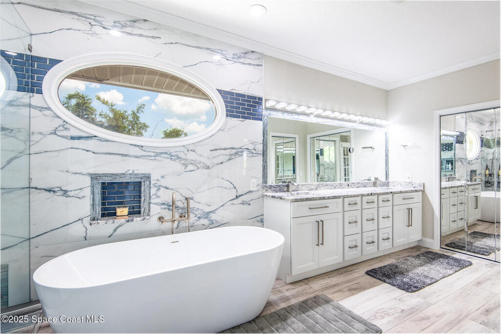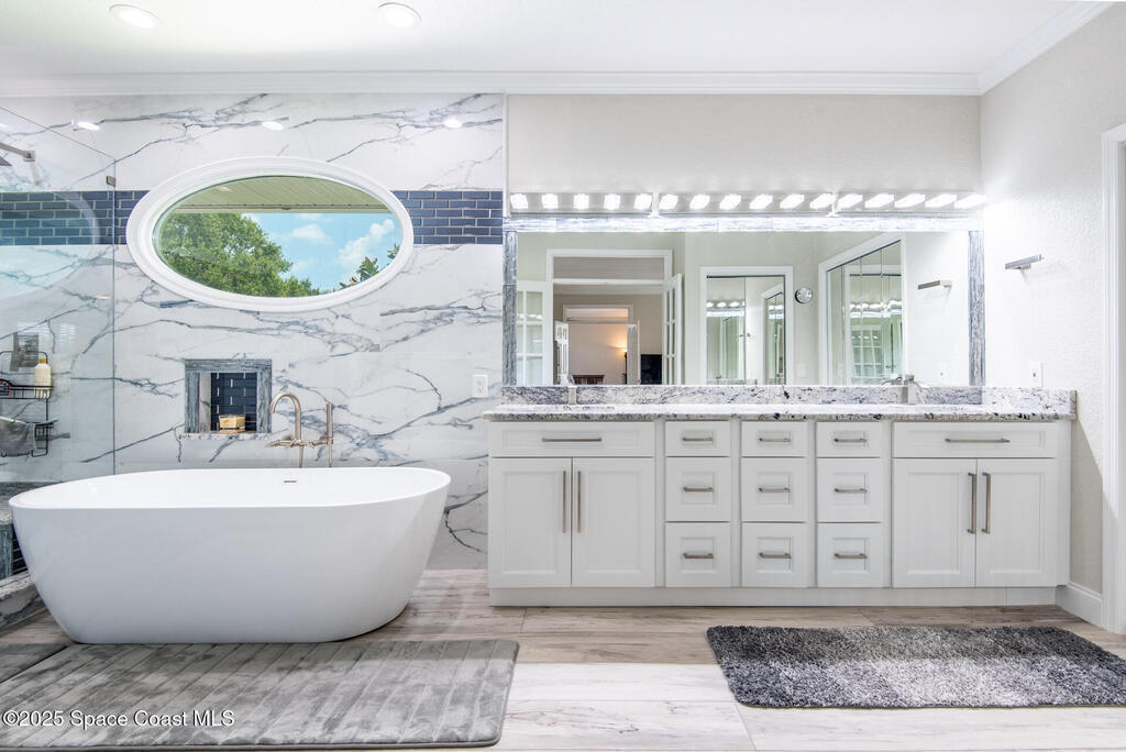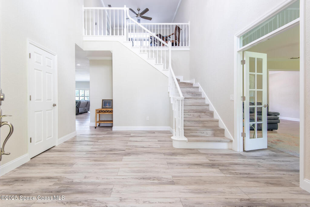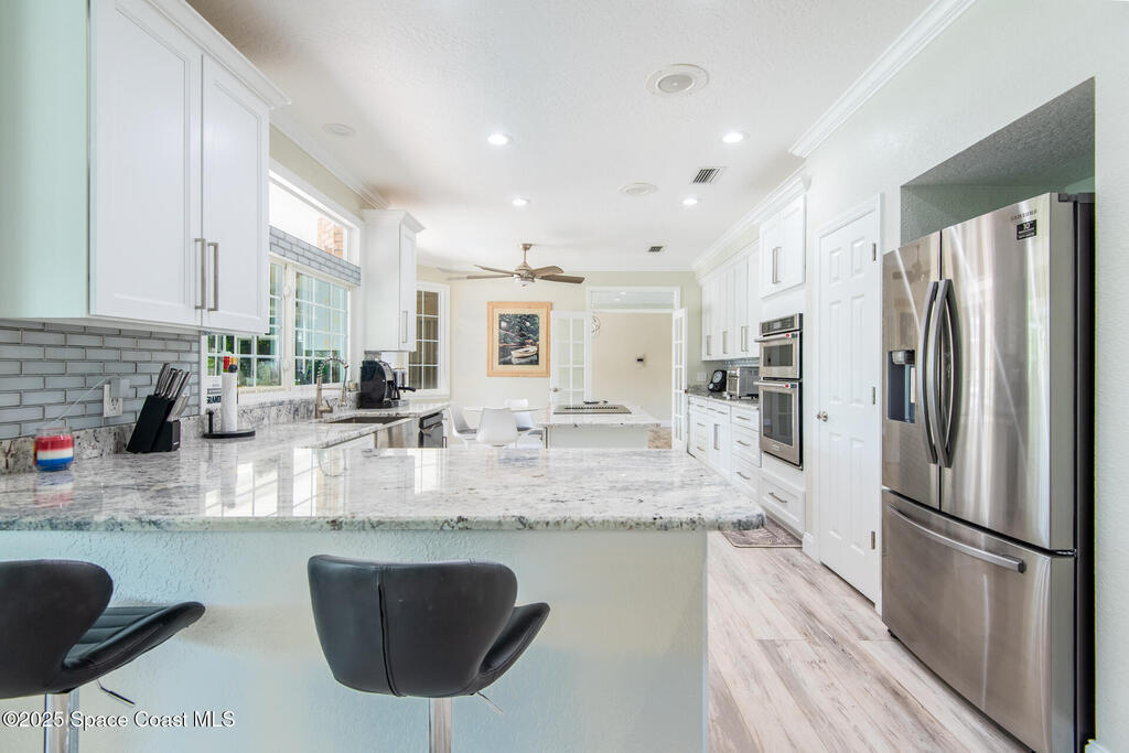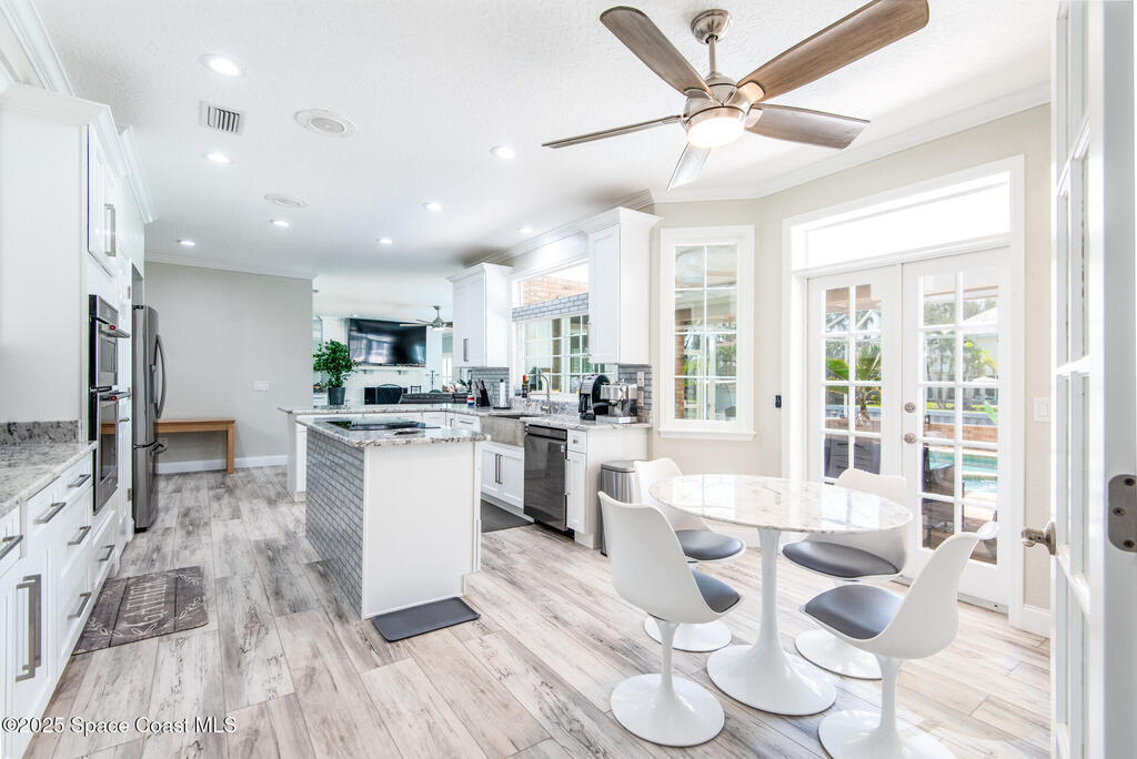 Exquisite canal front residence in the amazing Windward Cove subdivision in the Kiwi Racquet and Fitness Club neighborhood offers luxury living with four bedrooms, three bathrooms, and an impressive 3, 643 sq ft of meticulously crafted interiors. A boater's dream, the property boasts 97 feet of pristine water frontage, a private dock with a boat lift, brand new deck and direct access to navigable Banana River. The screened-in pool and spa outdoor provides splendid entertainment. Living room with gas fireplace overlooking the amazing spacious kitchen with island, granite counter tops and fully remodeled cabinets. All three bathrooms tastefully remodeled. Hurricane impact windows provides the perfect comfort in Florida living. New roof in 2021 and the whole house with high end luxury lifetime vinyl plank floor. This rare waterfront sanctuary seamlessly combines elegance, exclusivity, and the ultimate coastal lifestyle.