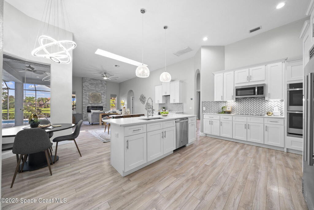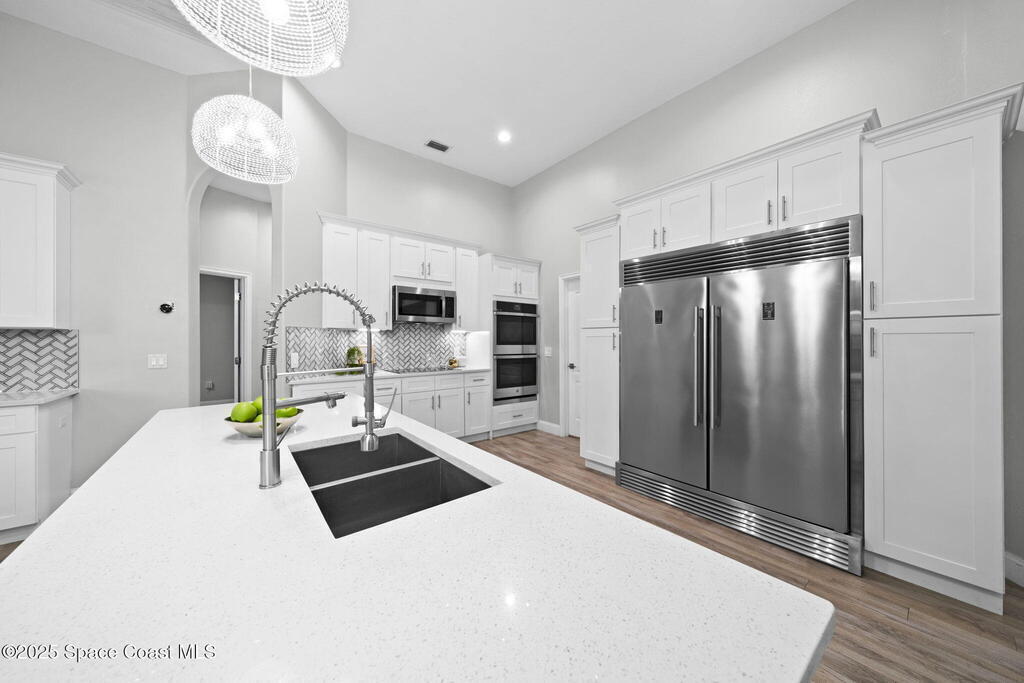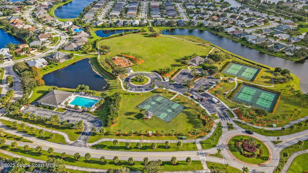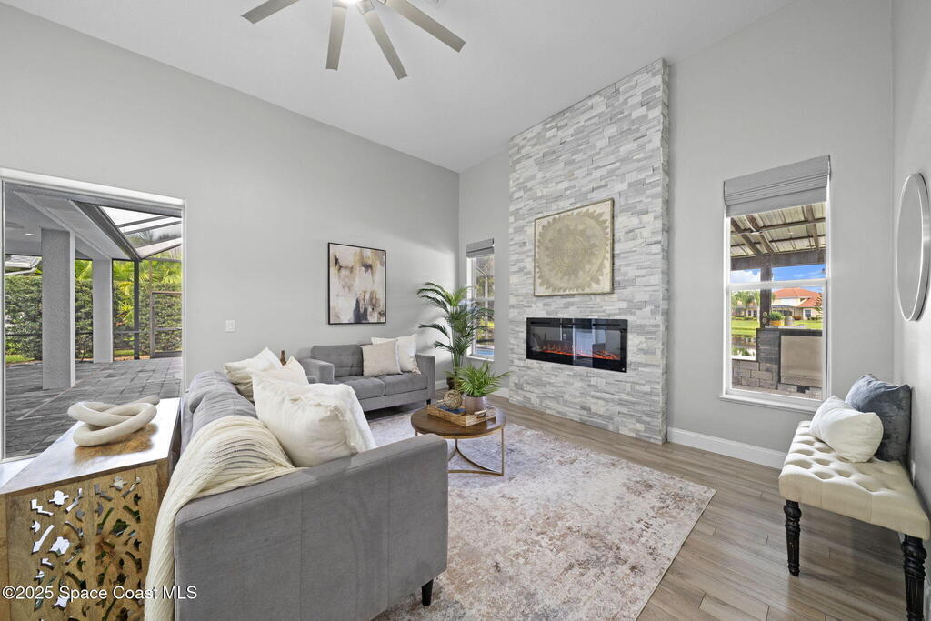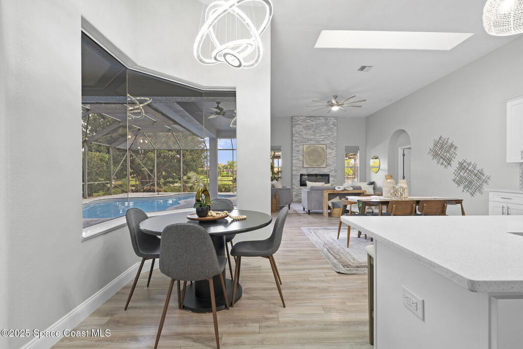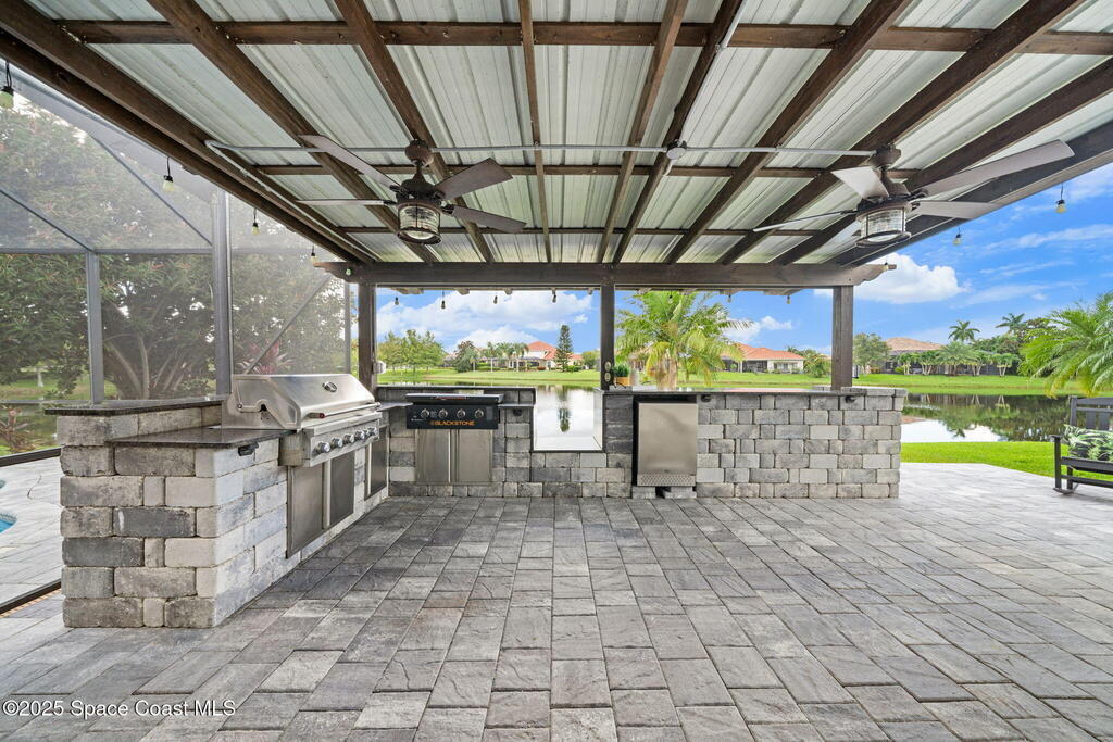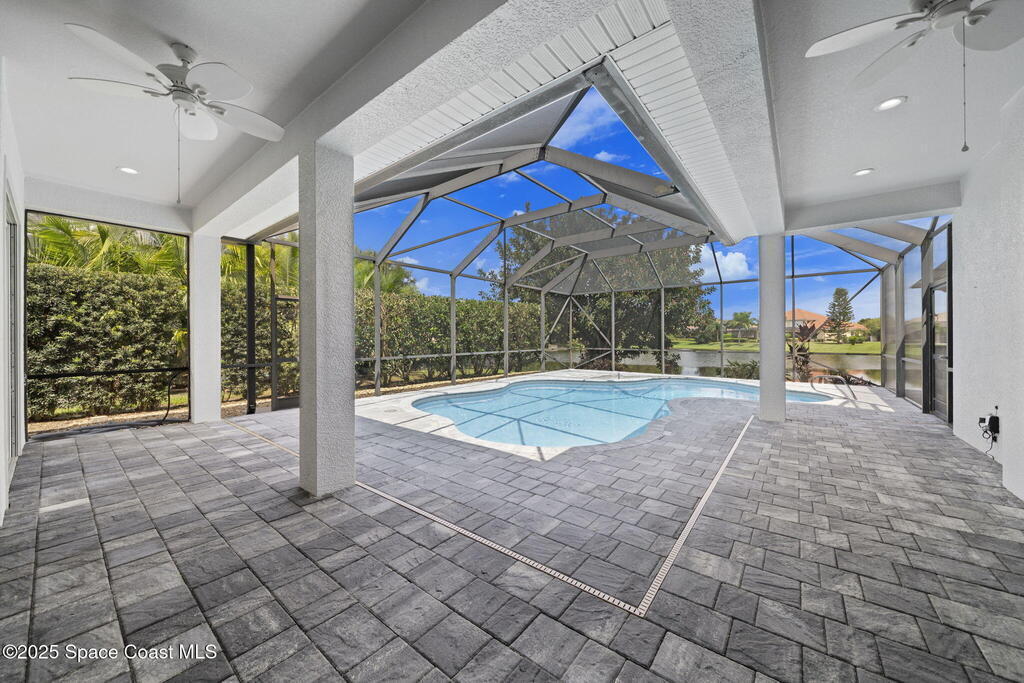 NEW ROOF - Nestled in a desirable, family-friendly neighborhood within Salerno Village's exclusive Ravencliff enclave, this custom 4-bedroom, 3-bath plus office home blends elegance and comfort with seamless indoor-outdoor living and peaceful lake views. The gourmet kitchen features quartz countertops, stainless appliances, double ovens, and a commercial-grade refrigerator, complemented by a wine bar with fridge. Expansive sliding glass doors open to a screened patio with a sparkling freeform pool and full summer kitchen overlooking the water. The luxurious owner's suite includes dual walk-in closets and a spa-inspired bath with soaking tub and oversized shower. Residents enjoy resort-style amenities including a swim club with Olympic-size pool, tennis and basketball courts, playground, pavilions, and scenic trails. Move-in ready, this home offers the perfect balance of relaxation and entertainment.