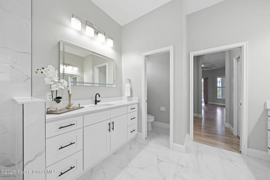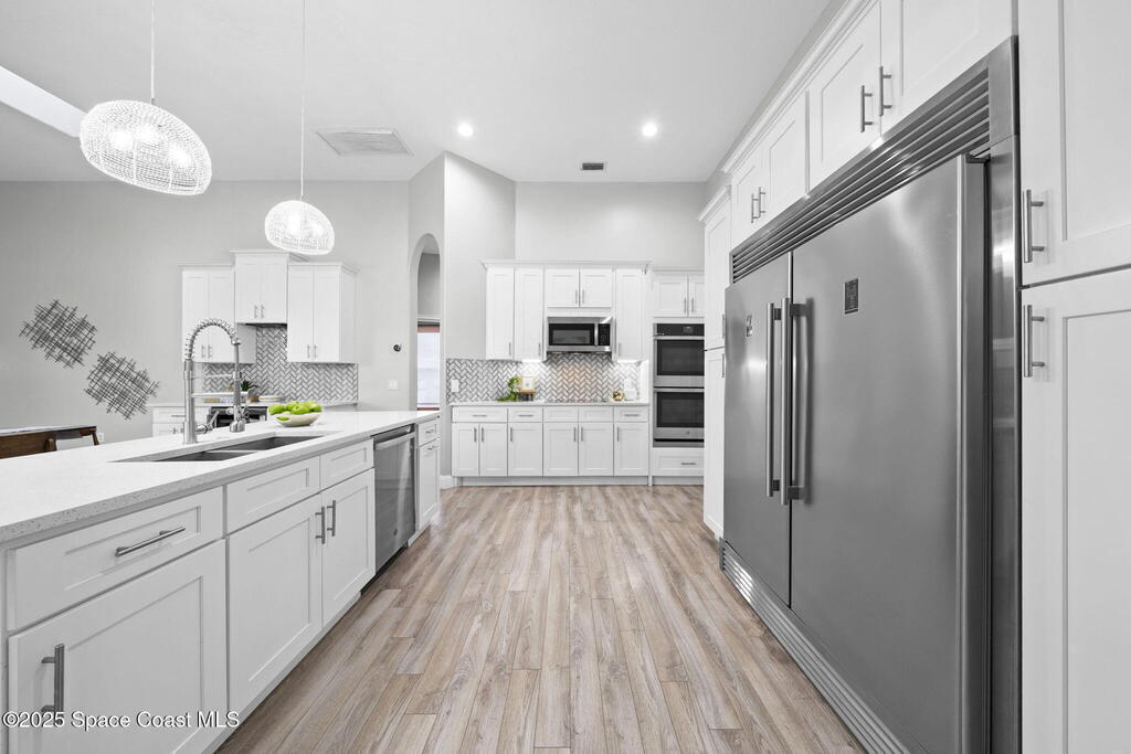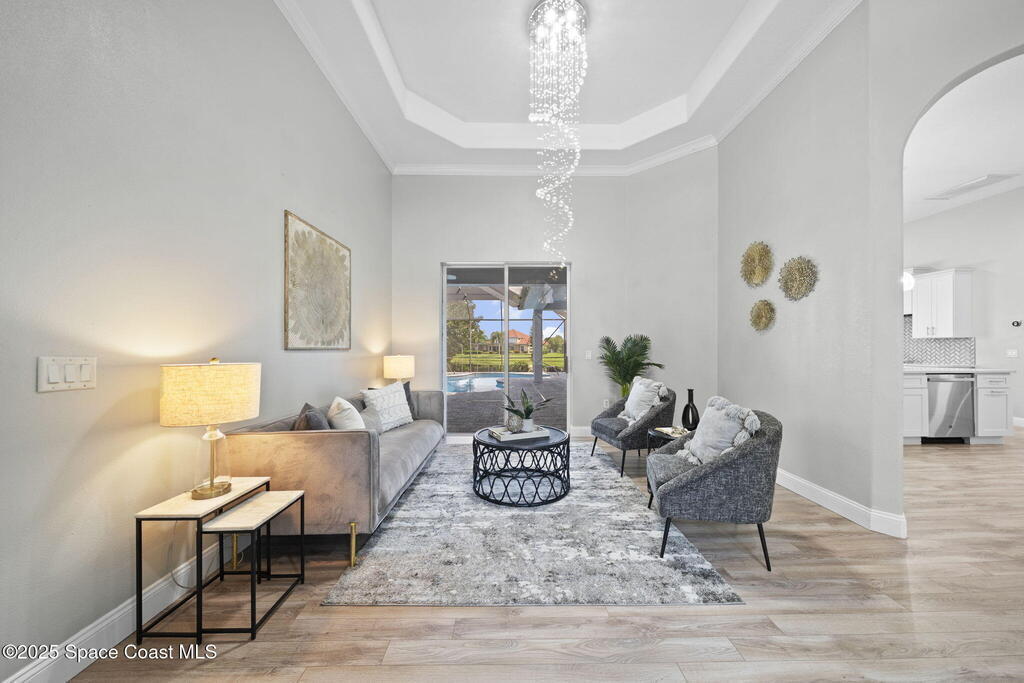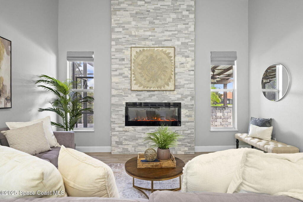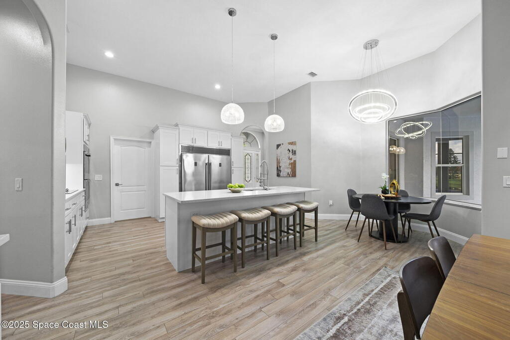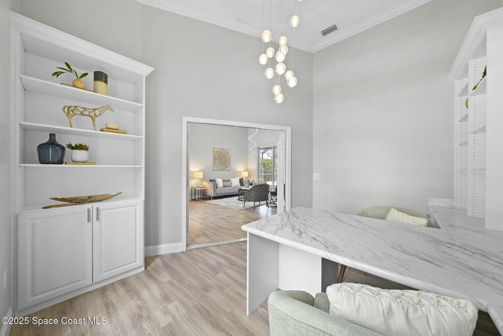 NEW ROOF - Nestled in a desirable, family-friendly neighborhood within Salerno Village's exclusive Ravencliff enclave, this custom 4-bedroom, 3-bath plus office home blends elegance and comfort with seamless indoor-outdoor living and peaceful lake views. The gourmet kitchen features quartz countertops, stainless appliances, double ovens, and a commercial-grade refrigerator, complemented by a wine bar with fridge. Expansive sliding glass doors open to a screened patio with a sparkling freeform pool and full summer kitchen overlooking the water. The luxurious owner's suite includes dual walk-in closets and a spa-inspired bath with soaking tub and oversized shower. Residents enjoy resort-style amenities including a swim club with Olympic-size pool, tennis and basketball courts, playground, pavilions, and scenic trails. Move-in ready, this home offers the perfect balance of relaxation and entertainment.