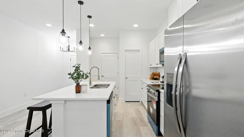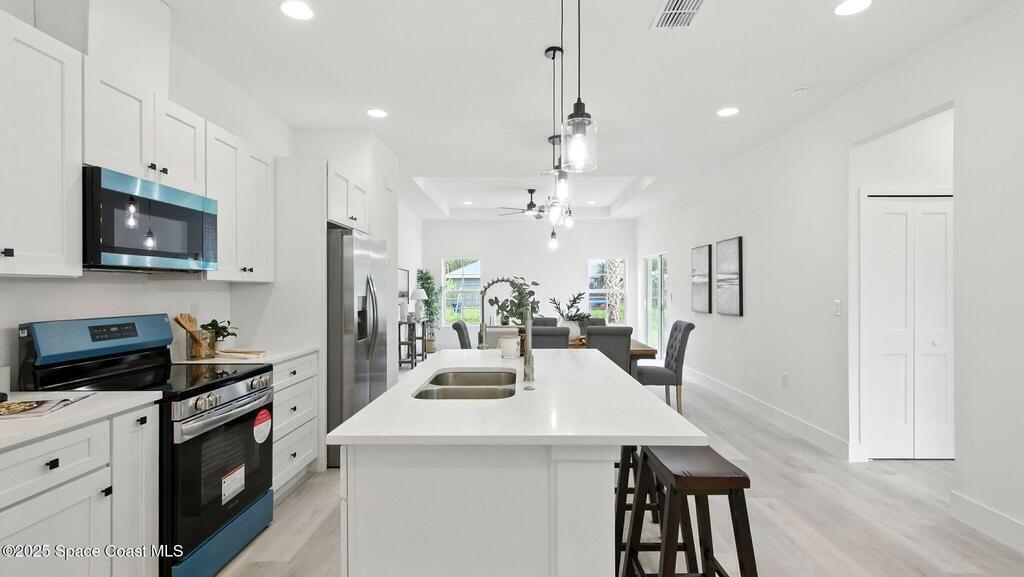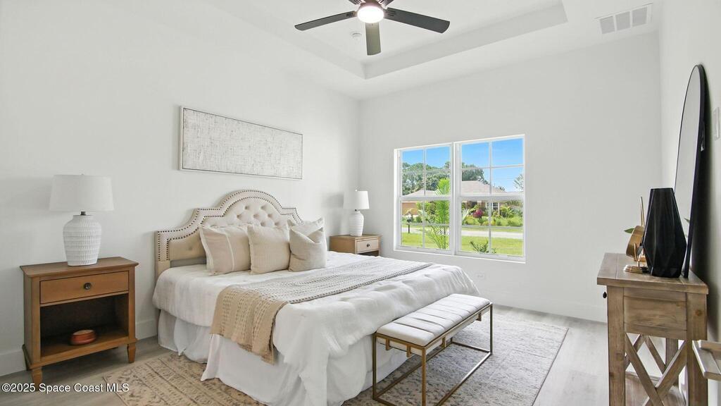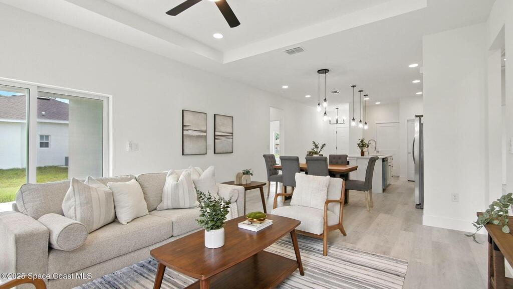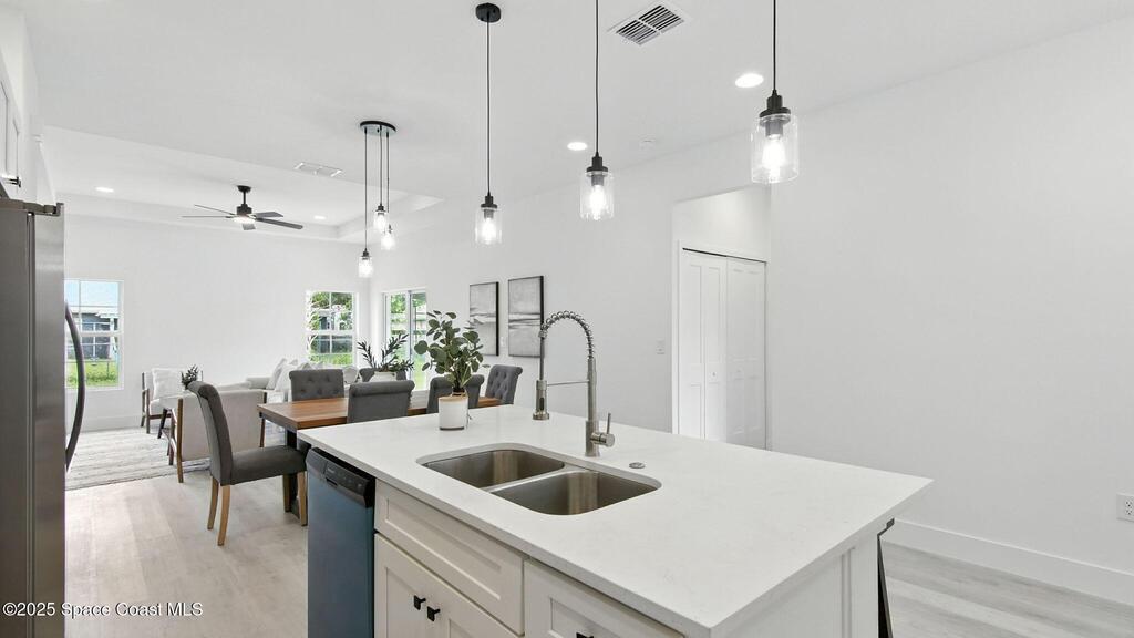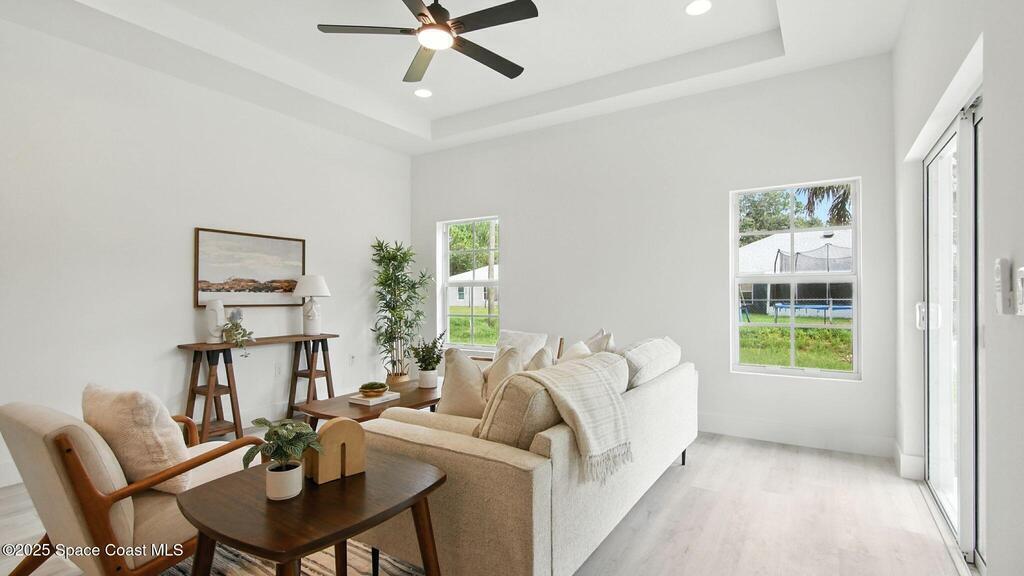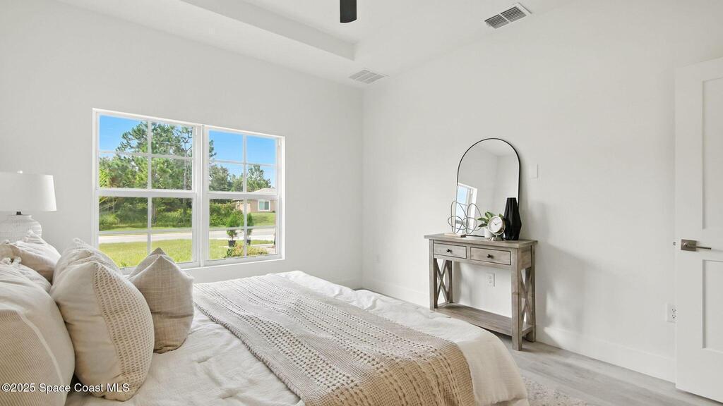 New Construction with Warranty. Modern and Versatile! Discover the convenience and charm of new construction in Palm Bay. This thoughtfully designed single-story floorplan features a bright and airy living space that opens to the kitchen and dining areas, ideal for entertaining or casual gatherings. The private primary suite includes a large walk-in closet, dual vanity, and tiled shower, while two additional bedrooms provide flexibility for your lifestyle. Upgraded finishes include quartz counters, stainless steel appliances, and laminate flooring. Relax outdoors on your covered lanai and enjoy peace of mind with a full builder's warranty.