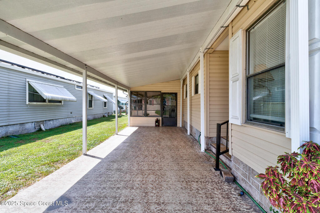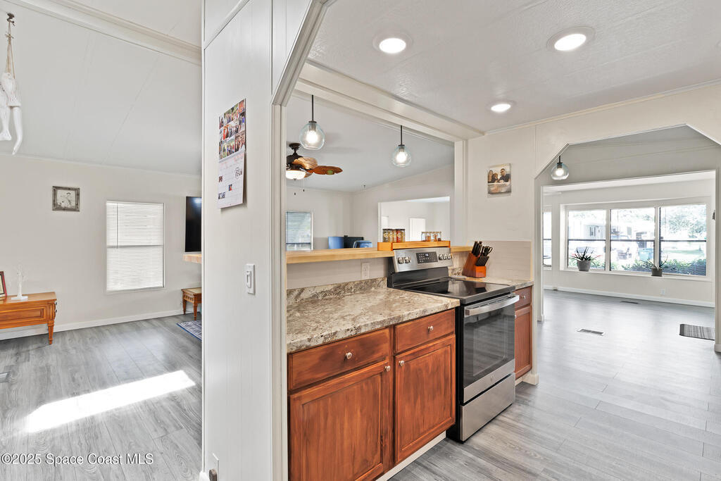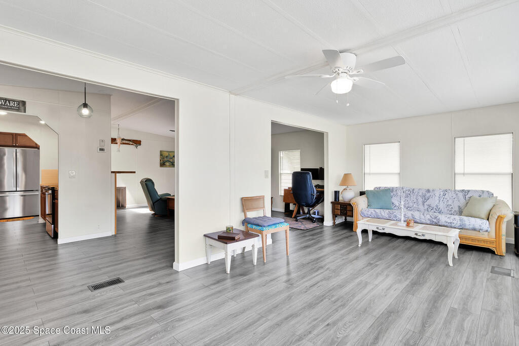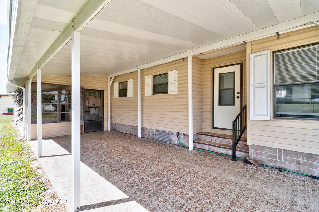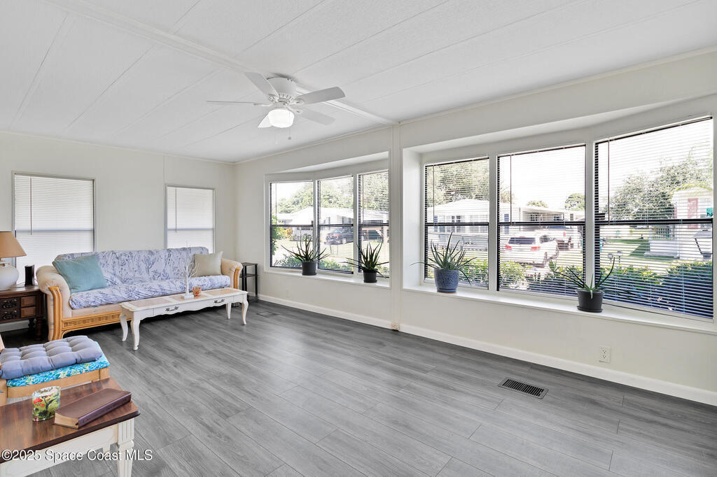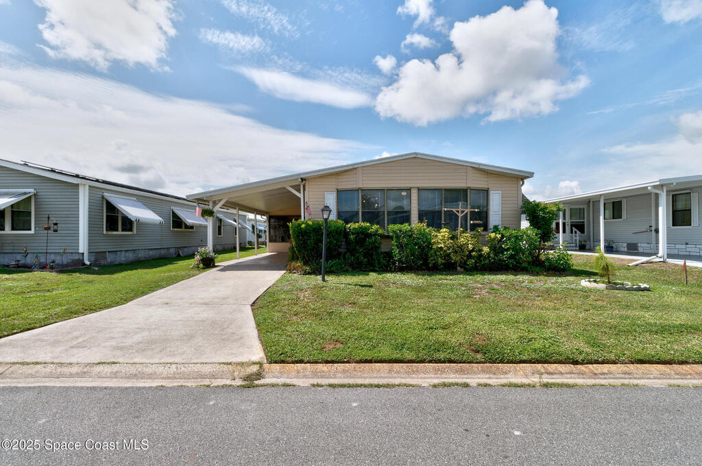 MOTIVATED SELLER! Inviting layout with lots of windows and open floor plan. The kitchen was remodeled and extended in 2023. New cabinets and countertop installed in addition to new stainless steel appliances. New 150-amp electric panel. New vinyl plank waterproof flooring. 5 new ceiling fans. Newer roof. AC 2017. Storm panels & shutters included for your protection. Golf cart and pet friendly community with no lot rent. Lots of amenities and social clubs to keep you busy. Great location in Barefoot Bay and all the way around. Walking distance to the clubhouse and pool and can you believe - you can even watch the shuttle lunches right from your living room?!
