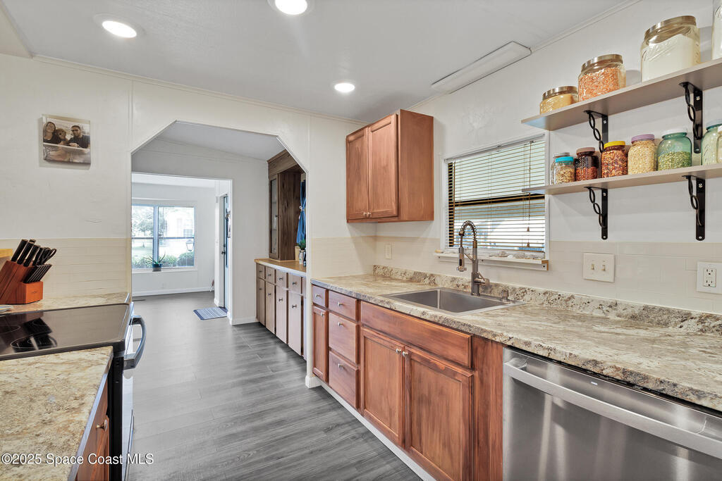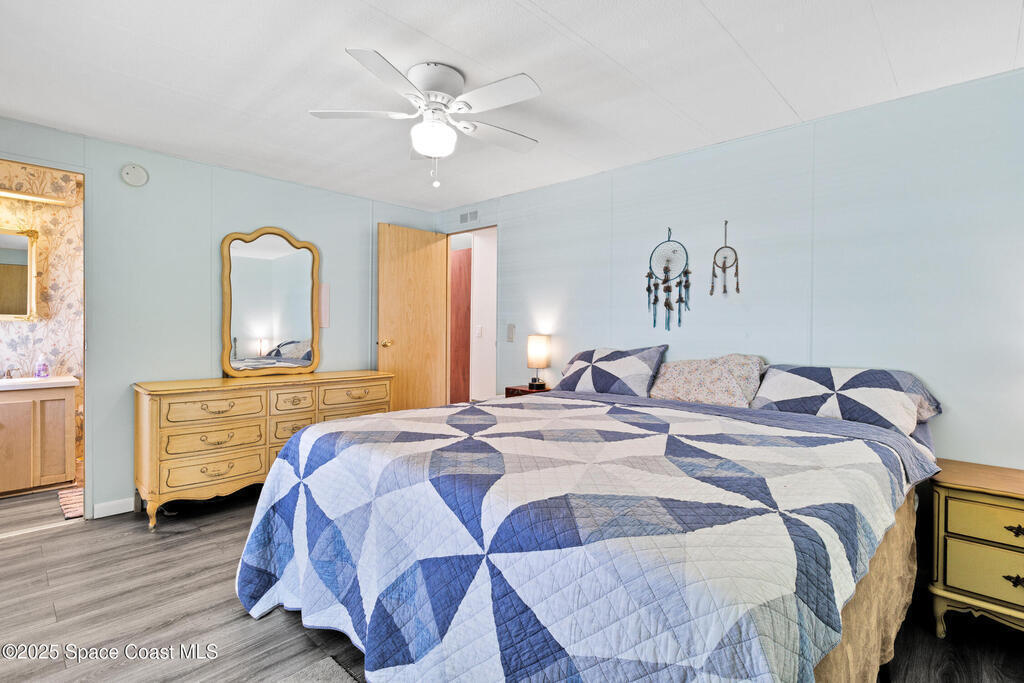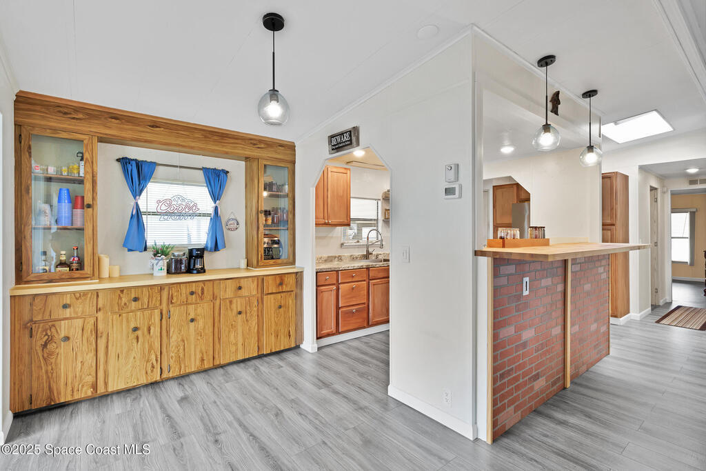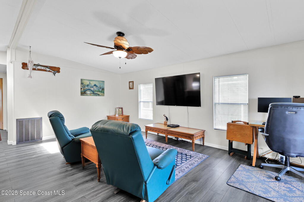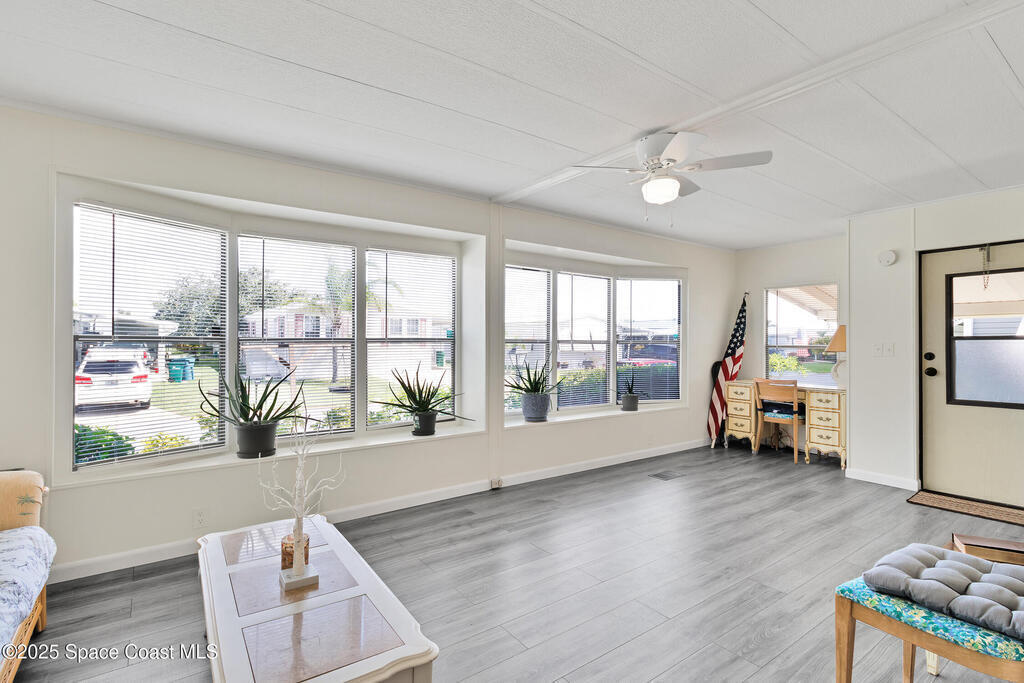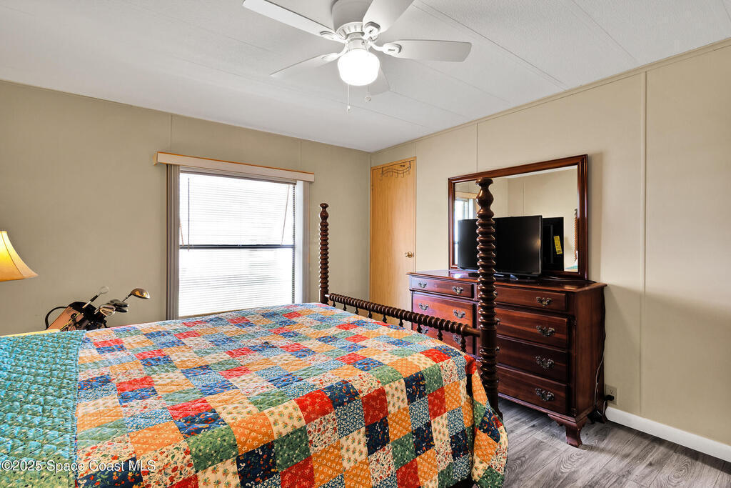 MOTIVATED SELLER! Inviting layout with lots of windows and open floor plan. The kitchen was remodeled and extended in 2023. New cabinets and countertop installed in addition to new stainless steel appliances. New 150-amp electric panel. New vinyl plank waterproof flooring. 5 new ceiling fans. Newer roof. AC 2017. Storm panels & shutters included for your protection. Golf cart and pet friendly community with no lot rent. Lots of amenities and social clubs to keep you busy. Great location in Barefoot Bay and all the way around. Walking distance to the clubhouse and pool and can you believe - you can even watch the shuttle lunches right from your living room?!