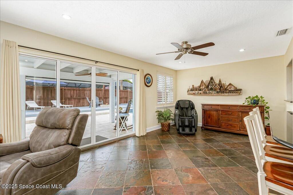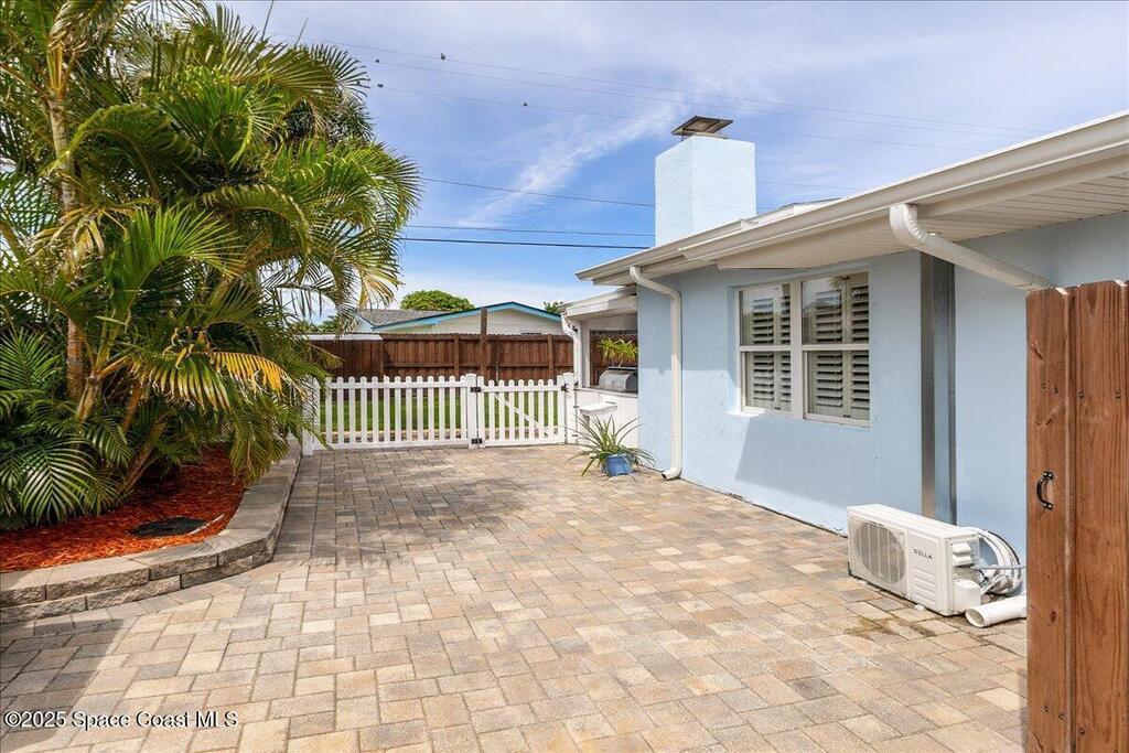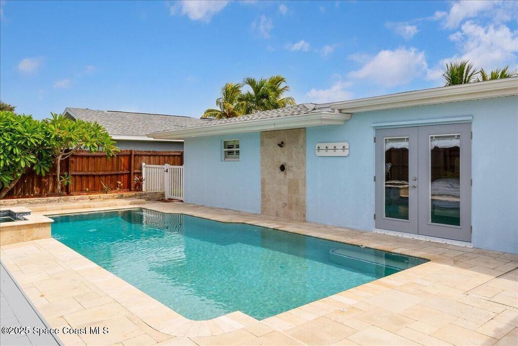 Beautifully updated Satellite Beach 4-bedroom pool home in move-in condition! The backyard is a tropical retreat featuring a large pool and spa, privacy fence, boat/RV parking, and a summer kitchen with TV, sink, fridge, grill, and electric hurricane screen. Enjoy the composite deck, firepit, and ideal entertaining space. Inside features wood and tile floors, plantation shutters, and a dream kitchen with granite, double ovens, gas range, stainless appliances, and bar with pull-out cabinets. Water filtration system under sink. The enclosed family room has a wood-burning fireplace and its own mini-split. Master suite includes French doors to the pool, walk-in closet, jetted tub, and walk-in shower. Major updates: new roof (2024), whole-house replumb, Cat 5 wiring, new pool/sprinkler pumps, tankless water heater. Close to beaches, A-rated schools, shopping, and dining. Simply a stunning beachside retreat you'll love to call home! Must see to appreciate.