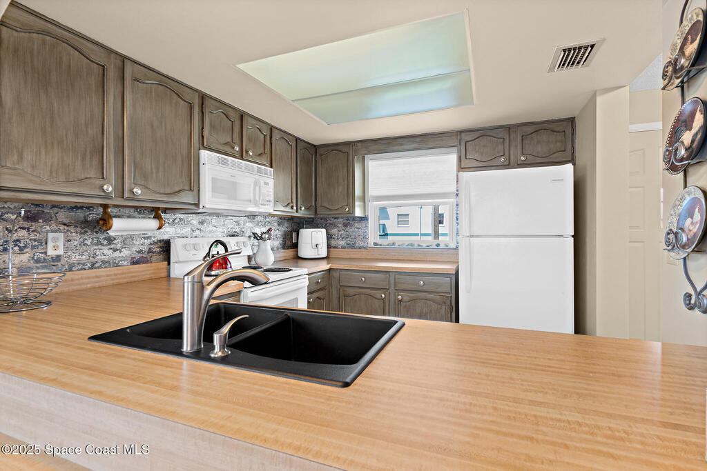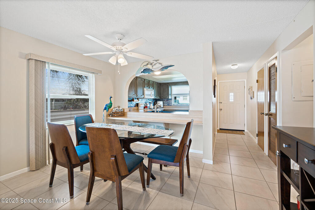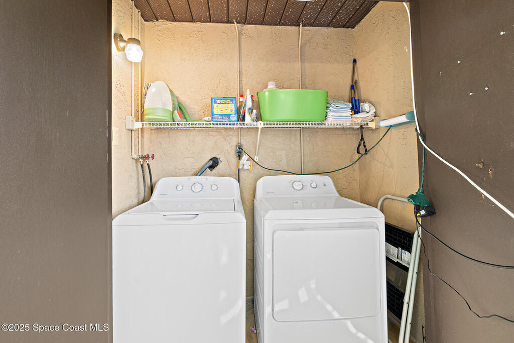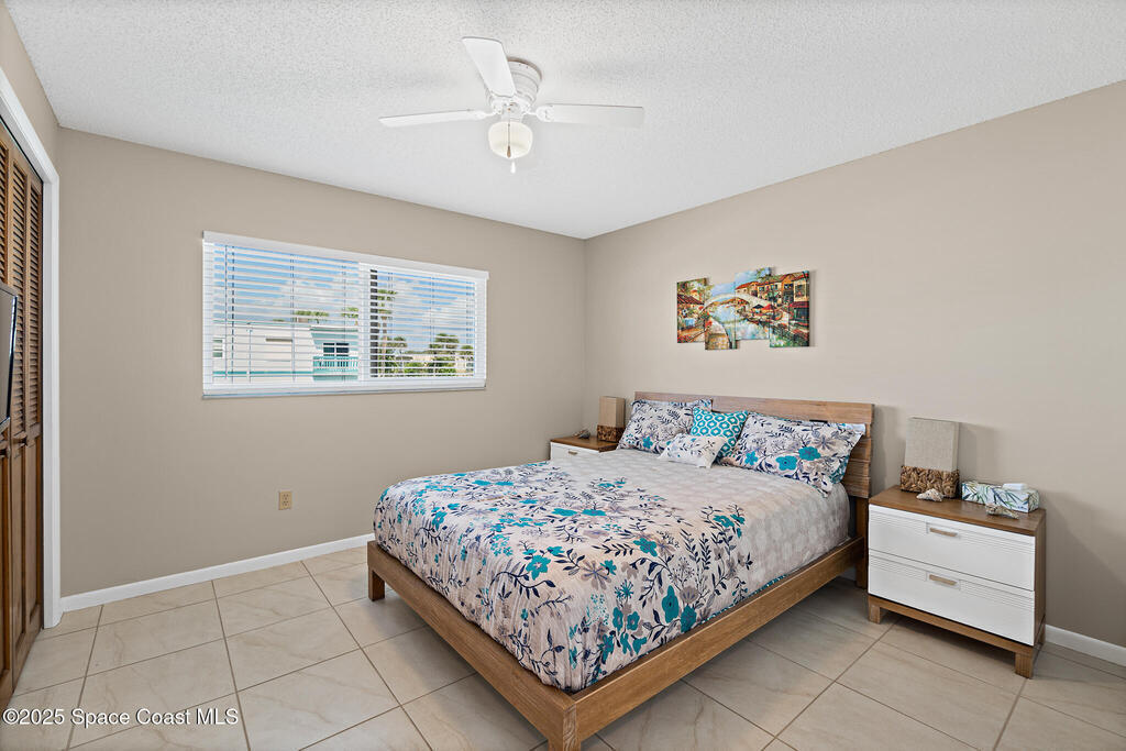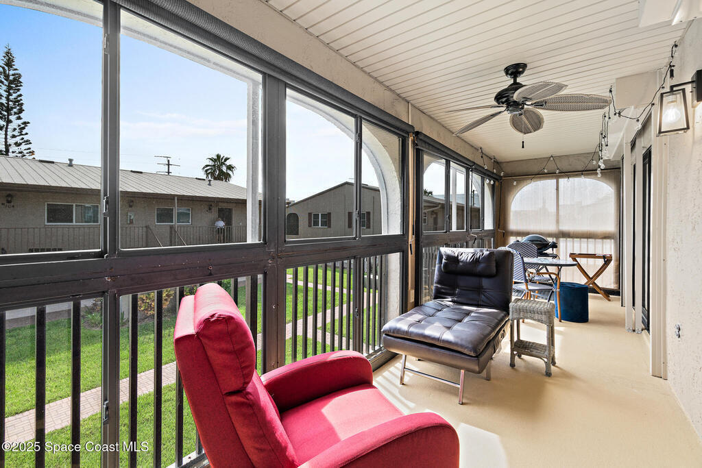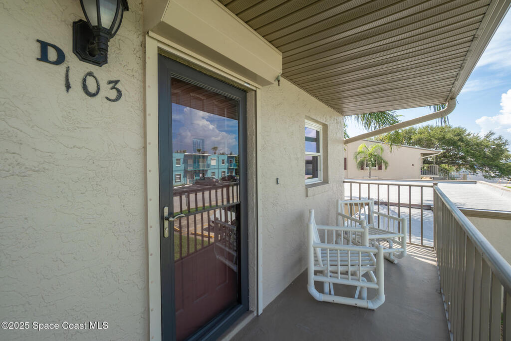 Minutes from the Atlantic Ocean and Port Canaveral, this FULLY FURNISHED 2-bed, 2-bath second-story condo offers the perfect beachside retreat. MOVE-IN READY and beautifully maintained, it features tile flooring throughout, impact windows, electric hurricane shutters, and an open living/dining floor plan. This END-UNIT condo features extra windows and abundant natural light. The split-bedroom layout provides privacy, and the updated kitchen includes a breakfast bar and eat-in space, ideal for entertaining or extended stays. Relax on the private shaded balcony with views of rocket launches. The spacious primary suite features an updated shower and walk-in closet. A new AC unit was installed in 2022 for year-round comfort. Includes a one-car garage with built-in shelving for extra storage. Near vibrant restaurants, nightlife, and entertainment, this immaculate condo offers a rental opportunity or your chance to own a slice of paradise and enjoy the Florida lifestyle year-round.