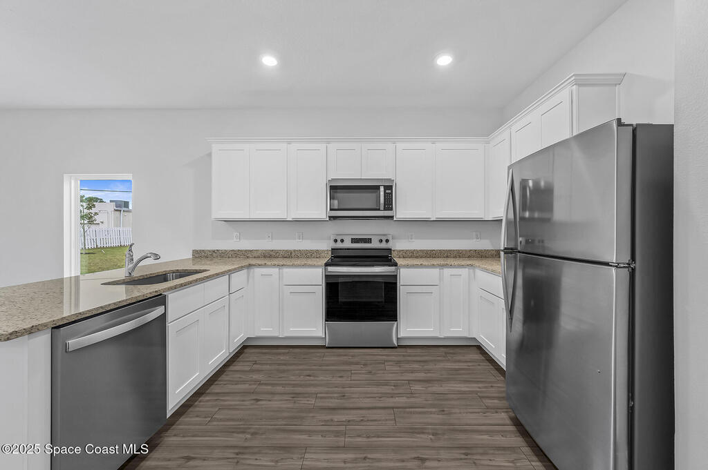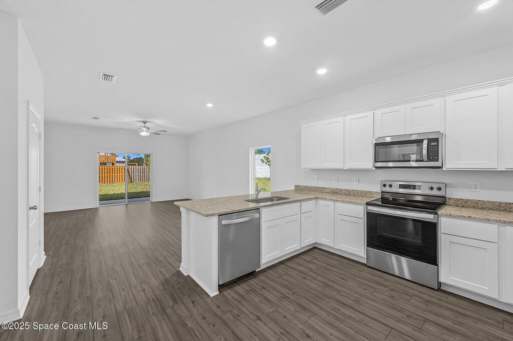 Ask us about our incentives, builder paid closing costs, & no down payment options! The Escambia floor plan serves as a spacious home for families and guests. Featuring an open concept floor plan, the home boasts 4 spacious bedrooms, 2 full bathrooms and is complete with over $10, 000 in upgrades. These include energy-efficient Whirlpool(r) appliances, spacious granite countertops in the kitchen, stunning wood cabinets, brushed nickel hardware and an attached two-car garage. In addition, the Estero's secluded master retreat highlights a large walk-in closet. Best of all, this Palm Bay home offers residents a premier location with convenient access to nearby shopping, golf courses, world-class area beaches and amenity-packed parks. **appliance models are subject to availability**