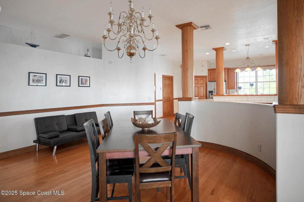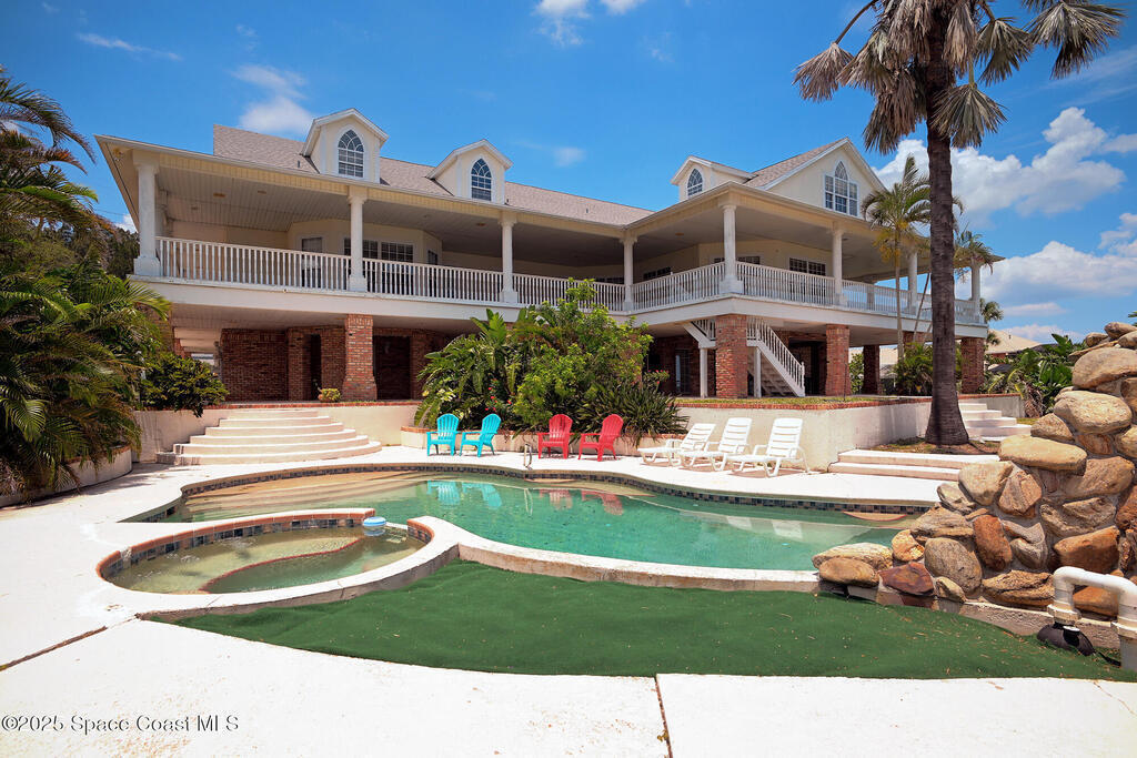 Discover the ultimate waterfront estate on the Indian River, blending luxury and versatility across three stories. Expansive 8-bedroom, 7-bath home features 2 private suites on the first floor w/ multiple kitchens, perfect for multi-generational living or entertaining. Grand great room and gourmet kitchen with massive island flood the space with natural light + river views. Solid oak cabinetry and floors. Primary suite boasts a large bathtub + separate shower, while the 3rd floor offers 3, 000 sq ft of customizable space--ideal for a primary retreat or office. A wrap-around balcony provides breathtaking vistas and seamless indoor-outdoor living. Situated on over an acre w/ 135 ft of river front. Enjoy outdoor kitchens, a heated pool, and ample parking in the attached and detached garages. Conveniently located near beaches, I-95, Patrick Space Force Base, Viera shops and fine dining, this estate offers a serene lifestyle. Third floor is not furnished. Pets considered on case base basis.