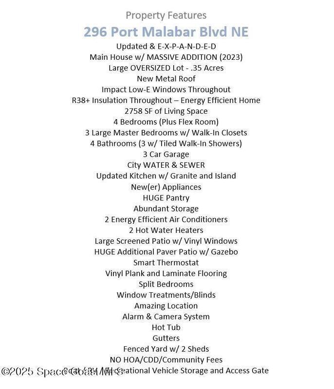 New Owner Wanted! Updated & E-X-P-A-N-D-E-D! Main House w/ MASSIVE ADDITION (2023)! Large OVERSIZED Lot - .35 Acres! New Metal Roof! Impact Low-E Windows Throughout! R38+ Insulation Throughout - Energy Efficient Home! 2758 SF of Living Space! 4 Bedrooms (Plus Flex Room)! 3 Master Bedrooms w/ Walk-in Closets! 4 Bathrooms (3 w/ Tiled Walk-In Showers)! 3 Car Garage! City WATER & SEWER! Updated Kitchen w/ Granite and Island! New(er) Appliances! HUGE Pantry! Abundant Storage! 2 Energy Efficient Air Conditioners! 2 Hot Water Heaters! Large Screened Patio w/ Vinyl Windows! HUGE Additional Paver Patio w/ Gazebo! Boat / RV / Recreational Vehicle Storage and Access Gate! Smart Thermostat! Vinyl Plank and Laminate Flooring! Split Bedrooms! Window Treatments/Blinds! Amazing Location! Alarm & Camera System! Hot Tub! Gutters! 2 Large Sheds! NO HOA/CDD/Community Fees! *SOME RESTRICTIONS APPLY / SUBJECT TO CHANGE*