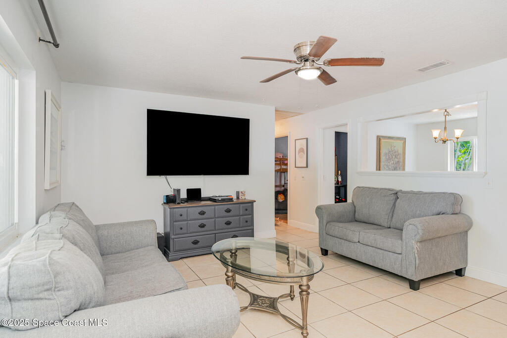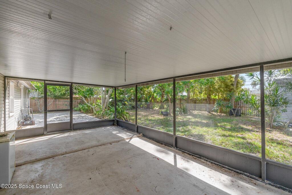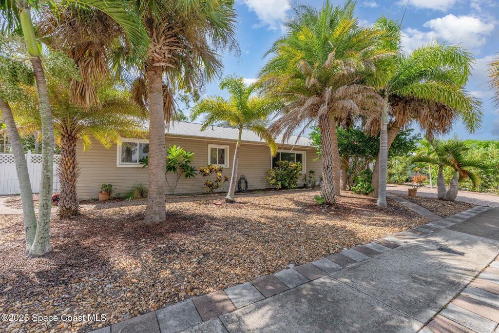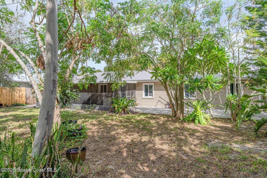 Welcome to your beachside family home! Step inside to an updated kitchen, perfect for family meals and entertaining. The home features a metal roof and hurricane-rated windows, providing peace of mind year-round. Enjoy Florida's sunshine from the screened-in back porch or host gatherings on the expansive additional patio. Outdoors, you'll find a spacious shed with electricity, ideal for hobbies or extra storage. The lush yard is shaded with mature trees, (See below) while the paver driveway and side parking pad offer room for even a small boat. In the back, a serene waterway invites you to paddle board, fish, or simply take in the natural beauty of your surroundings. Just minutes from the beach, this home has the laid-back charm of coastal living. Various trees include, a verity of palms, maringa, fig, birds of paradise, mulberry, banana, coconut, strawberry, spinach, gardenia, multiple colored plumeria's.