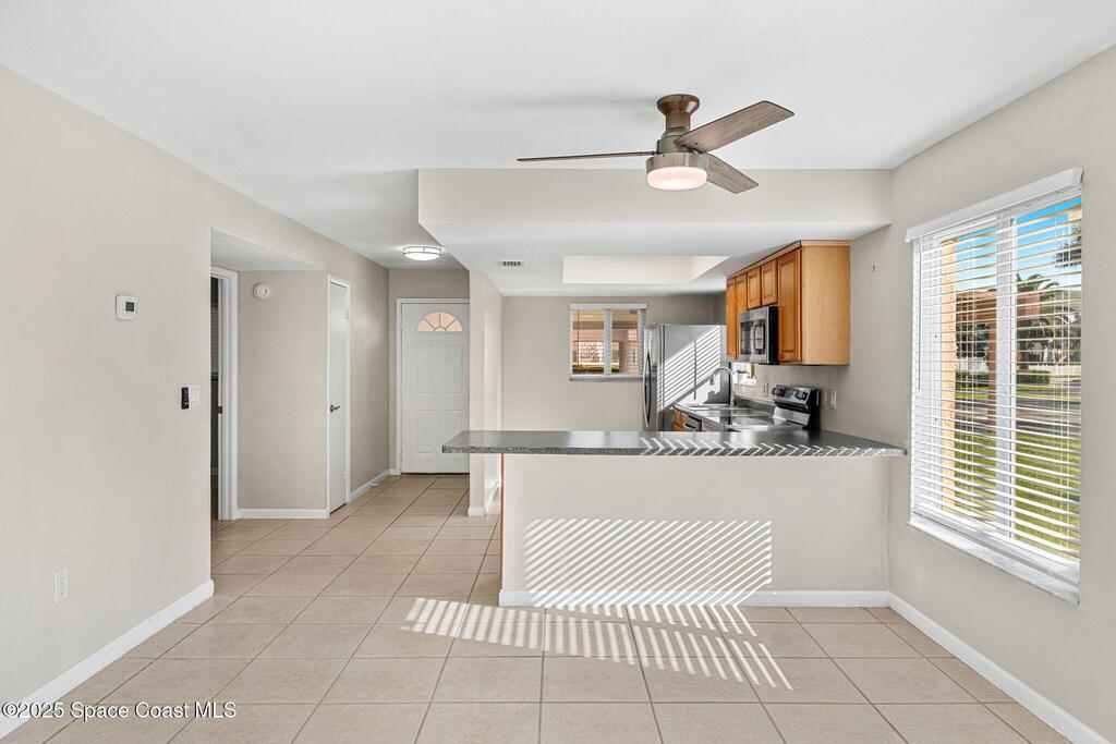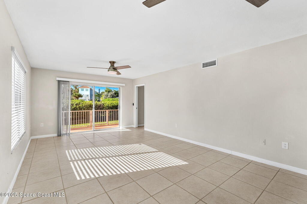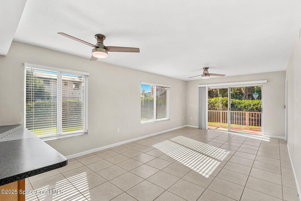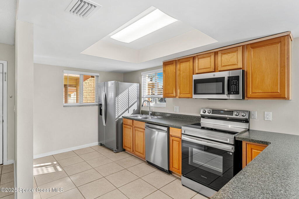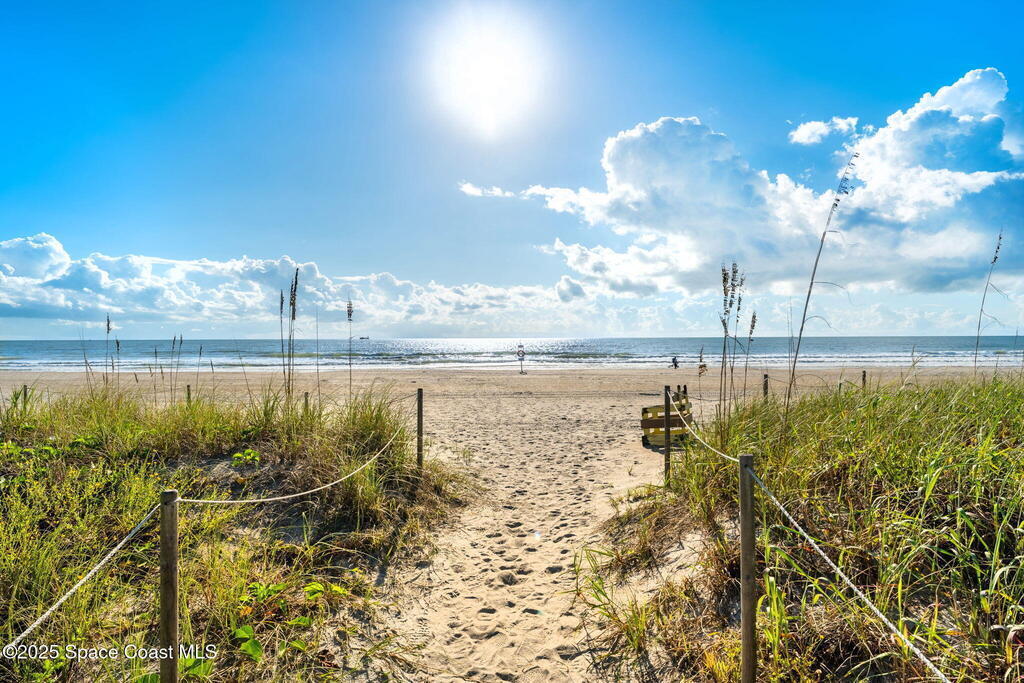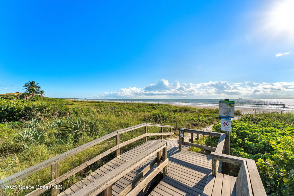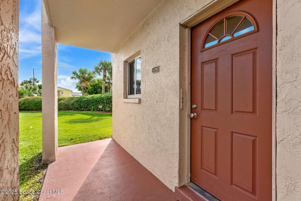 GROUND FLOOR CAPE CANAVERAL 2/2 WITH LOTS OF NATURAL LIGHT...ONLY 500 STEPS TO THE BEACH AND NO ROADS TO CROSS!!! This ground floor 2/2 features all tile flooring, wood cabinets, stainless appliances, and new paint throughout. It's the easternmost end unit with multiple large windows and sliders leading to a spacious private patio in an oceanfront community with a pool and covered parking. The side yard to the unit is beautifully green with privacy hedges lending the feel of having your very own slice of paradise with ocean breezes and sounds passing through. The primary bedroom has a beautiful new vanity and boasts a walk-in closet and tiled walk-in shower. Washer and Dryer in unit. Super convenient to Space Center and 528. Walk to Cape View Elementary. NO SMOKING IN UNIT OR PATIO. Also, Association does NOT allow pets. Available Now.