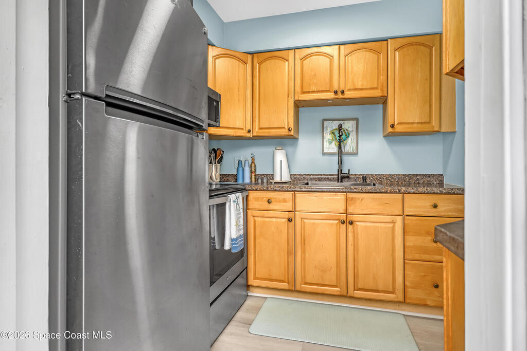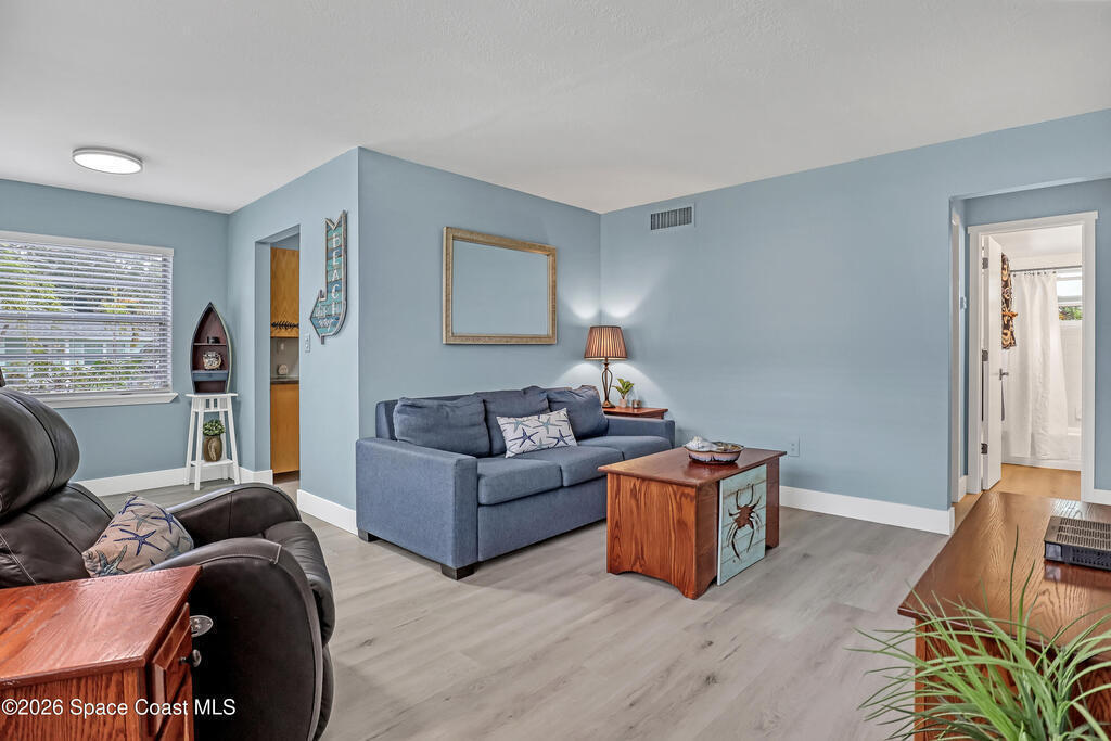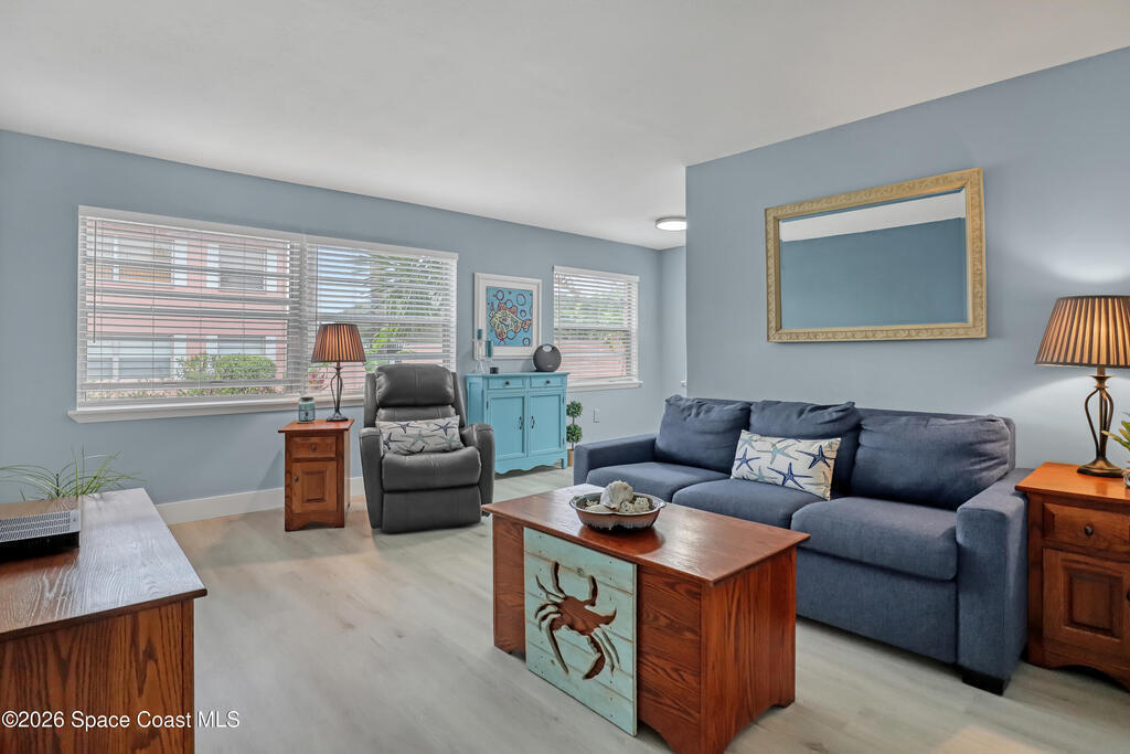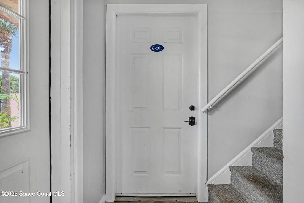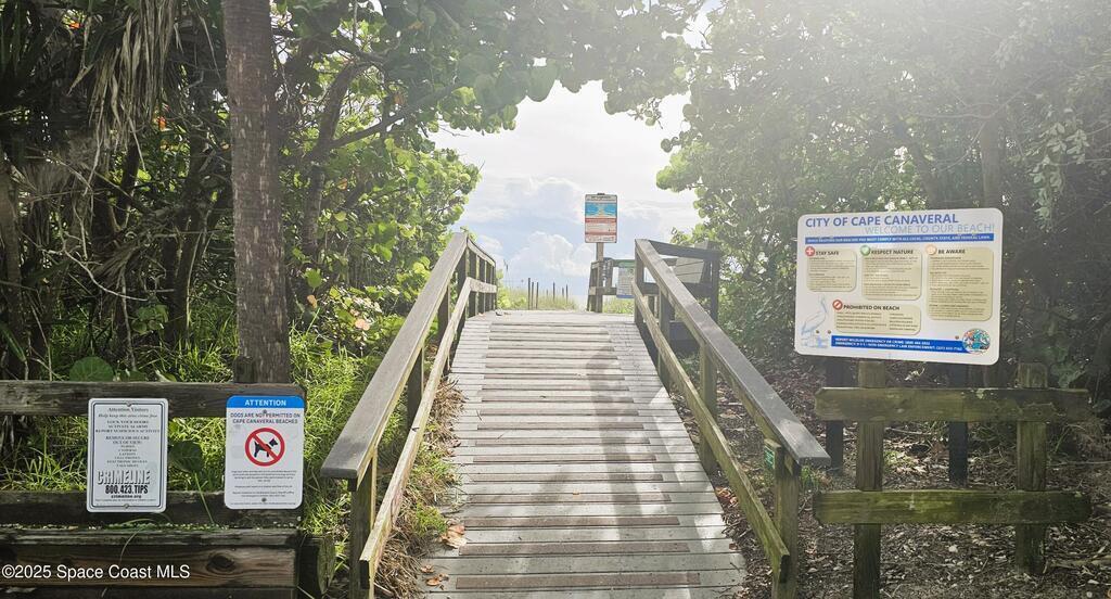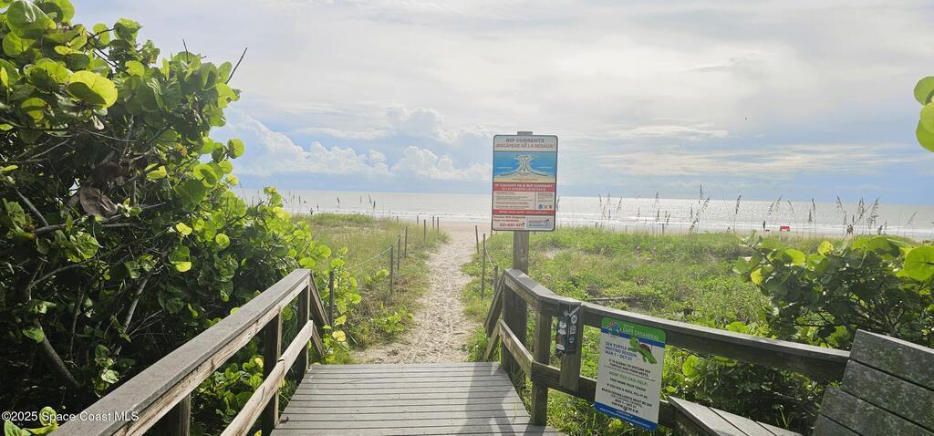 Feel the ocean breeze in this tastefully updated beachside condo, perfectly situated in a gated community just a short distance from the shore! This desirable first-floor unit radiates pride of ownership with updates throughout, including: new flooring, baseboards, paint, closet doors, and fixtures. Stylish new vanity and modern finishes. 2019 instant hot water heater and updated 100-amp electrical panel.BONUS FEATURE: guests can arrive through the landscaped gated commons area or enjoy the convenience of direct access from the assigned parking space to your private kitchen entry--complete with a charming sitting area just outside the door of this private corner unit. 2018 roof and impact windows in the bedroom and bathroom for peace of mind.Enjoy the ultimate coastal lifestyle--just a short stroll to the beach, dining, cruise ships space center, surf shops and all that this sought-after area has to offer. And within 45 minutes from two major Airports (Orlando & Melbourne).