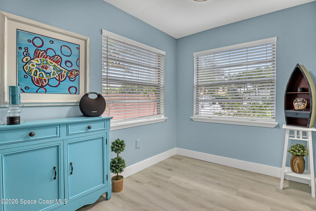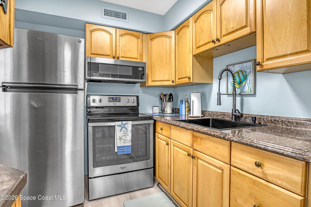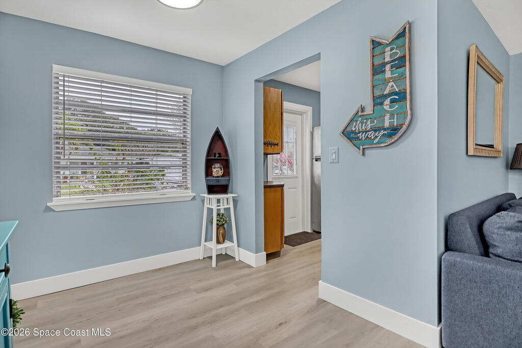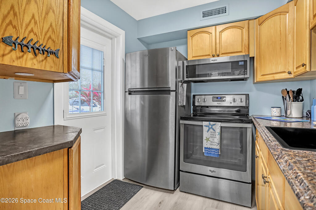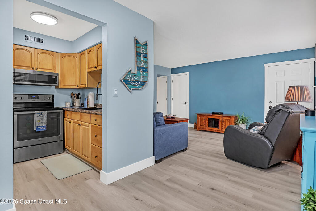 Feel the ocean breeze in this tastefully updated beachside condo, perfectly situated in a gated community just a short distance from the shore! This desirable first-floor unit radiates pride of ownership with updates throughout, including: new flooring, baseboards, paint, closet doors, and fixtures. Stylish new vanity and modern finishes. 2019 instant hot water heater and updated 100-amp electrical panel.BONUS FEATURE: guests can arrive through the landscaped gated commons area or enjoy the convenience of direct access from the assigned parking space to your private kitchen entry--complete with a charming sitting area just outside the door of this private corner unit. 2018 roof and impact windows in the bedroom and bathroom for peace of mind.Enjoy the ultimate coastal lifestyle--just a short stroll to the beach, dining, cruise ships space center, surf shops and all that this sought-after area has to offer. And within 45 minutes from two major Airports (Orlando & Melbourne).