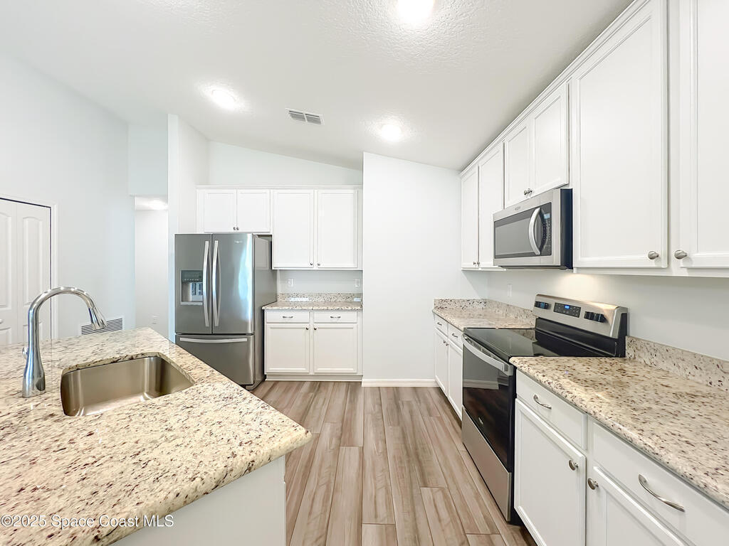 Fantastic Lakefront four Bedroom, two Bathroom, two car garage , CBS home in sought after Bayridge community! Why wait for new construction?Built by Holiday in 2020 with tons of upgrades, this home is move in ready. Fantastic open floor plan with great lake views combined with four bedrooms make this home perfect for families that need a little extra space. Primary suite features an amazing bathroom, door to back patio and a walk in closet. Chefs will love the kitchen with stainless steel appliances, center island with sink, upgraded cabinets and granite countertops. Close to dining and shopping in nearby Bayside Lakes, this south west Palm Bay home is a dream come true. Outside Air Conditioner just replaced, full gutters, irrigation system, fully landscaped and hurricane shutters all included. Why wait ?