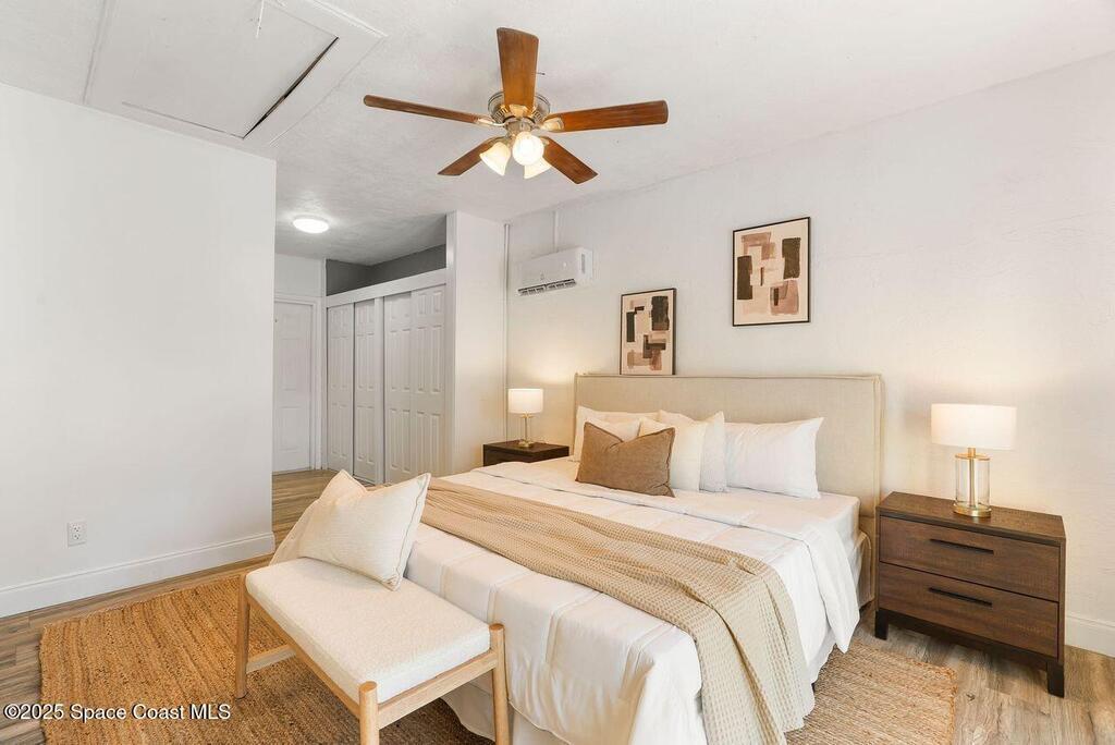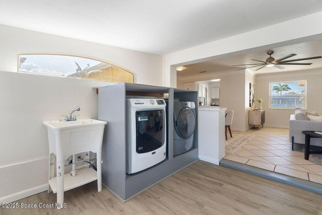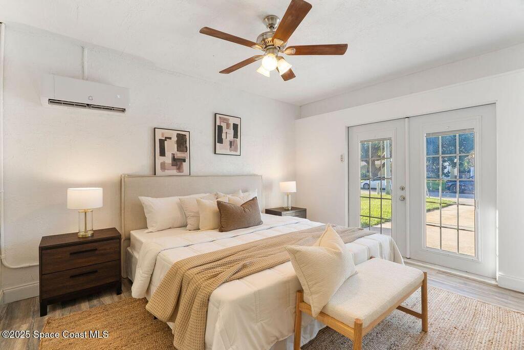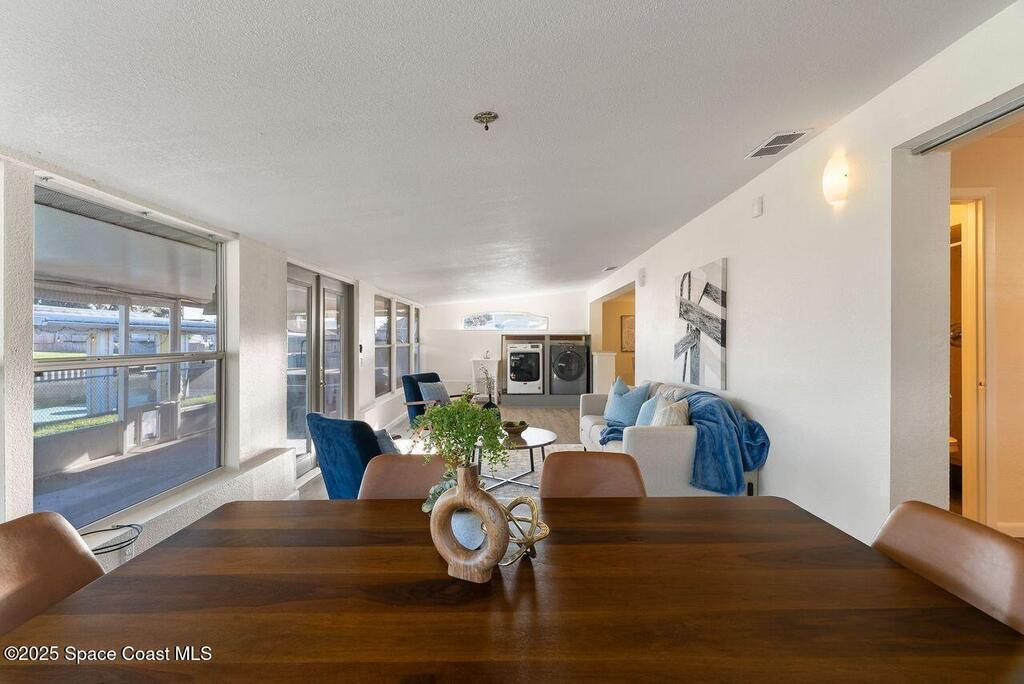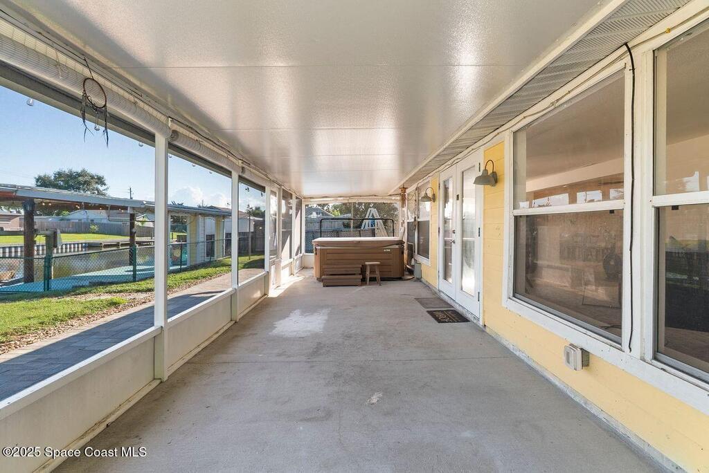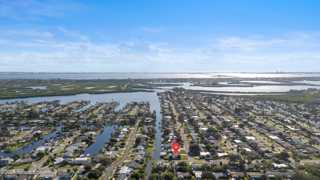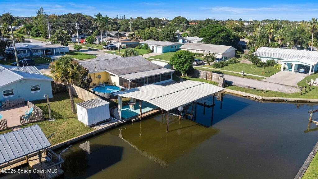 Waterfront Paradise! Located on a deep, navigable canal to Sykes Creek, this immaculate concrete block home is a dream for boaters, entertainers, and AirB&B investors! Enjoy breathtaking sunrises and sunsets from your oversized covered dock with lift, dining area, and room to relax while watching dolphin and manatee. The bright, open layout features two spacious master suites: one with a remodeled bath and a bonus room perfect for a game or family room. New luxury vinyl plank flooring (2025) in all bedrooms and Florida room. Main master includes a walk-in closet and direct Florida room access. Outdoors, enjoy a fenced corner lot, large screened patio, and private above-ground pool in a lush tropical setting. Community waterfront park with tennis, basketball, and playground. No HOA! Centrally located in Merritt Island, ideal for full-time living, winter escape, or vacation rental!