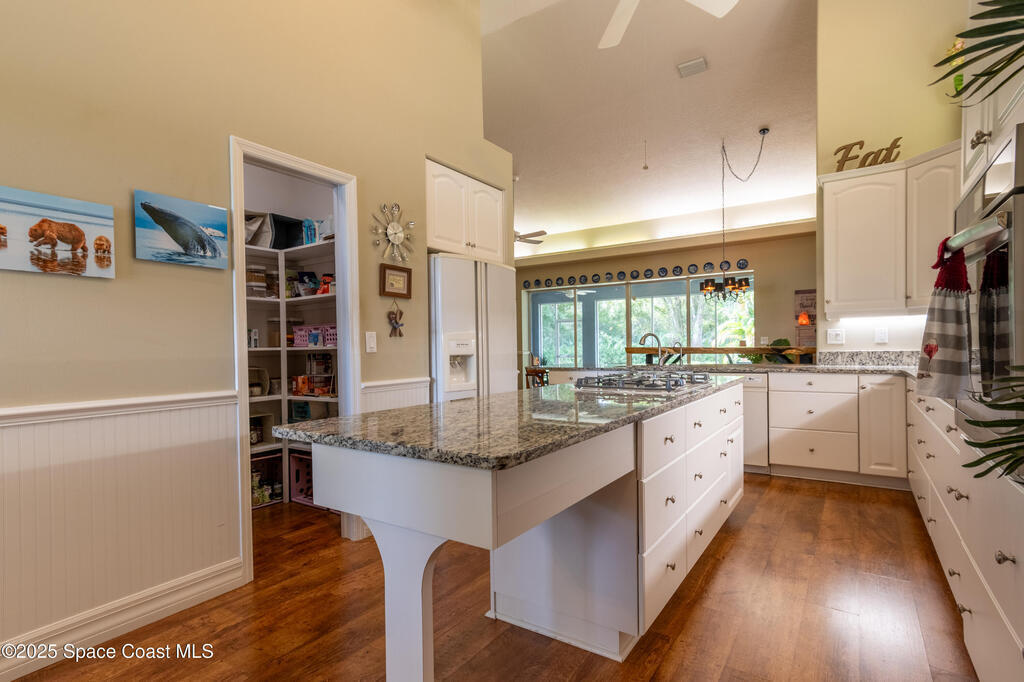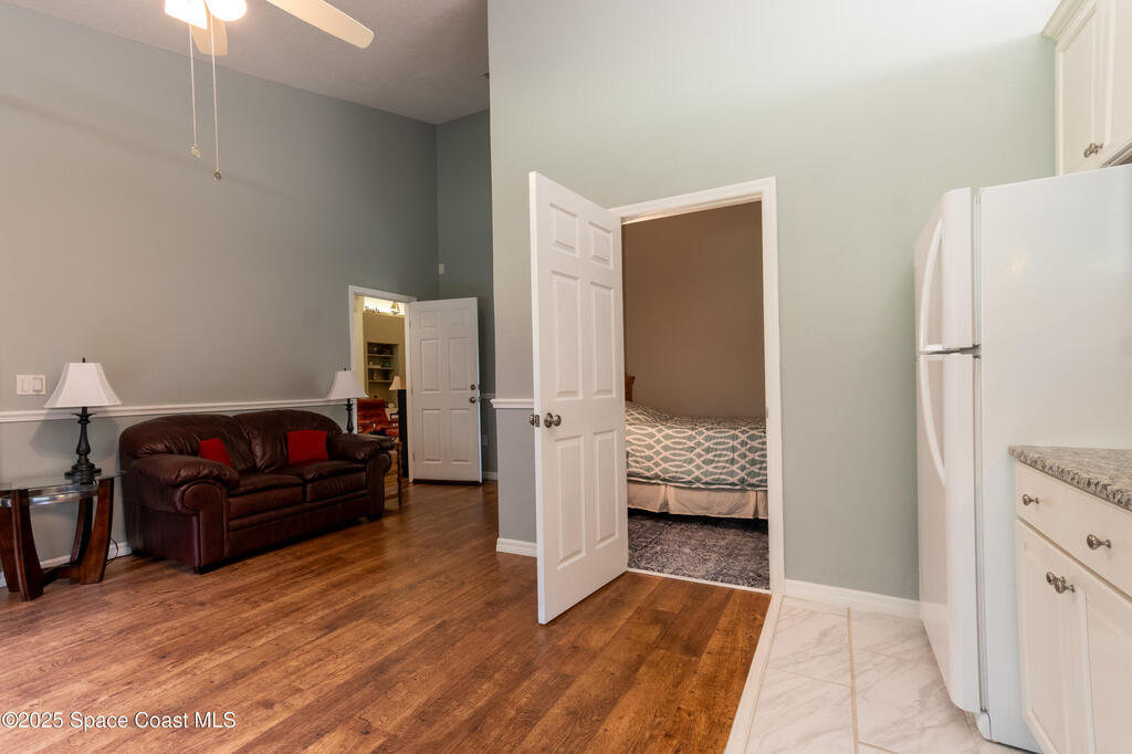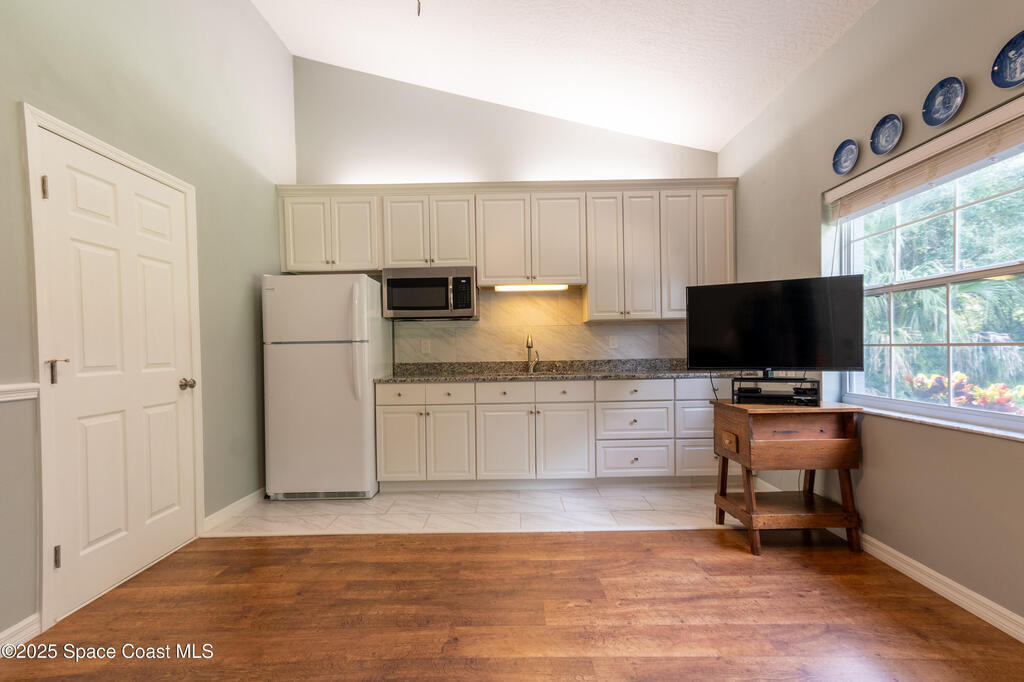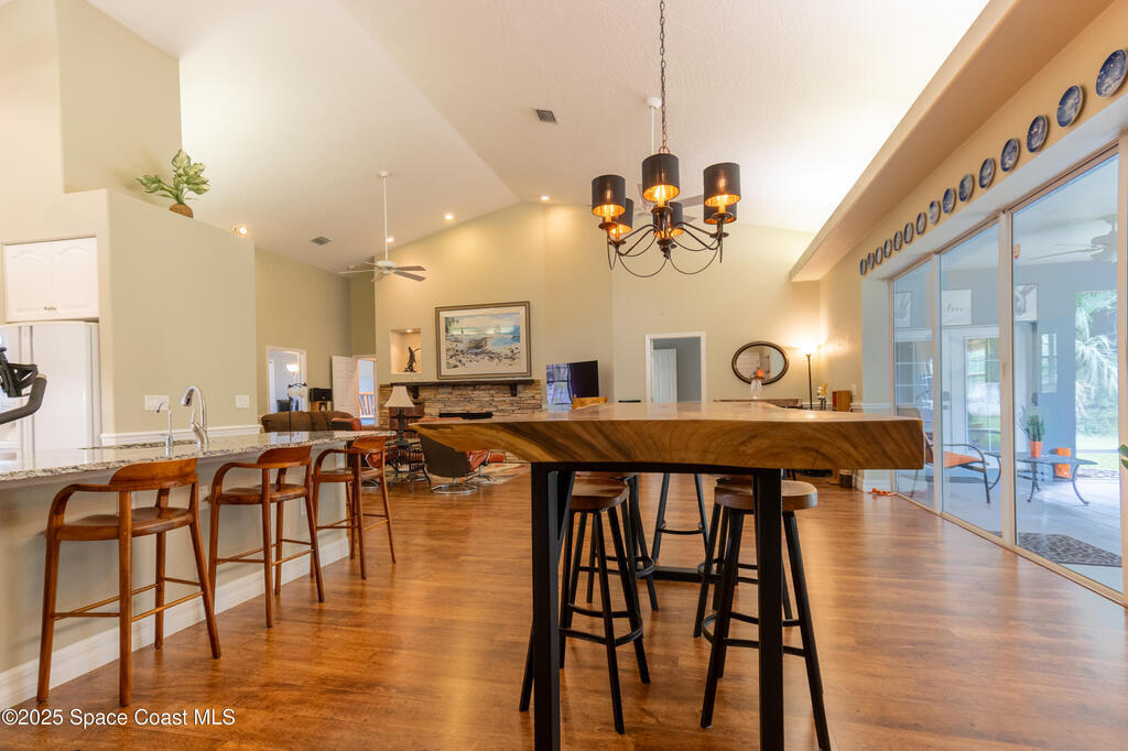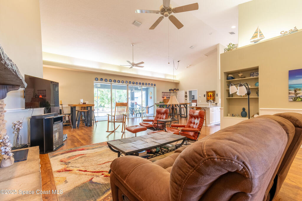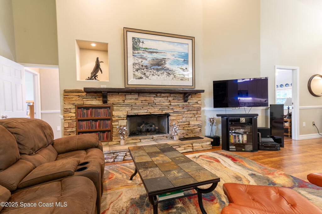 Custom home in highly sought after Lake Forest at Bayside Lakes. 4 bedrooms, 2 full baths. Office. Fitness room. 2nd living room & kitchenette. Huge open concept living room with a soaring 14 foot cathedral ceiling. A sliding glass pocket wall opens to a large 11 x 23ft covered & screened patio, perfect for entertaining. A gourmet kitchen with breakfast bar, eat-in nook, & granite countertops flows into the dining room and great room, with a beautiful stone fireplace. Huge vaulted master suite with 2 walk-in closets, 2 vanities, whirlpool tub and large walk-in shower. The home is configured with an in-law suite that locks-off from the main living space and has a separate entrance. Includes bedroom, bath, office, living room, & kitchenette. Allows you to host relatives & friends while still maintaining your privacy in the main living space. High-end details include: Whole-house generator. Central vacuum system. Under-sink water filtration system.