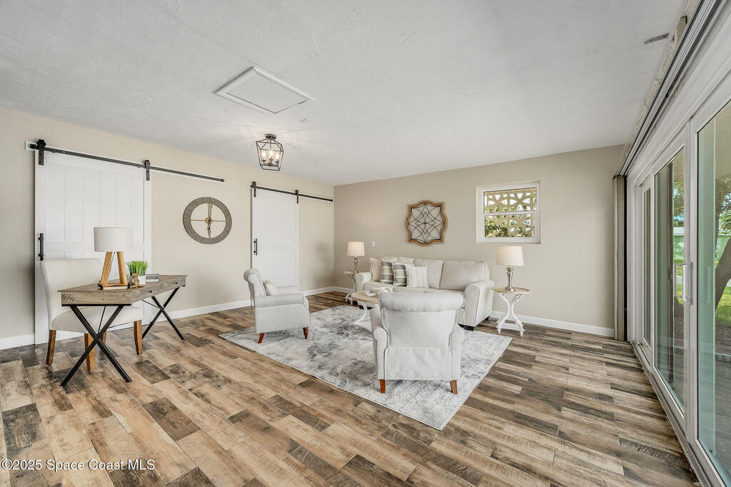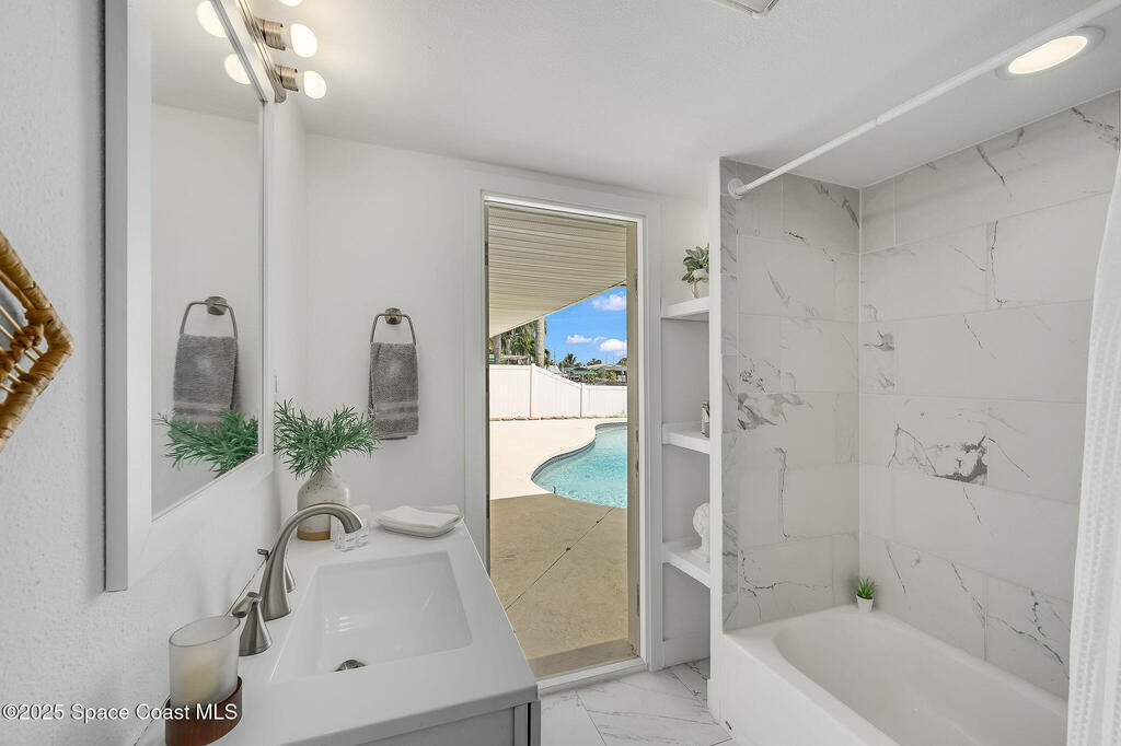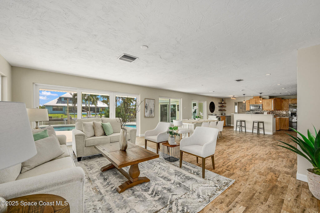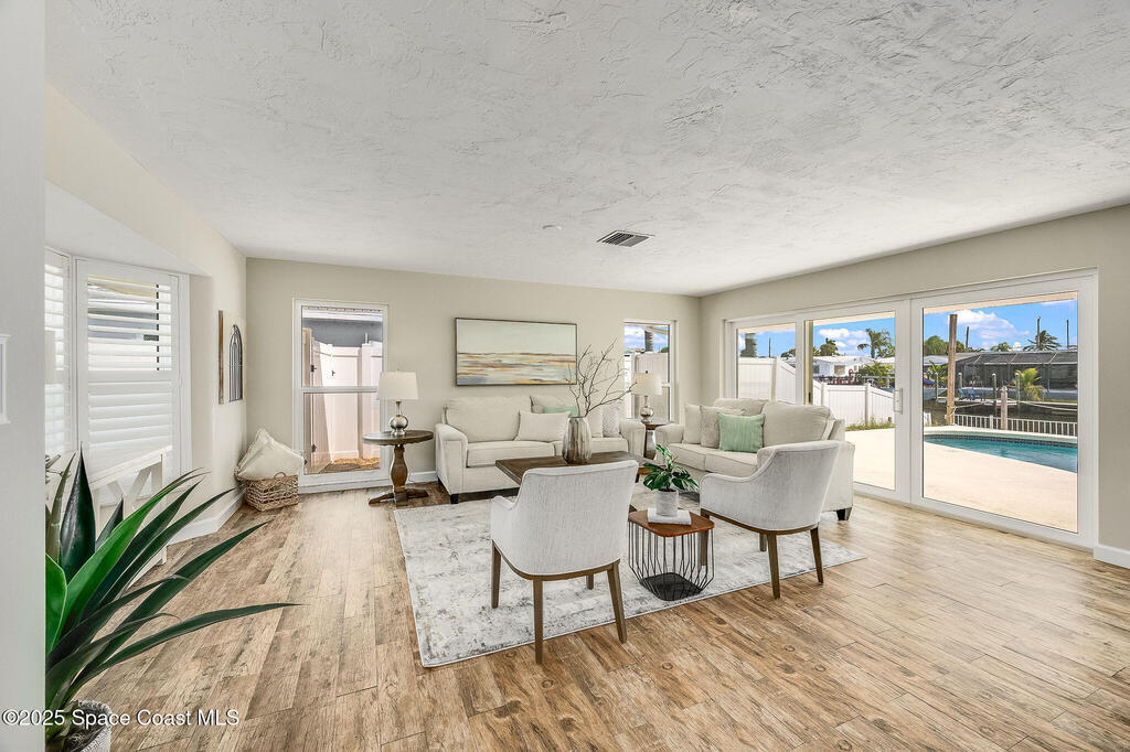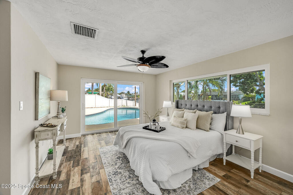 Experience coastal elegance in this stunning sanctuary. Nestled on a deep-water, wide, canal, this waterfront retreat offers breathtaking views, sunsets and direct boating access to the Banana and Indian Rivers. The backyard oasis features a sparkling pool with serene water vistas, perfect for relaxing or entertaining. Inside, an open concept design flows seamlessly through the kitchen, living, and dining areas, all capturing panoramic water views. A spacious 19x17 bonus room offers endless possibilities--ideal for a home office, gym, or additional bedroom that could also be turned back into a two car garage. The luxurious primary suite provides a private waterfront escape with an elegant en-suite bath. Peace of mind is ensured with all hurricane impact windows and sliders installed recently. Embrace Florida's coastal lifestyle at its finest in this exceptional residence. Roof 2014, windows and sliders 2023, deck, dock addition and seawall 2007.