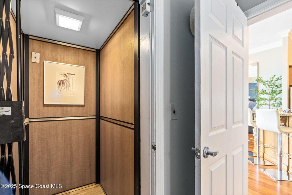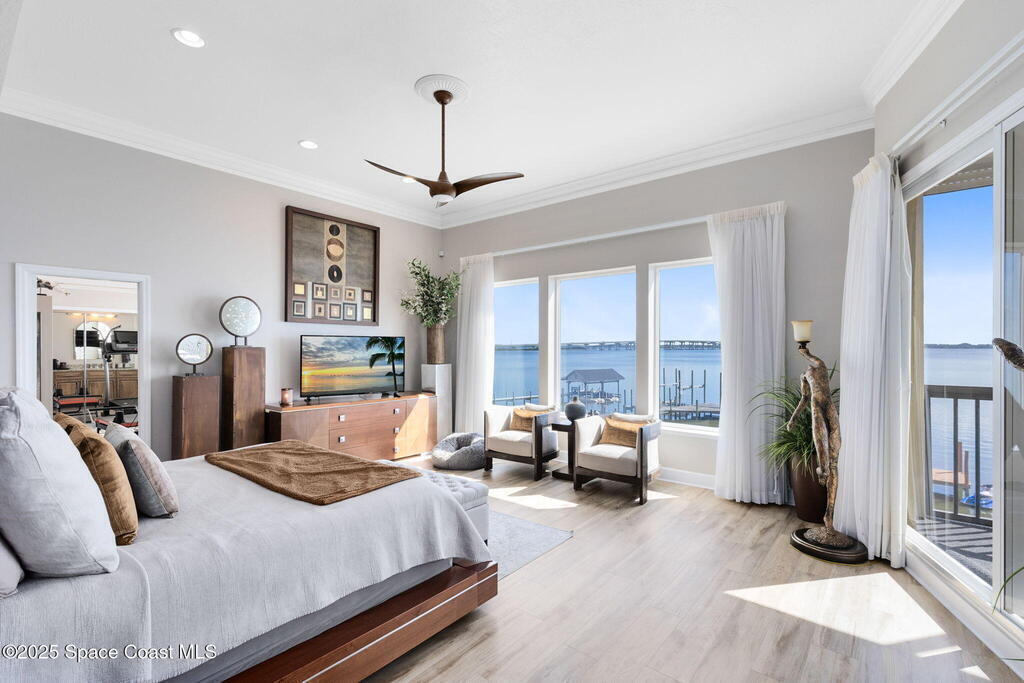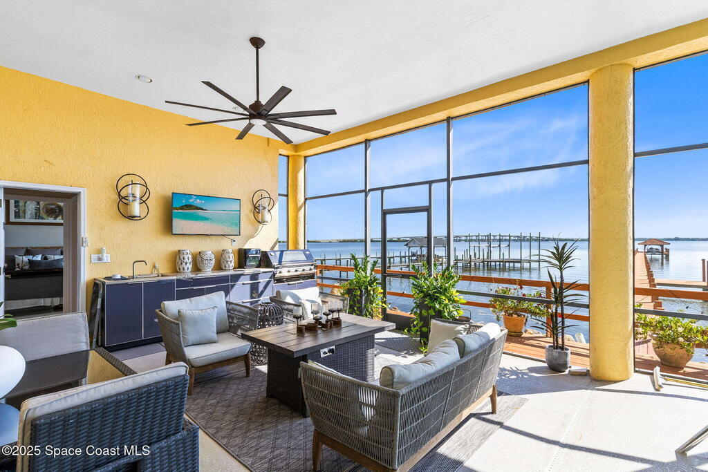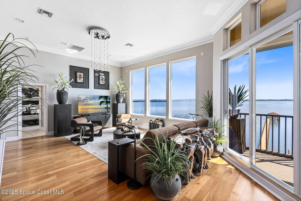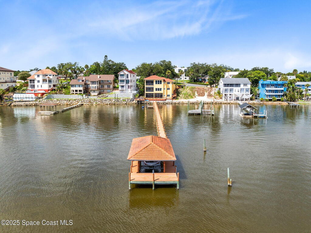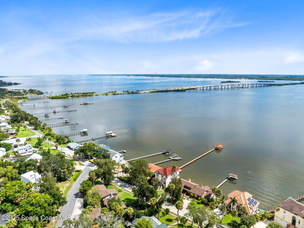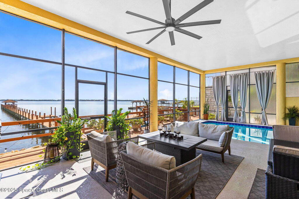 Welcome to your riverfront sanctuary on the Indian River. This estate offers comfort, style, and panoramic views in a golf cart-friendly neighborhood just minutes from Cocoa Village, with beaches and Cape Canaveral only 10 minutes away. Enjoy a private dock and sandy beach for boating, paddleboarding, or fishing. A year-round indoor pool with floor-to-ceiling windows frames endless river views, while a theatre room is perfect for movie nights. Expansive glass walls, soaring ceilings, and custom finishes connect indoor luxury to outdoor beauty. Every room captures dolphins, sunrises, and rocket launches. Multiple screened balconies invite morning coffee or evening cocktails. The gourmet kitchen features top-tier appliances, and spa-inspired baths add to the retreat feel. The home includes a new generator and automatic hurricane shutters.