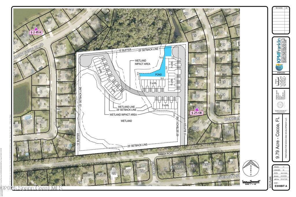 10 Acre Multi-Family Residential Vacant Lot in a desirable area of Cocoa, off Grissom Parkway & Ranch Road, just a 5-minute drive to I-95. Rezoned in 2019 for up to 49 units with a BINDING Development Agreement with Brevard County. Develop either single-family homes or townhomes, attached or detached, up to 5 units/acre, & a 26' max height (2-story maximum). Setbacks include a 15' buffer on the rear where the parcel abuts the adjacent subdivision; 25' setback from the internal parcel road to the house or townhouse; some interior wetlands; buyer must do their own due diligence. Capitalize on the growing population in Brevard County, aka the Space Coast of Florida, home of frequent rocket launches, beaches, rivers, a budding restaurant scene, & so much more!