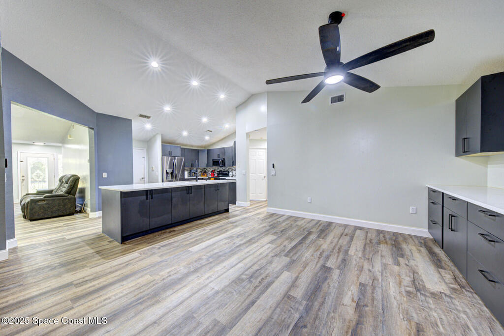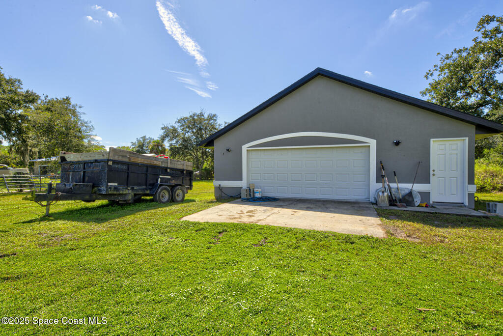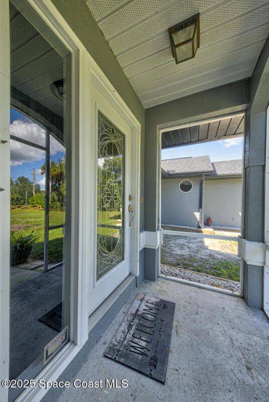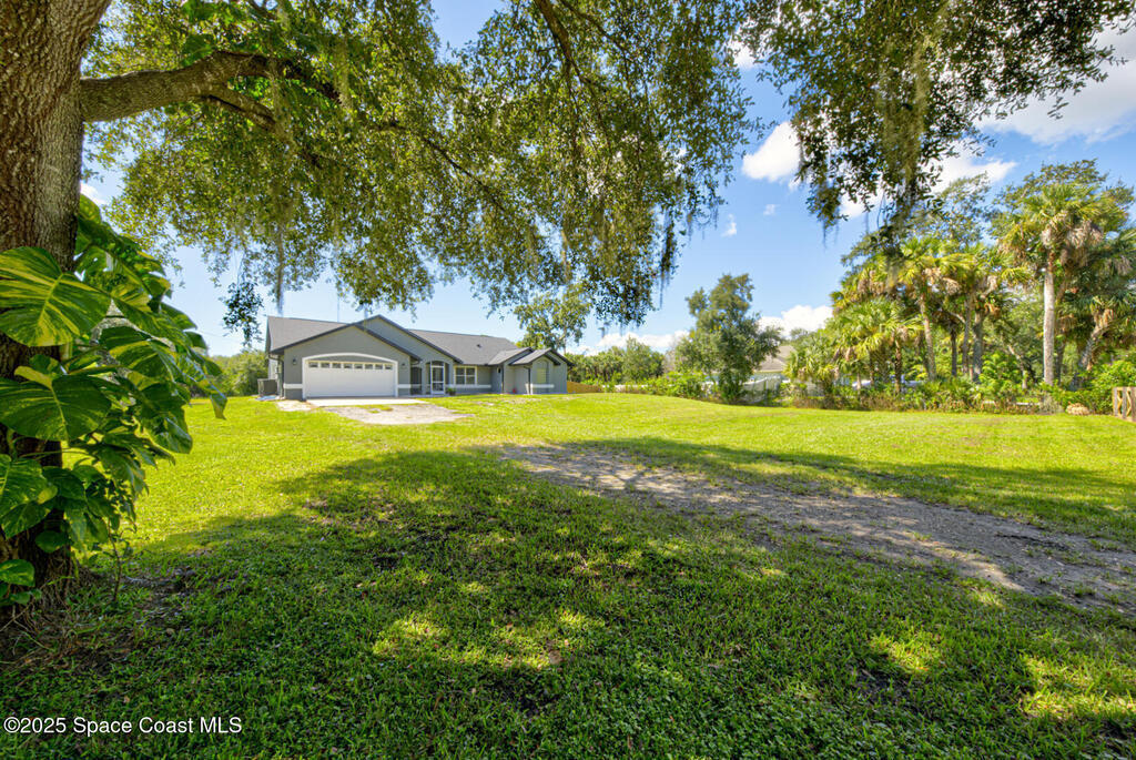 Beautifully updated 3 Bedroom 2 Bath 4 Car Garages (2 car attached & 2 car detached) w/ detached workshop located on 1 acre lot in Canaveral Groves. This home has plenty of room w/ 2644 sqft under air (enclosed porch for family room) 3161 sqft under roof plus a detached 30x30 garage/workshop. Offers open floor plan, vaulted ceilings, split plan, new remodeled gourmet eat-in chef's kitchen w/black SS appliances double oven range w/built in air fryer, custom cabinetry, pantry, huge island & quarts countertops. New LVP flooring throughout home, new bathroom vanities, faucets & drains, Roof replaced 2023, new gutters 2023, new 18 seer AC 2019, 2 mini splits added 2024, New water heater 2024, exterior paint 2025, septic emptied 2024, whole house solar powered (solar panels 20 yr warranty - $278.54 monthly & for the entire lease term). Detached garage/workshop roof replaced 2023, garage door replaced 2025, workshop has 100 amp service and 220 power. Property cleared and fenced
