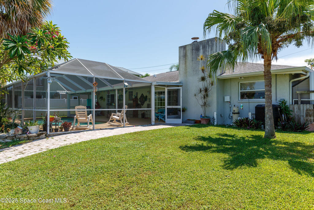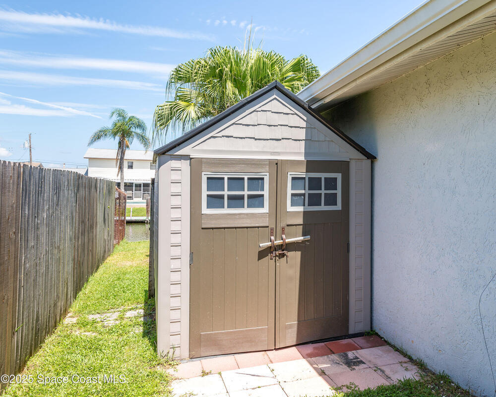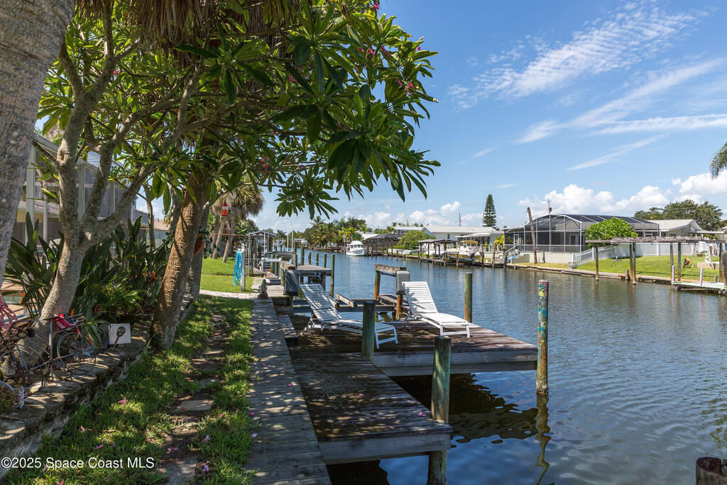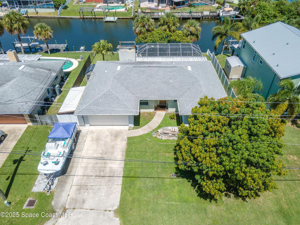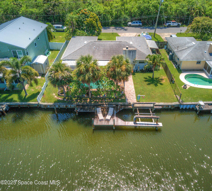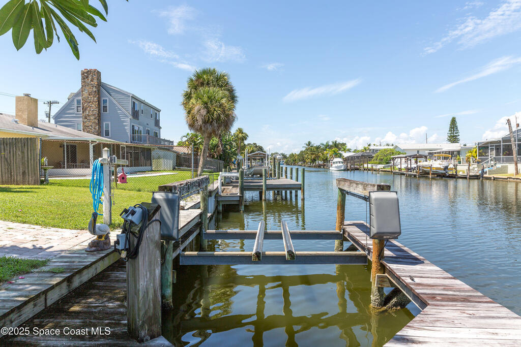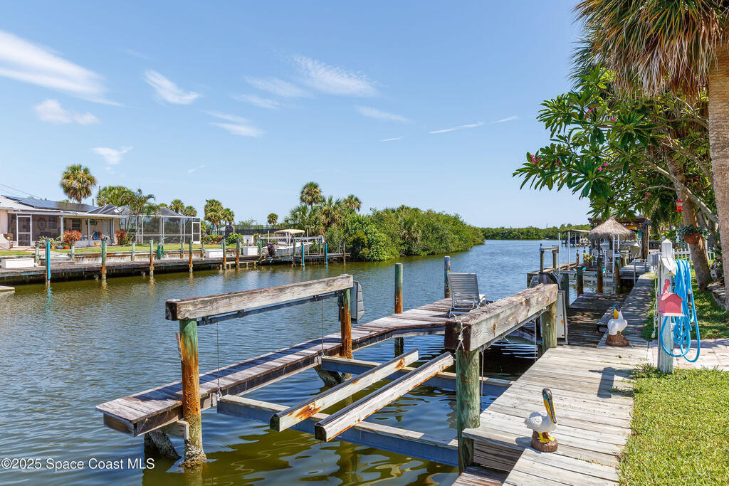 SIGNIFICANT PRICE ADJUSTMENT! SELLER MOTIVED! LET'S GET CREATIVE! PERFECT WATERFRONT LOCATION on Sykes Creek! Beautifully updated 4 bed/2 bath ranch-style home offers gorgeous water views and direct access to wide, deep-water canal living. Enjoy 75 ft of double-reinforced seawall, 11, 000lb boat lift with water & electric, heated saltwater pool with a large screened lanai, plus hurricane impact-rated windows and sliders throughout. Major updates include a 1-yr-old A/C system and brand-new roof installed April 2025! Inside you'll find luxury vinyl flooring with 5.2'' baseboards, a renovated master bath featuring frameless glass doors, custom tiled walk-in shower with multiple shower heads, and a pavered parking pad for boat, RV, or toys. NO HOA, NO deed restrictions, and LOW flood insurance, this home delivers both value and peace of mind. Ideally situated on Sykes Creek's point, you'll enjoy a great day of boating and quick access to nearby islands for beach days! Don't Wai