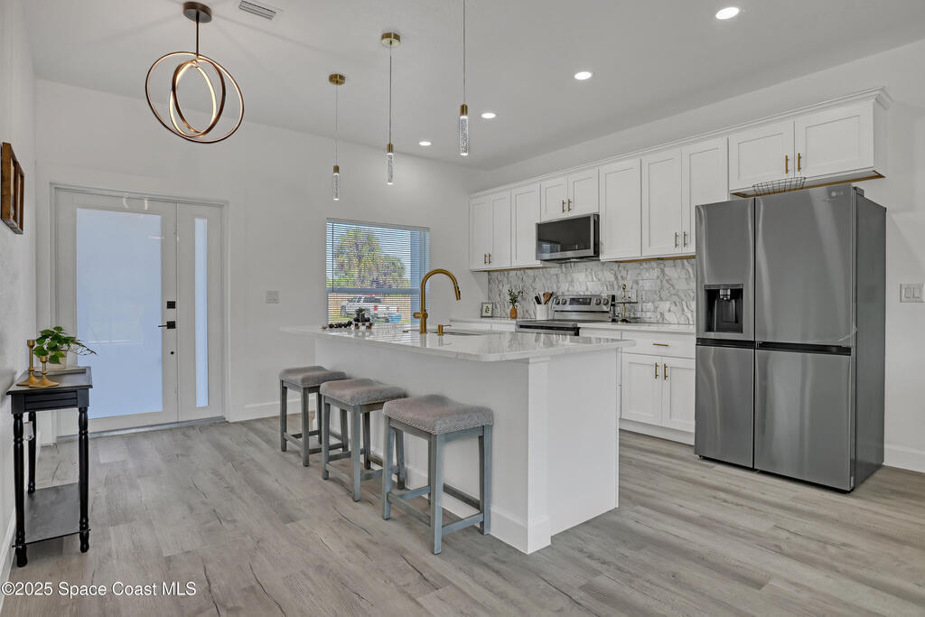 Buyer CLOSING COST CONCESSIONS AVAILABLE!!! Welcome to this beautifully crafted, brand-new single-story home. With 4 spacious bedrooms and 2 full baths 3CAR GARAGE!, this home is perfect for the growing family or those looking to retire in comfort. Full 3-car garage -- a rarity in new construction at this price point. High-end finishes: vinyl plank flooring, tiled showers, all white plywood cabinetry, and a stylish kitchen backsplash. Impact-rated windows and doors provide peace of mind and durability. 10-foot ceilings elevate the open-concept interior space, creating a light and airy feel. Split-bedroom design with an open floor plan gives privacy and flow for everyday living as well as entertaining. Garage floor has epoxy!! Excellent location just minutes away from the Bayside Lakes area, key amenities including a supermarket (Publix), high school and more