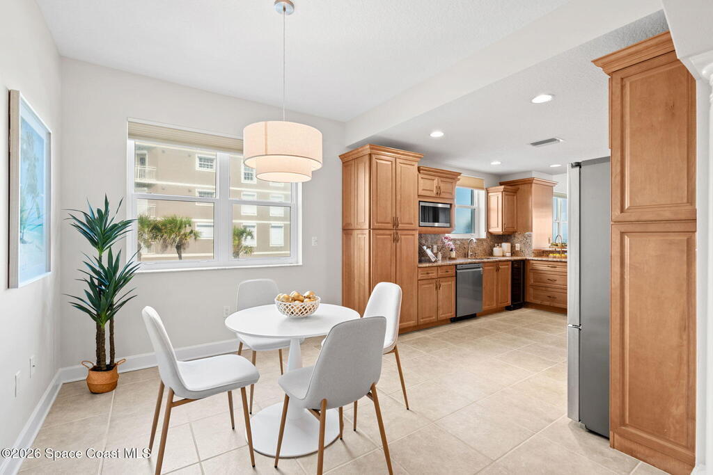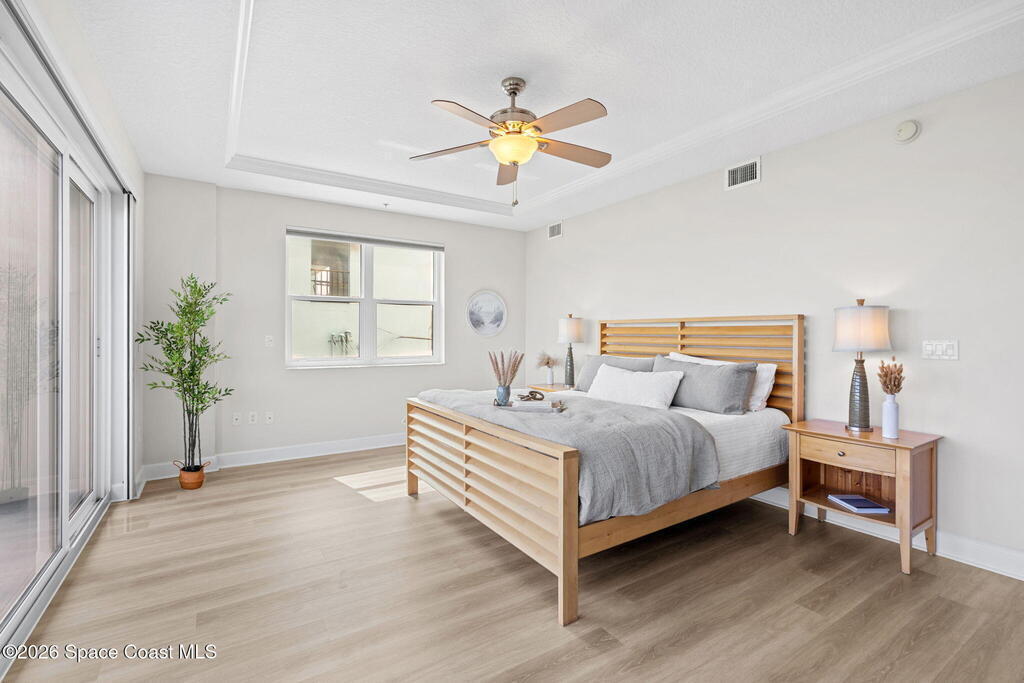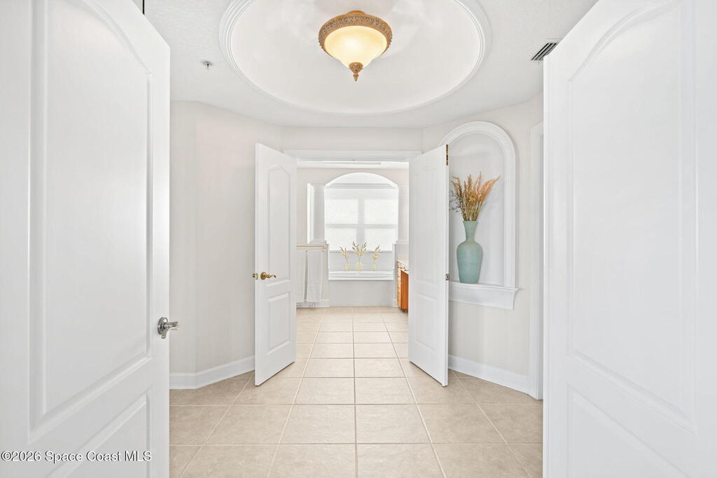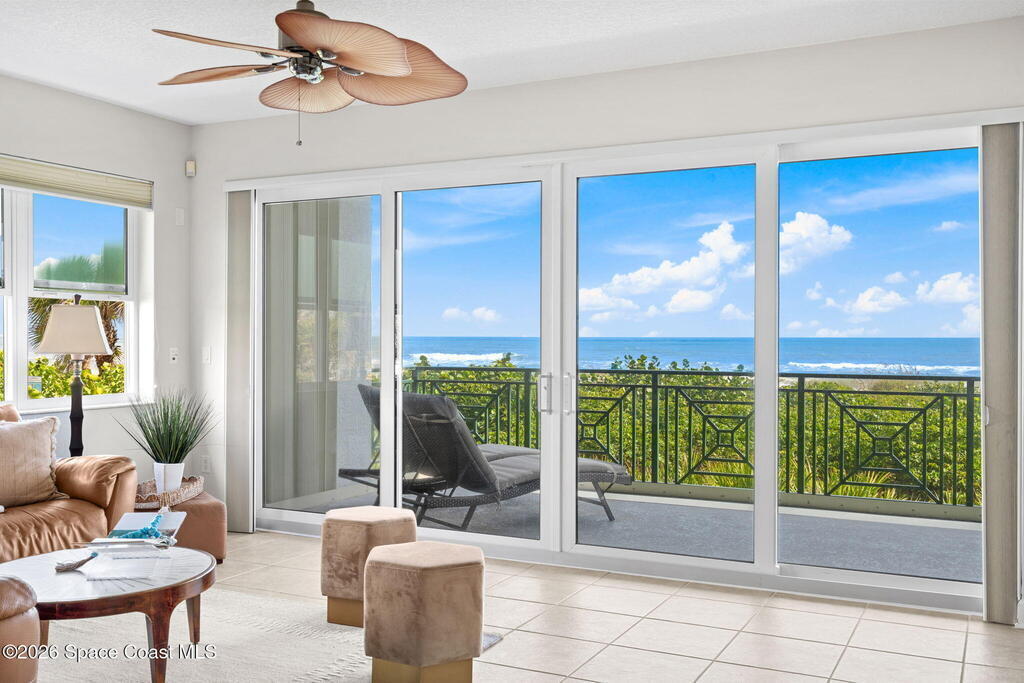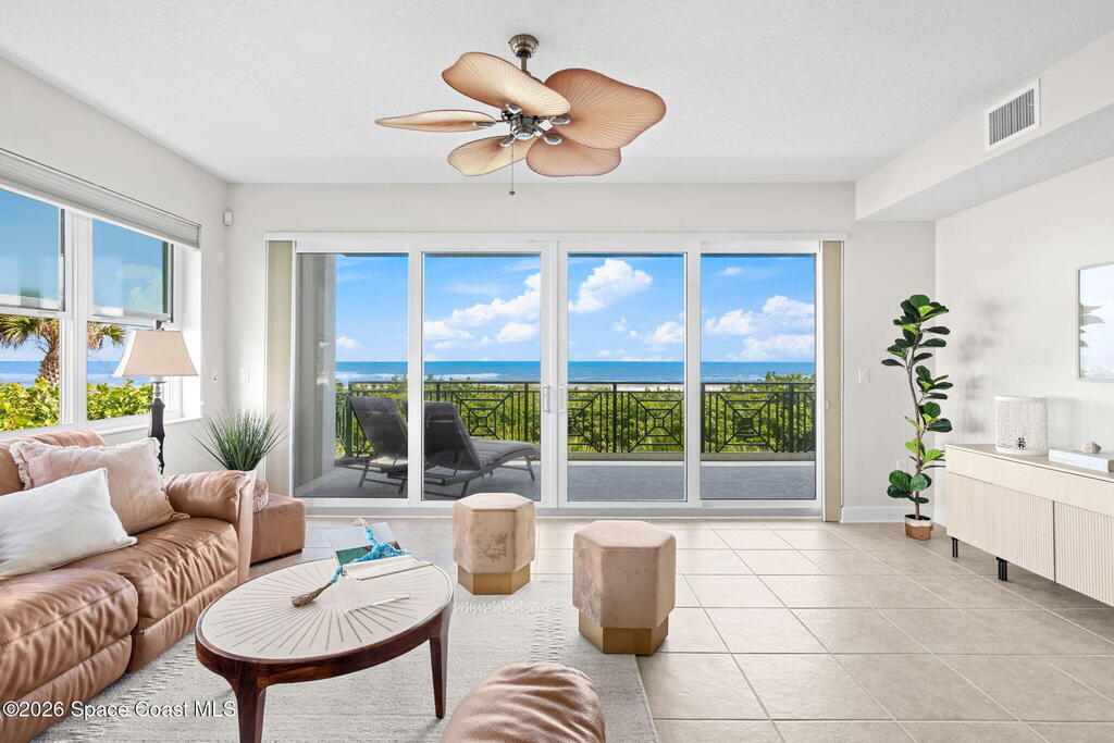 This rare, full-floor residence offers 2, 946 square feet of luxury within a boutique six-unit building. The unparalleled coastal living on the Space Coast in this exquisite oceanfront condo at Riomar where exclusivity meets timeless elegance.This spacious residence features three bedrooms, each with its own ensuite bath, plus an additional guest bathroom.Enjoy 360-degree panoramic views with unforgettable sunrises over the Atlantic Ocean and stunning sunsets over the Indian River.Located on the second floor with private elevator access, this freshly painted residence welcomes you with a beautifully updated interior, including new flooring in all bedrooms. The open-concept layout is anchored by a generous kitchen with custom wood cabinetry, granite countertops, and ample space for entertaining or relaxing in comfort.All doors and windows are hurricane impact-rated throughout. The windows are fitted with electric roll-down shutters,