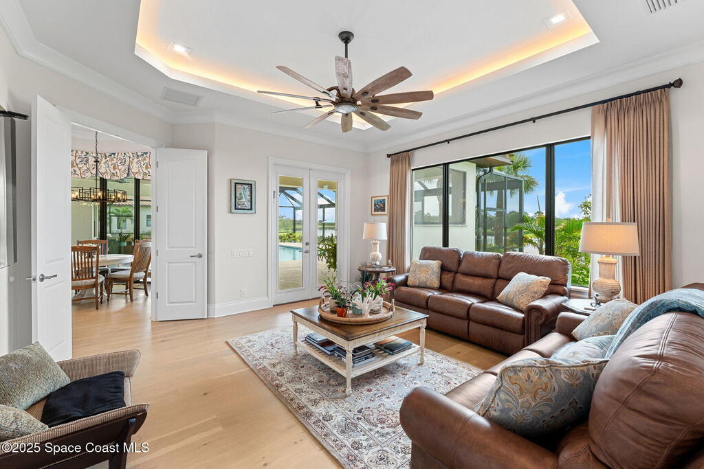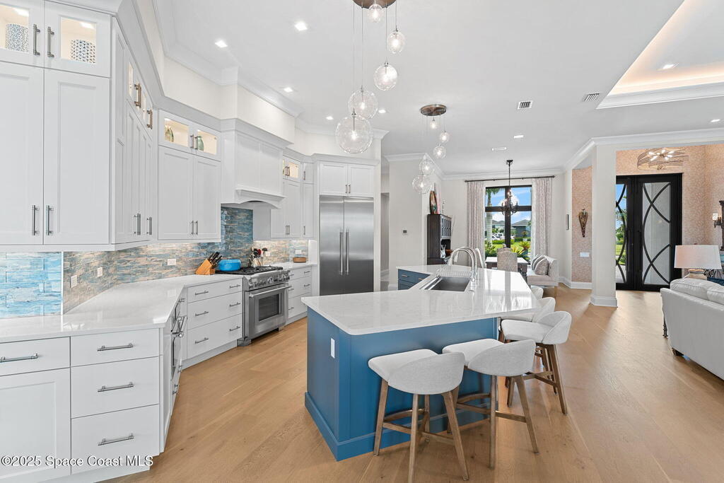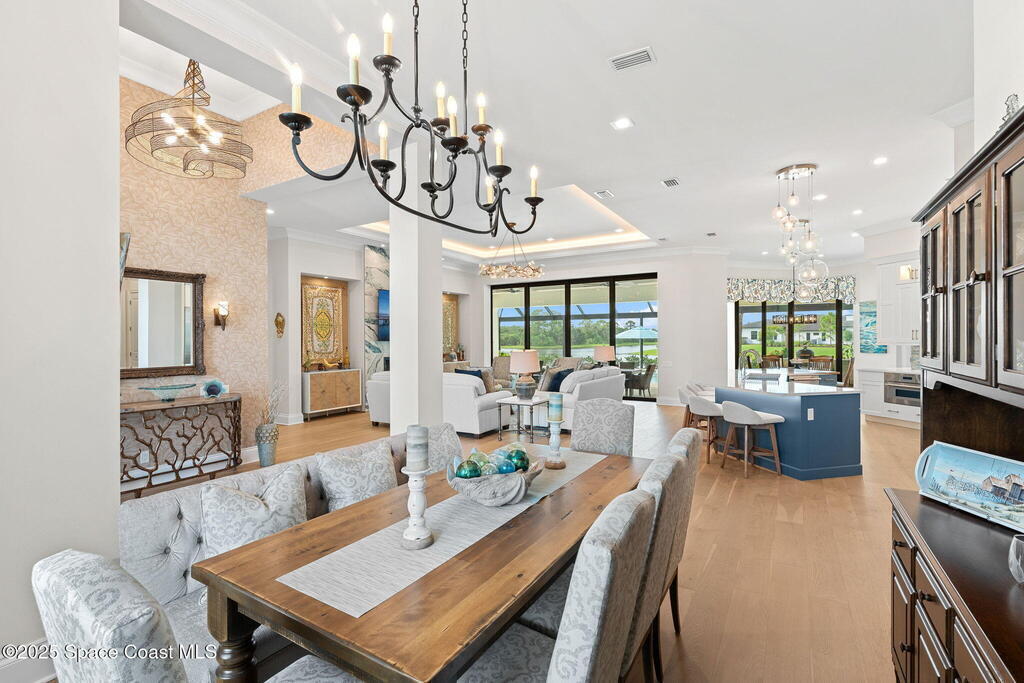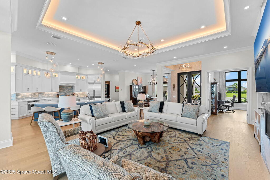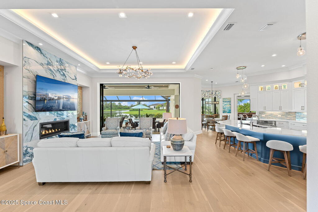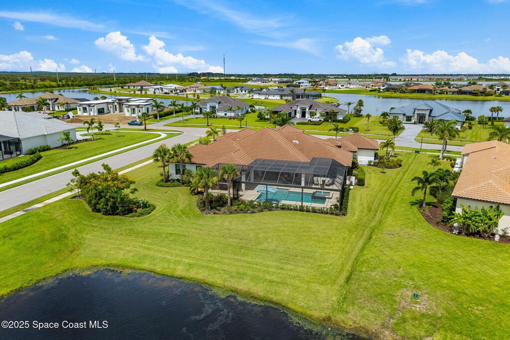 Grand scale & resort living combine in this 4, 222 sq ft custom home on a .70-acre corner lot with breathtaking lake & preserve views. A dramatic 14' foyer with iron double doors opens to oak hardwood floors, soaring ceilings, & walls of glass. The kitchen is a culinary showpiece--quartz counters, custom white cabinetry, Thermador appliances, 6-burner gas range, oversized pantry with coffee bar, & a 52'' stainless sink with dual faucets. Each bedroom offers a private en suite, while the primary suite stuns with dual custom closets & tray ceiling. Living areas center on a porcelain gas fireplace & flexible spaces designed for entertaining or retreat. Step outside to a private paradise: heated saltwater pool, spa, wood-planked lanai, summer kitchen, natural-gas firepit, & picture-panel screening that frames the view. Two oversized 2-car garages, whole-house generator, advanced water systems, & lush landscaping complete this luxury statement.