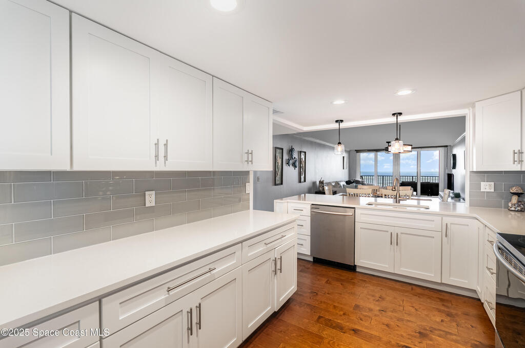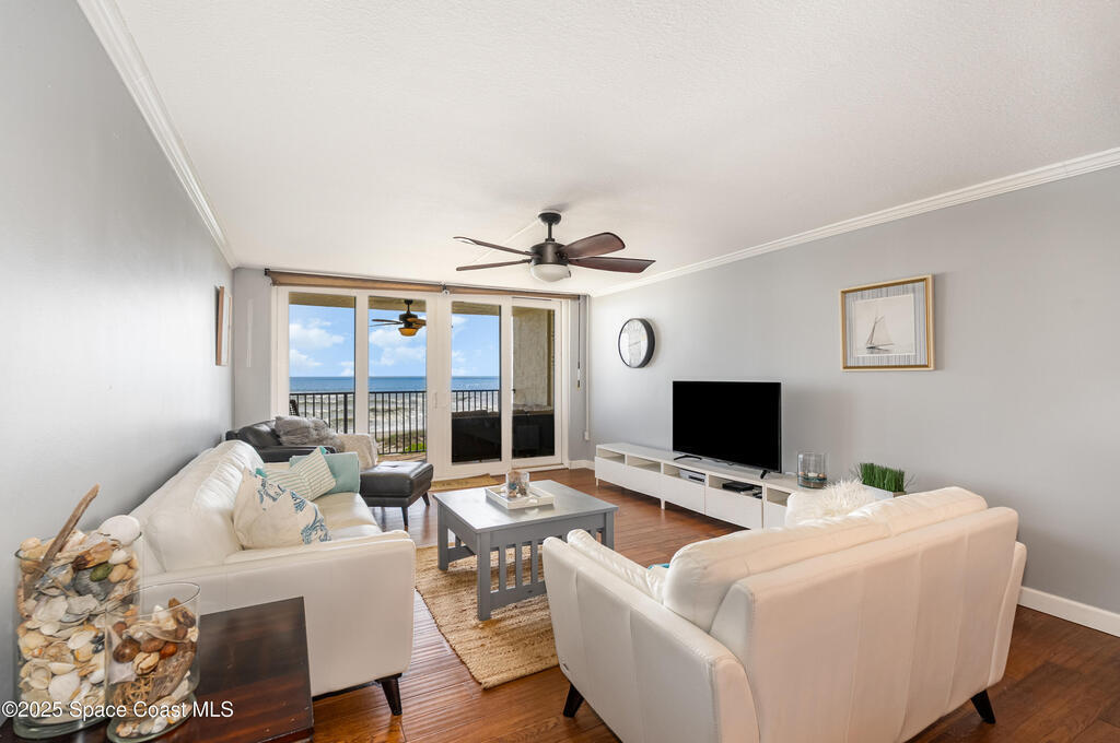 Direct OCEANFRONT condo in South Cocoa Beach with the RARE bonus of river access across the street. This 2BR/2BA unit (sold fully furnished) offers 1, 350 SF under air & a remodeled kitchen with quartz countertops, stainless steel appliances, soft-close cabinetry, & recessed lighting. Other upgrades include impact sliders (2019), plantation shutters, a tankless hot water heater, & HVAC (2021). Primary suite features balcony access, dual vanities, a walk-in shower, & two walk-in closets. Enjoy sunrise views from the covered balcony, a heated oceanfront pool & spa, private beach access, & sunsets from the dock. All major pofects completed: concrete & balcony restoration (2019) & pool resurfacing (2023). Extras include garage parking #C21 with storage cage, in-unit laundry, secured lobby/elevators & community room. HOA covers cable, internet, water, sewer & trash. Pet-friendly (2 pets, no weight limit!) & 6-month rental minimum. A perfect coastal retreat for full-time or seasonal living!