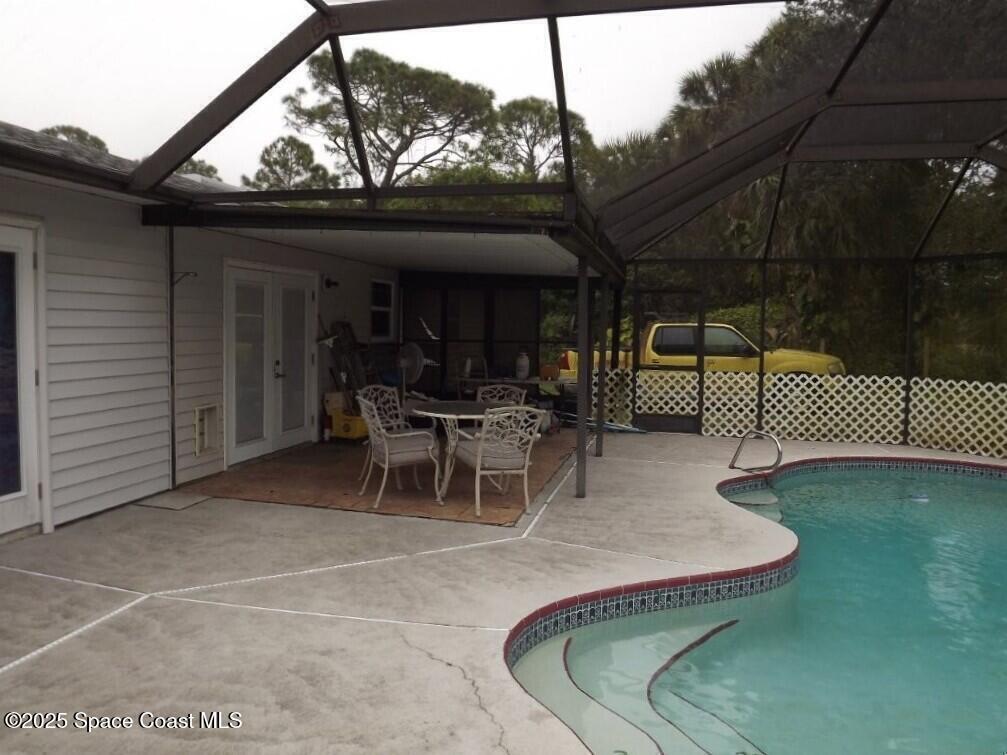 ENJOY PRIVACY GALORE IN THIS AFFORDABLE POOL HOME READY FOR A LITTLE TLC! VAULTED CEILINGS RISE ABOVE THE CLASSIC FLOORPLAN WITH A LIVING/DINING COMBO AND FRENCH DOORS TO THE POOL. THE OPEN KITCHEN FEATURES AN ISLAND WITH BREAKFAST BAR SEATING, LIGHT WOOD CABINETRY, BACKSPLASH, AND GRANITE COUNTERTOPS. BEDROOMS ARE AMPLE IN SIZE AND THE MASTER BATH OFFERS A TILED WALK-IN SHOWER AND DOUBLE VANITIES. EASY-CARE LAMINATE THROUGHOUT WITH TILE IN THE BATHS. STEP OUT TO THE PRIVATE, SCREENED POOL AREA WITH A LARGE COVERED PATIO PERFECT FOR GRILLING AND GATHERING. EXTRA SPACE SEPARATES THIS HOME FROM THE ADJACENT NEIGHBORS AS THEY OWN MULTIPLE LOTS. THERE IS ALSO A CANAL BEHIND WITH WOODED VIEW. THE ROOF IS 2020 PER CITY PERMITTING. AGE OF AC AND WATER HEATER UNKNOWN. GREAT OPPORTUNITY TO MAKE THIS CHARMING POOL HOME YOURS OR FOR YOUR NEXT INVESTMENT PROPERTY!