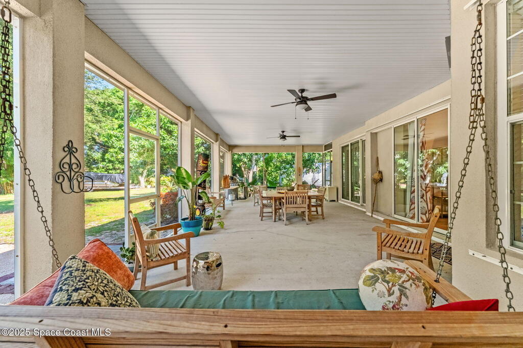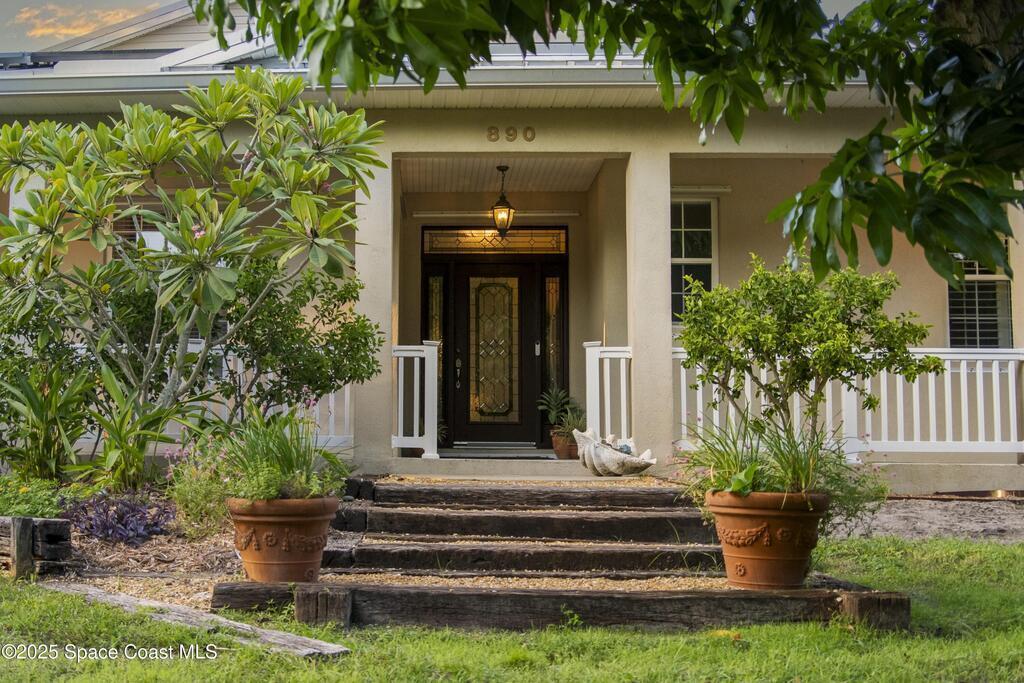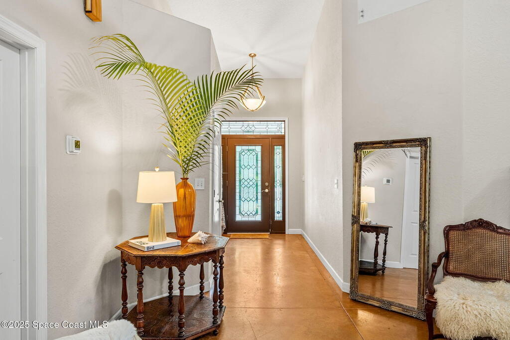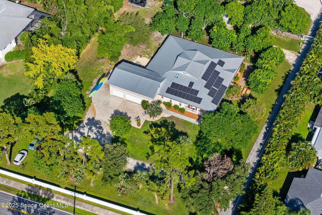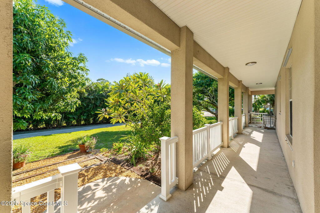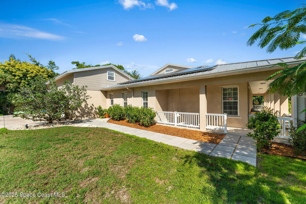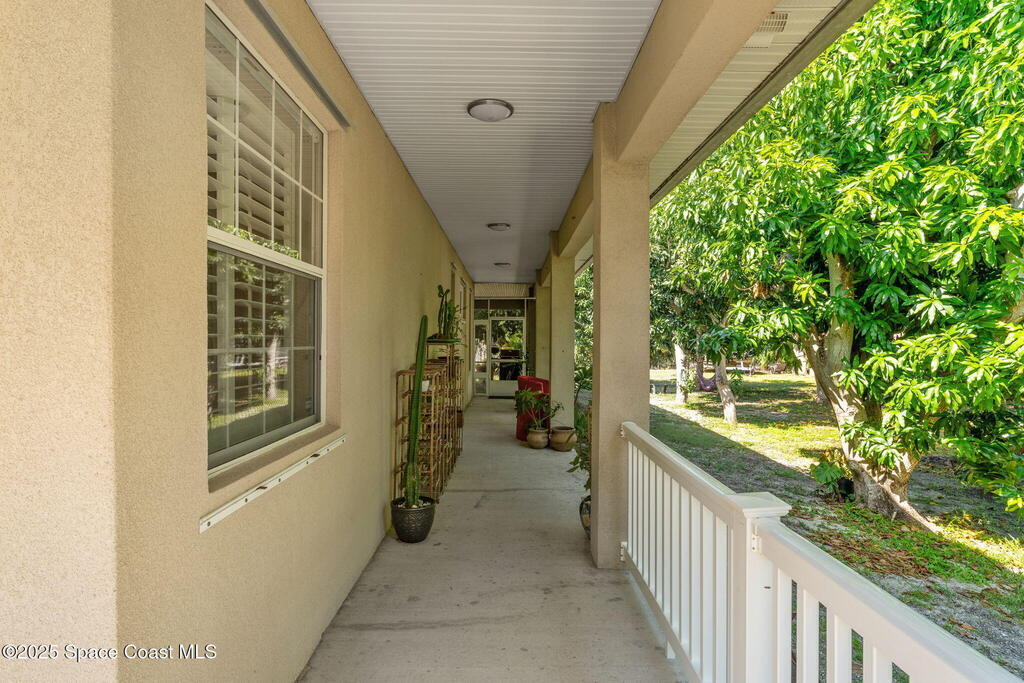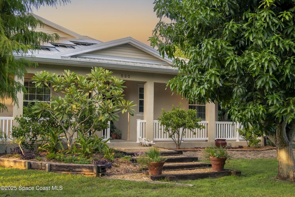 Your Florida homestead dream lives here. Architect designed and centered on a private one acre lot. This Merritt Island residence blends utility and style. 3, 707 sq. ft. with 4 bedrooms, 3 baths, office, bonus game room and a 3 car garage. Durable painted concrete floors and a cook friendly corian kitchen with custom solid oak cabinetry. Outdoor living with a screened lanai and a wraparound porch under a metal roof. Practical upgrades include hurricane shutters, a whole house vacuum, a whole house attic fan, solar panels, and 50 amp service for your RV, EV, or tools. The orchard steals the show with mango, dragon fruit, avocados, and limes. Minutes to beaches, shops, and schools yet tucked away. All information deemed reliable but not guaranteed; buyer to verify.