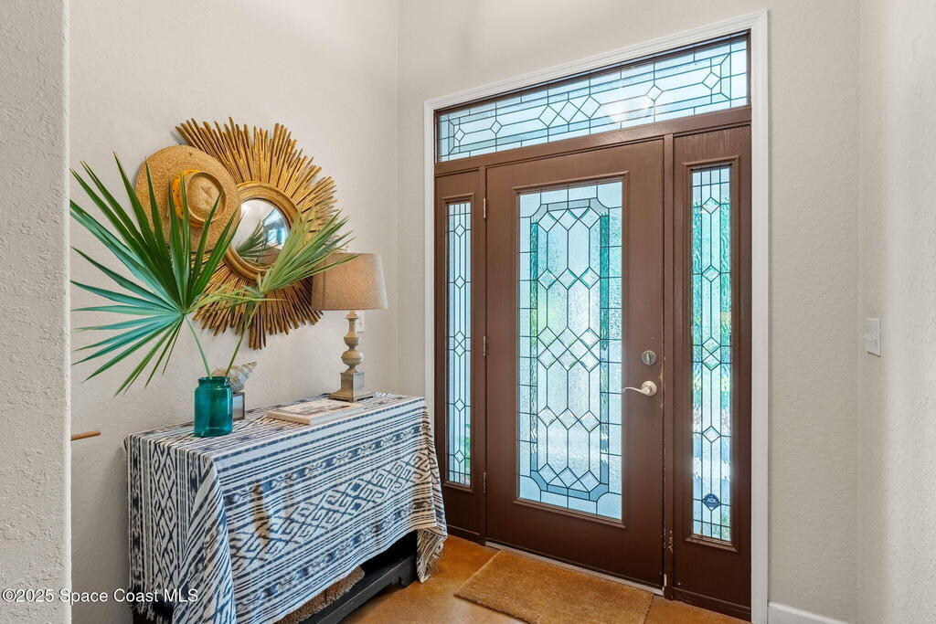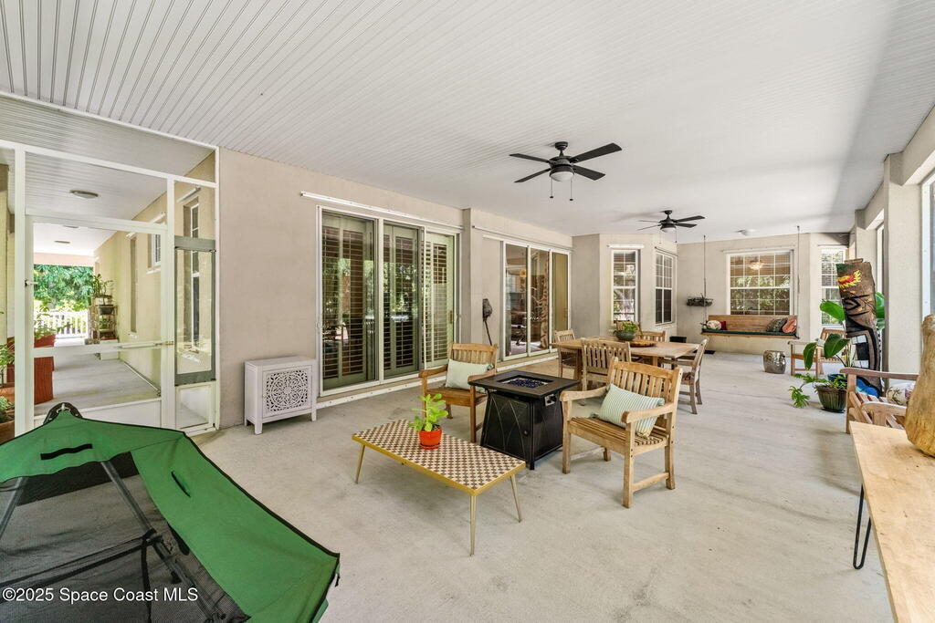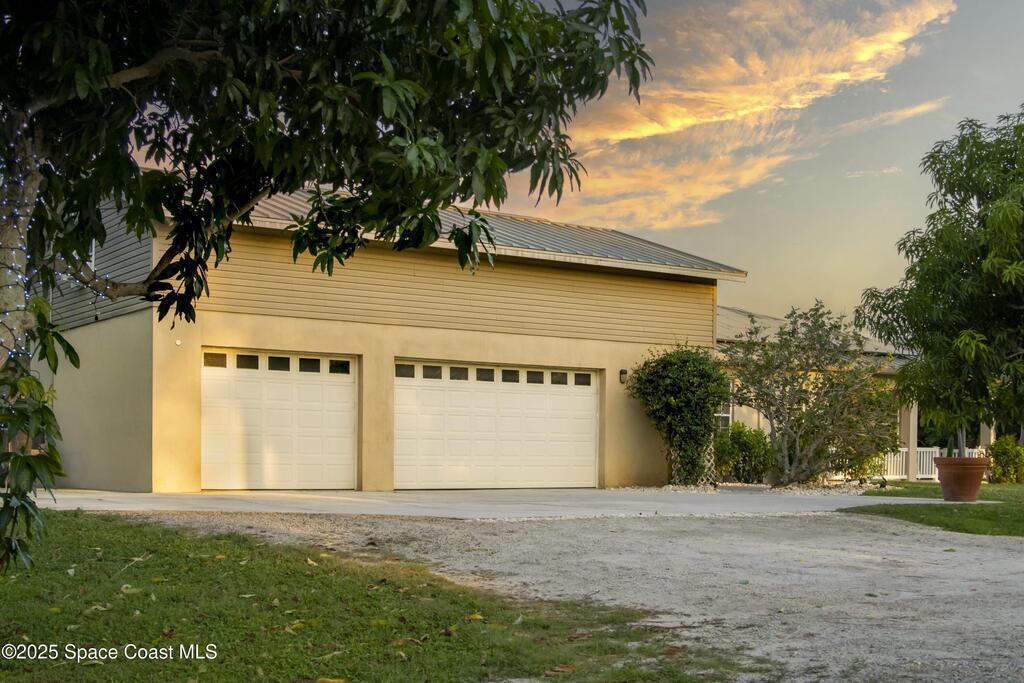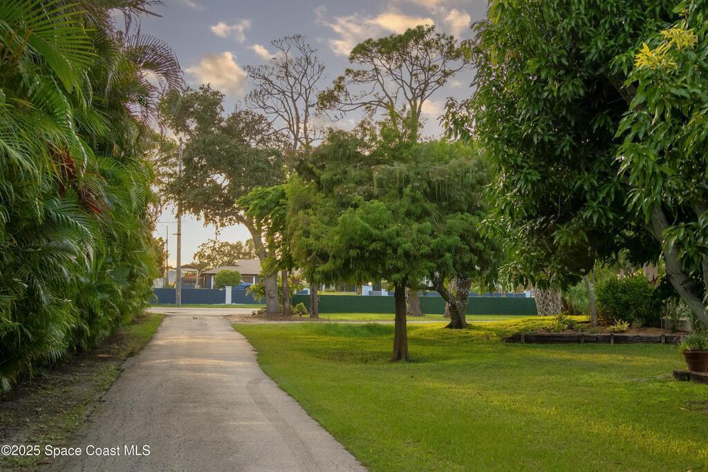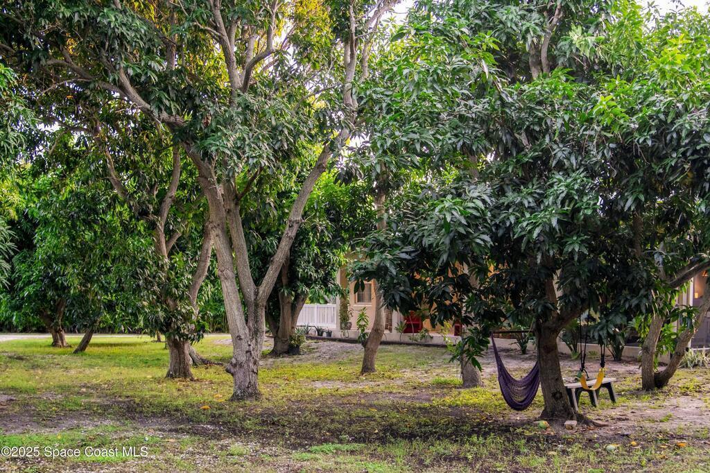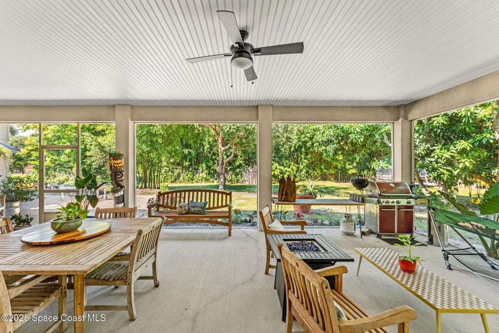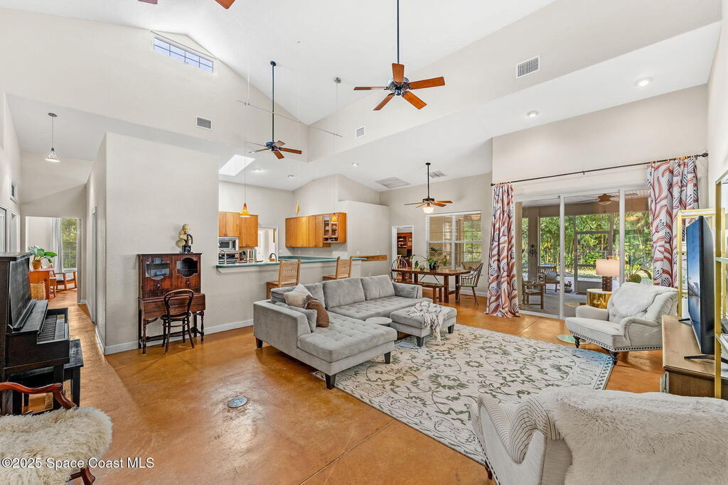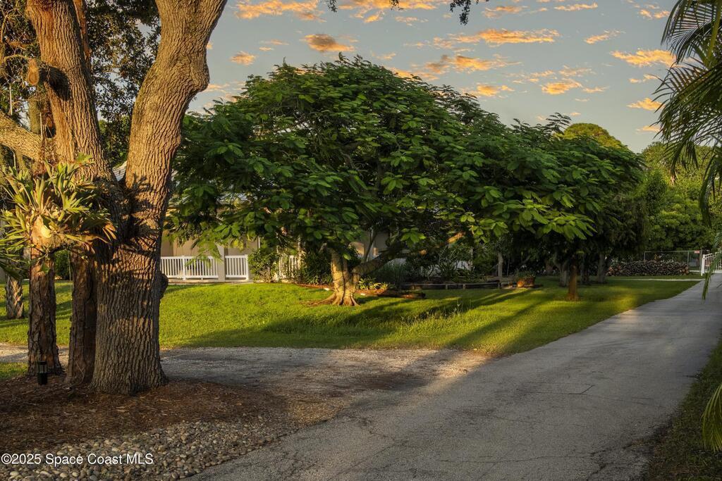Your Florida homestead dream lives here. Architect designed and centered on a private one acre lot. This Merritt Island residence blends utility and style. 3, 707 sq. ft. with 4 bedrooms, 3 baths, office, bonus game room and a 3 car garage. Durable painted concrete floors and a cook friendly corian kitchen with custom solid oak cabinetry. Outdoor living with a screened lanai and a wraparound porch under a metal roof. Practical upgrades include hurricane shutters, a whole house vacuum, a whole house attic fan, solar panels, and 50 amp service for your RV, EV, or tools. The orchard steals the show with mango, dragon fruit, avocados, and limes. Minutes to beaches, shops, and schools yet tucked away. All information deemed reliable but not guaranteed; buyer to verify.