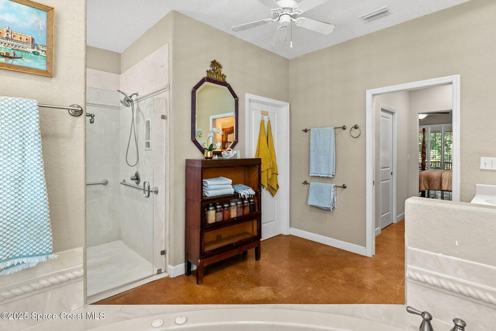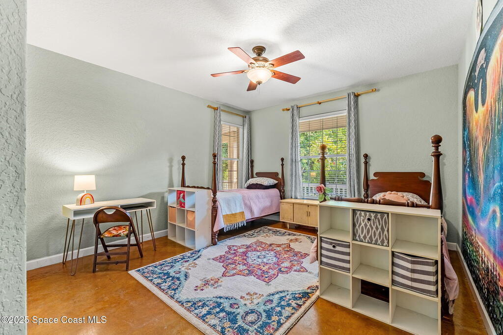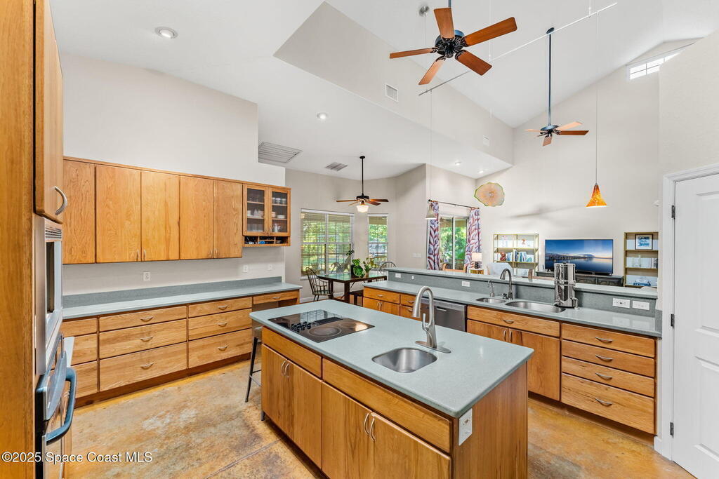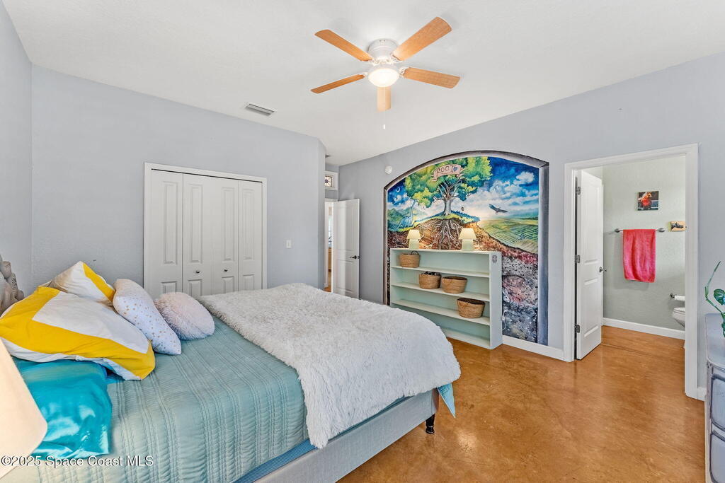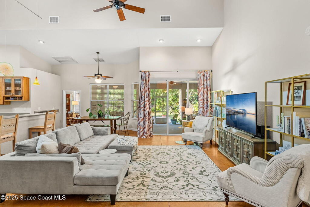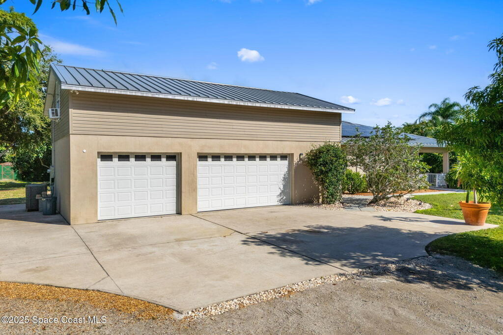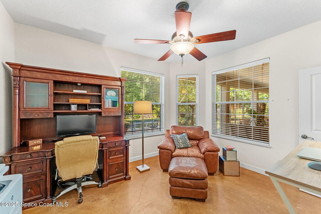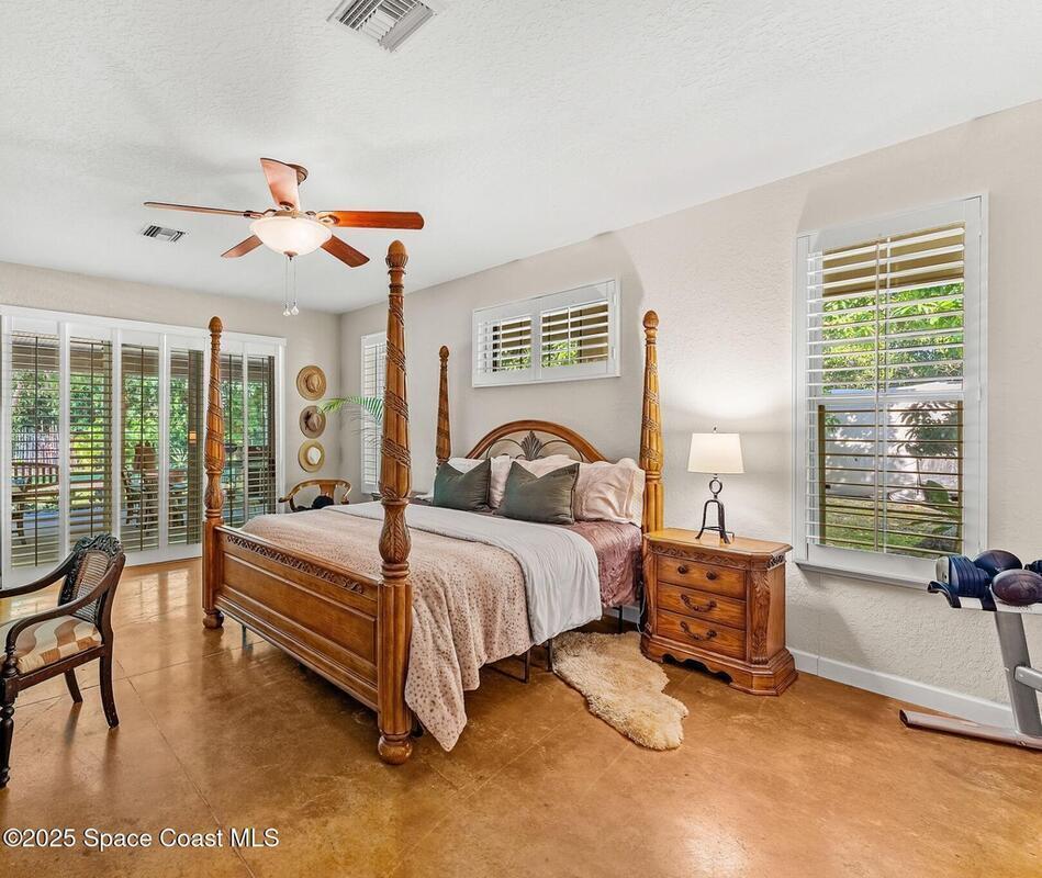 Your Florida homestead dream lives here. Architect designed and centered on a private one acre lot. This Merritt Island residence blends utility and style. 3, 707 sq. ft. with 4 bedrooms, 3 baths, office, bonus game room and a 3 car garage. Durable painted concrete floors and a cook friendly corian kitchen with custom solid oak cabinetry. Outdoor living with a screened lanai and a wraparound porch under a metal roof. Practical upgrades include hurricane shutters, a whole house vacuum, a whole house attic fan, solar panels, and 50 amp service for your RV, EV, or tools. The orchard steals the show with mango, dragon fruit, avocados, and limes. Minutes to beaches, shops, and schools yet tucked away. All information deemed reliable but not guaranteed; buyer to verify.